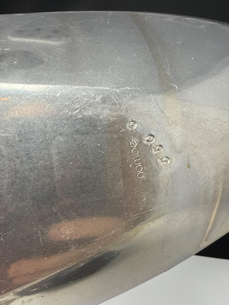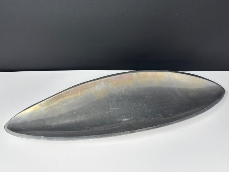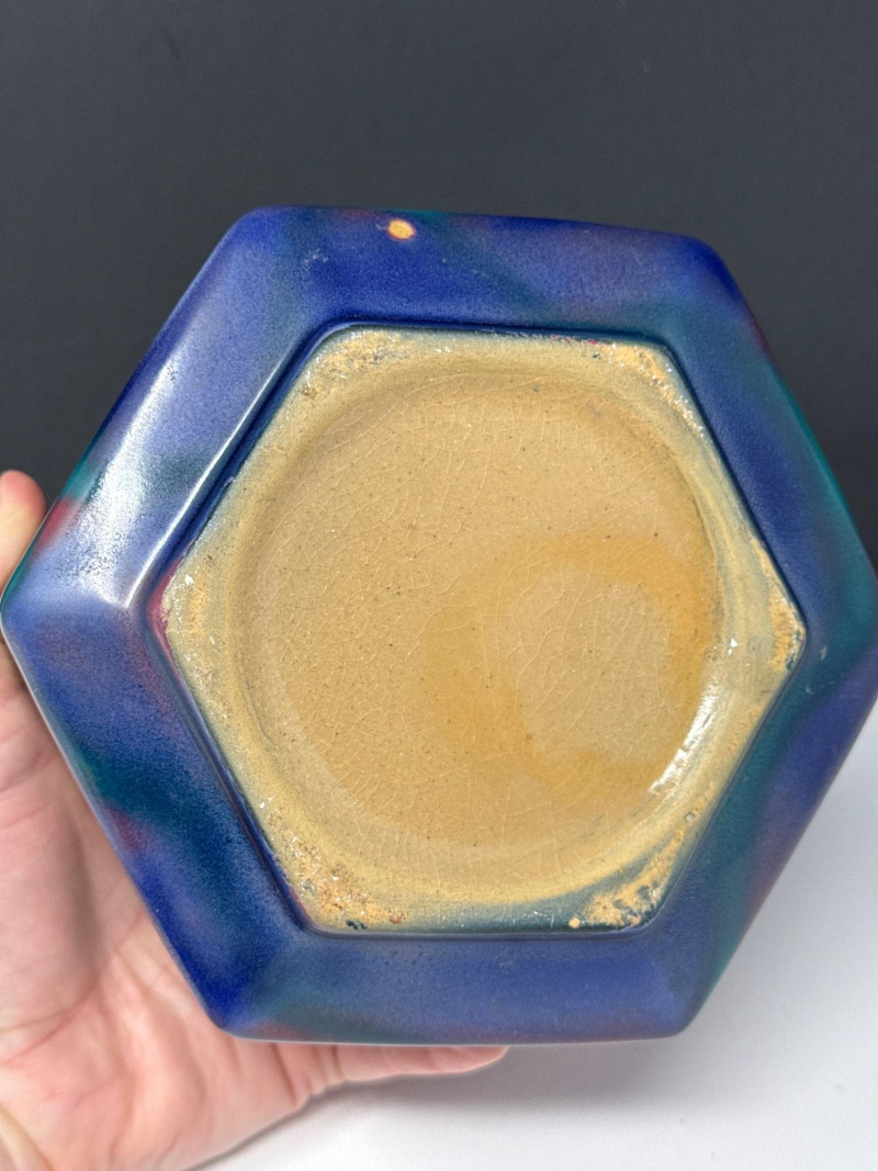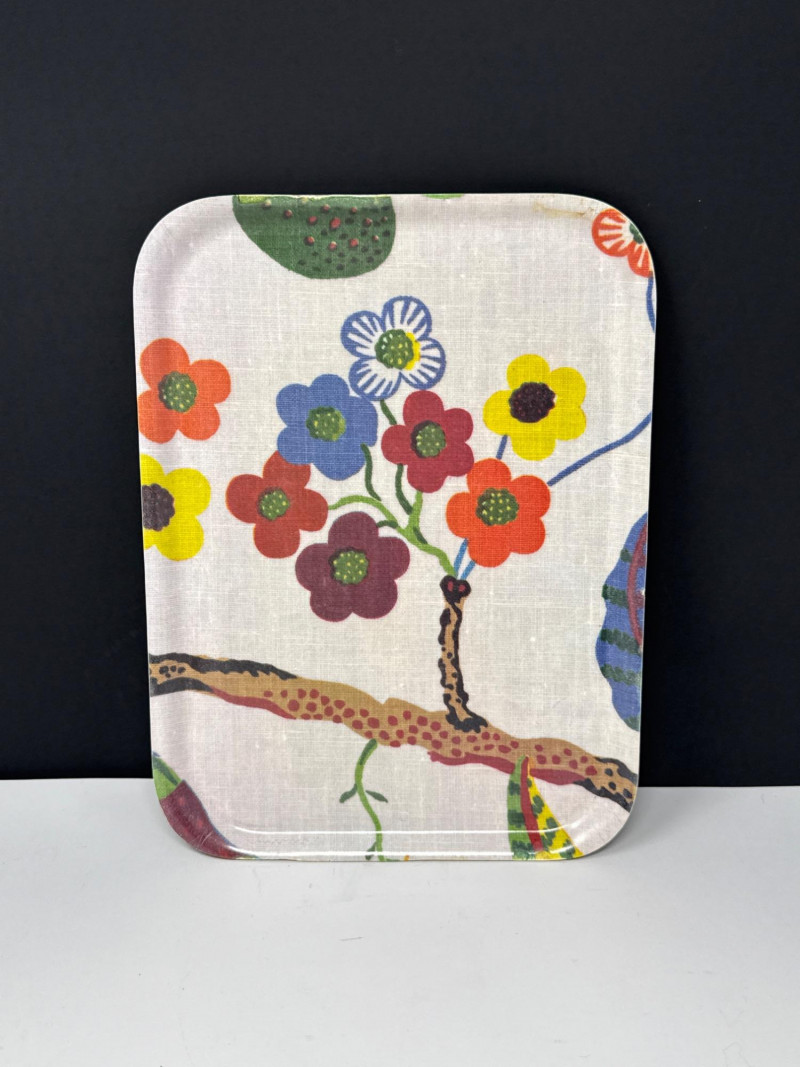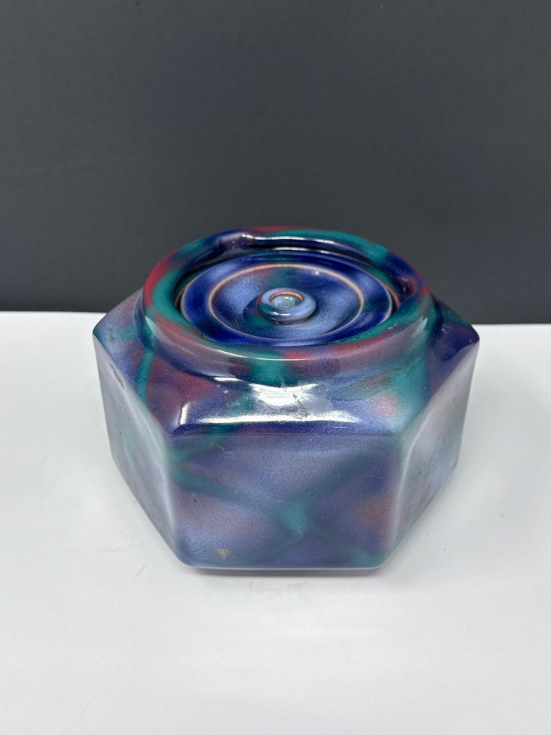 This lot features a sophisticated three-piece collection of vintage decor, blending metallic elegance with artisanal ceramic craftsmanship. The set includes a large silver-tone tray, a smaller Swedish-style patterned tray, and a unique iridescent pottery jar. Large Silver-Tone Tray: A long, sleek serving tray with a polished metallic finish. It measures 19.5” Wide x 6.5” Deep. Swedish Decorative Tray: A rectangular tray featuring a vibrant floral and botanical pattern. It measures 10.25” x 7.75”. Iridescent Pottery Jar: A hexagonal-shaped jar with a stunning metallic, iridescent glaze that shifts in color. It includes a matching lid and measures 6.25” Wide x 4” Height.Item Details: