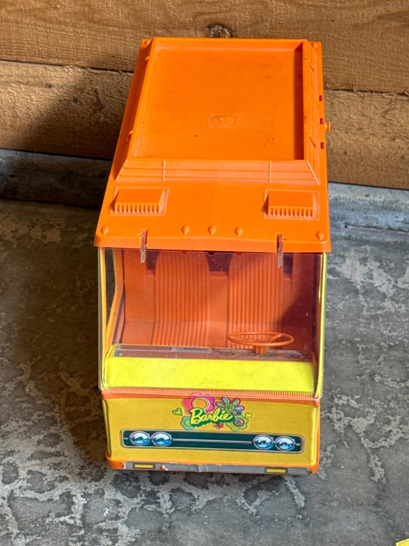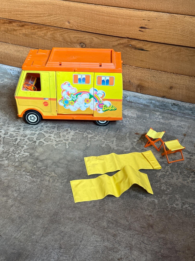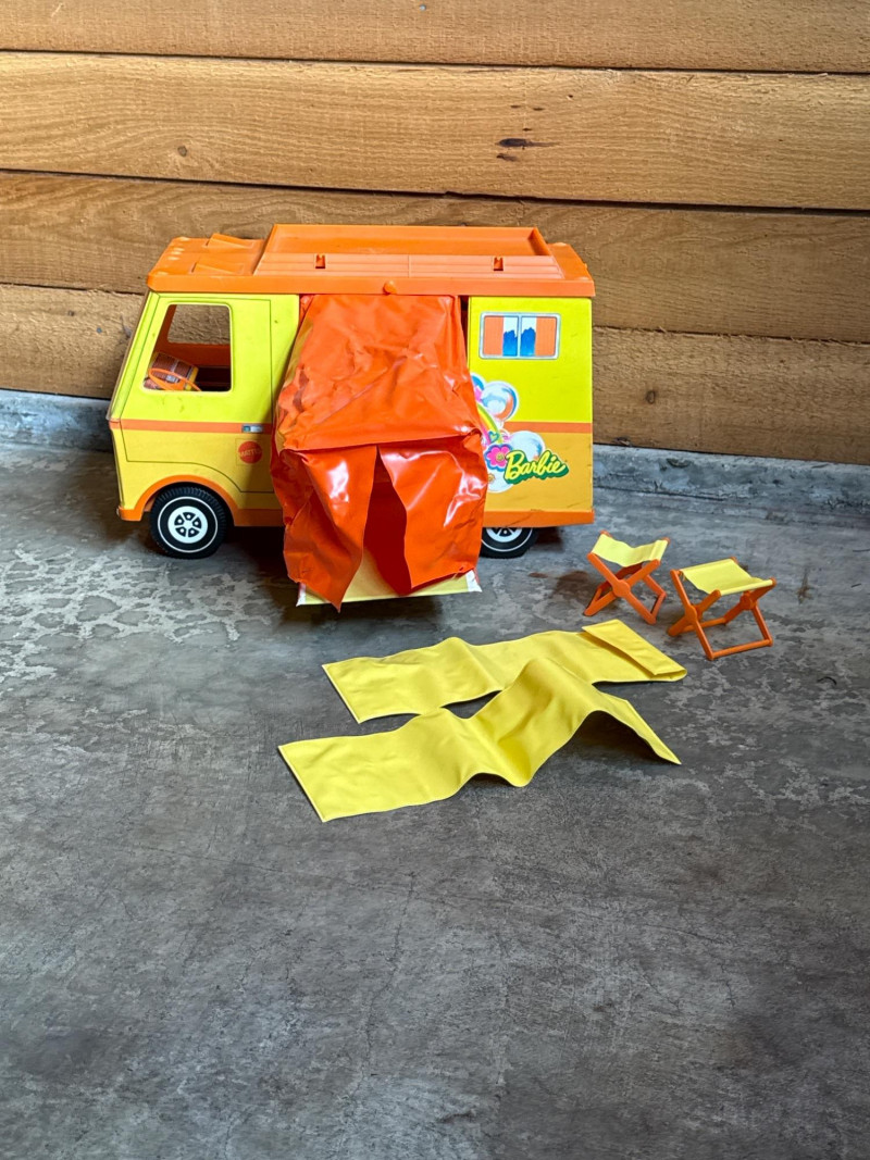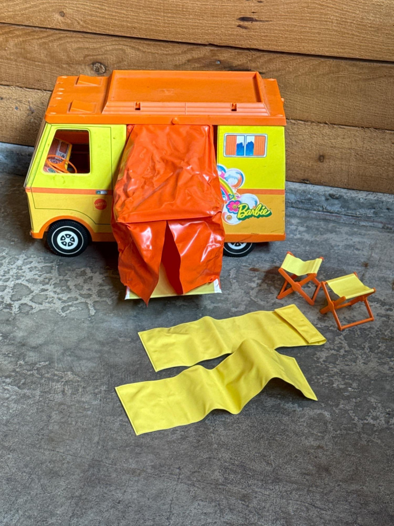 This vintage 1970 Barbie Country Camper RV is a nostalgic centerpiece for any Mattel collection, featuring the classic bright orange and yellow color scheme. This large-scale vehicle unfolds to reveal a multi-functional living space, complete with a pop-out tent and original camping accessories such as miniature folding chairs and sleeping bags. Measuring approximately 19 inches long by 12 inches high, this durable plastic playset perfectly captures the outdoor adventure aesthetic of the era. While it shows typical signs of vintage play, it remains a highly sought-after item for those looking to recreate iconic Barbie road trip memories. *good vintage condition. Tent attachment with side door seems to have a couple stitches loose.