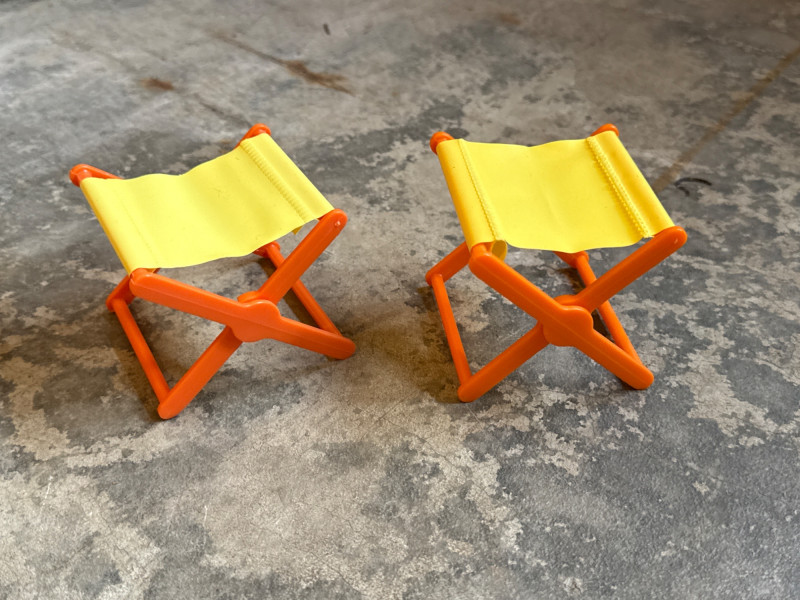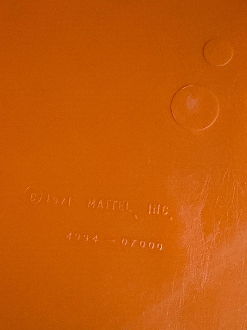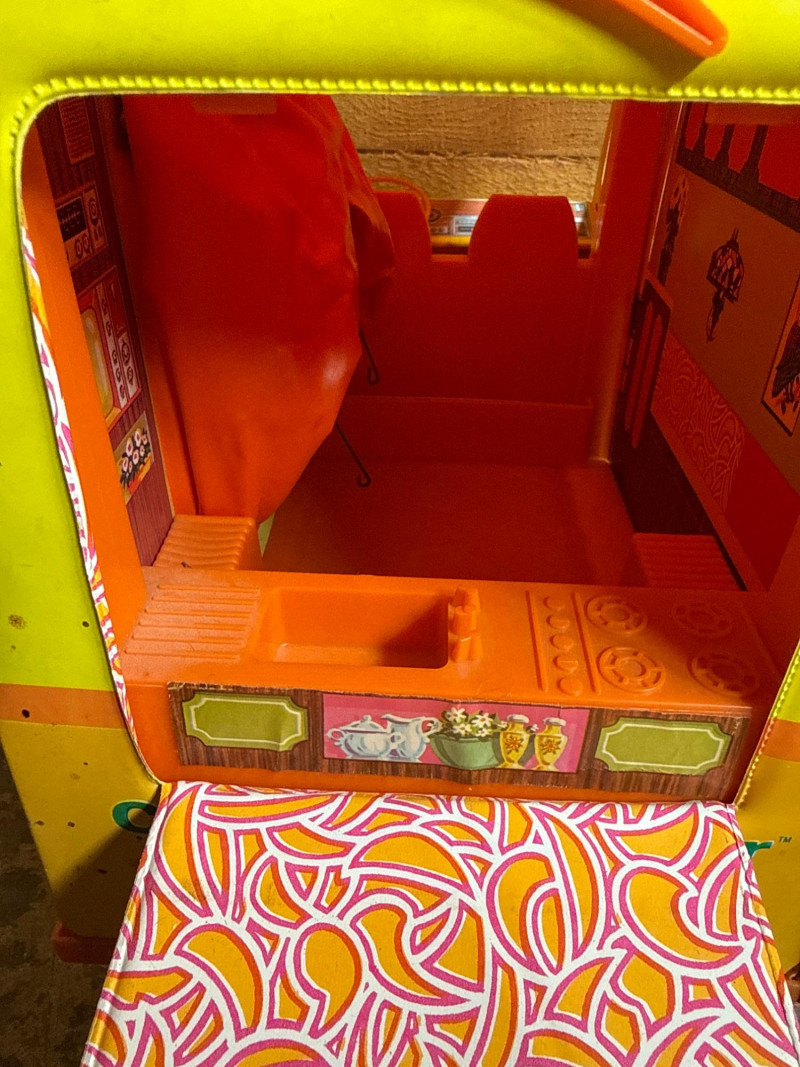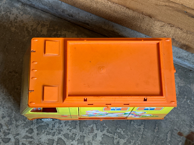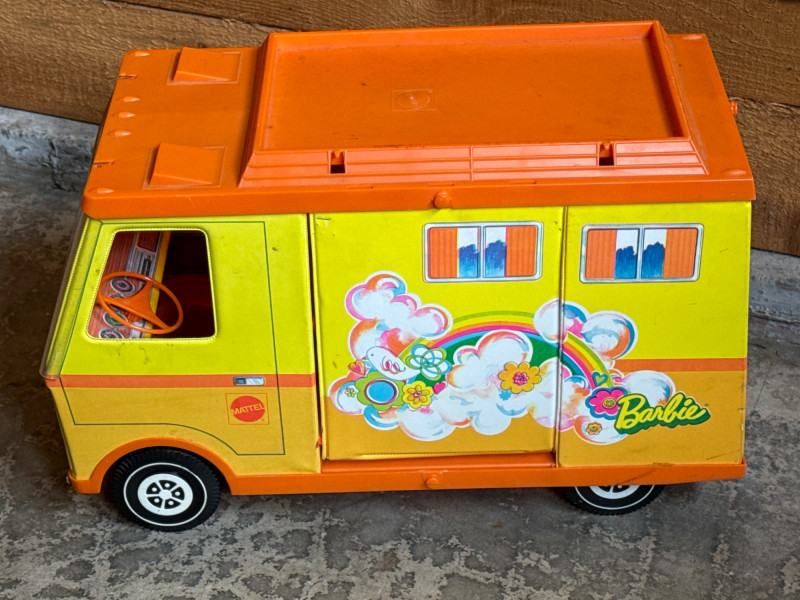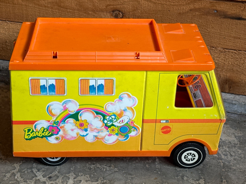 This vintage 1970 Barbie Country Camper RV is a nostalgic centerpiece for any Mattel collection, featuring the classic bright orange and yellow color scheme. This large-scale vehicle unfolds to reveal a multi-functional living space, complete with a pop-out tent and original camping accessories such as miniature folding chairs and sleeping bags. Measuring approximately 19 inches long by 12 inches high, this durable plastic playset perfectly captures the outdoor adventure aesthetic of the era. While it shows typical signs of vintage play, it remains a highly sought-after item for those looking to recreate iconic Barbie road trip memories. *good vintage condition. Tent attachment with side door seems to have a couple stitches loose.