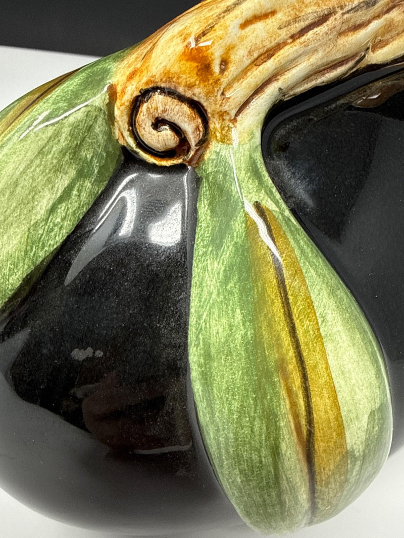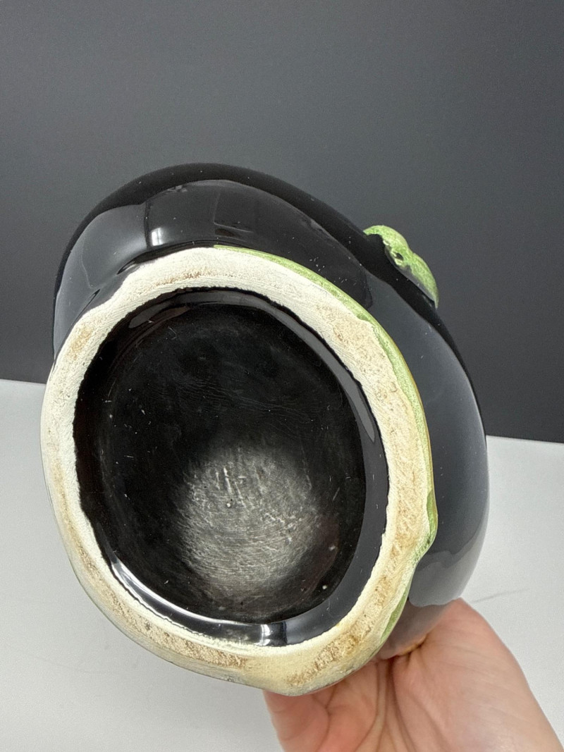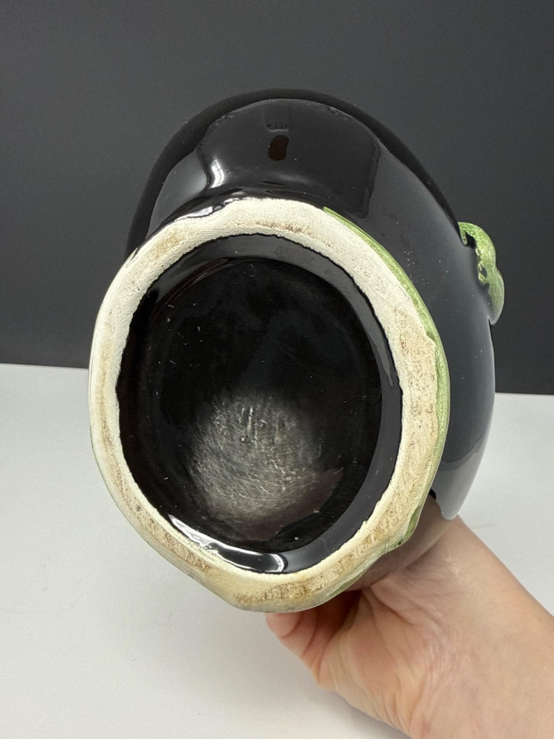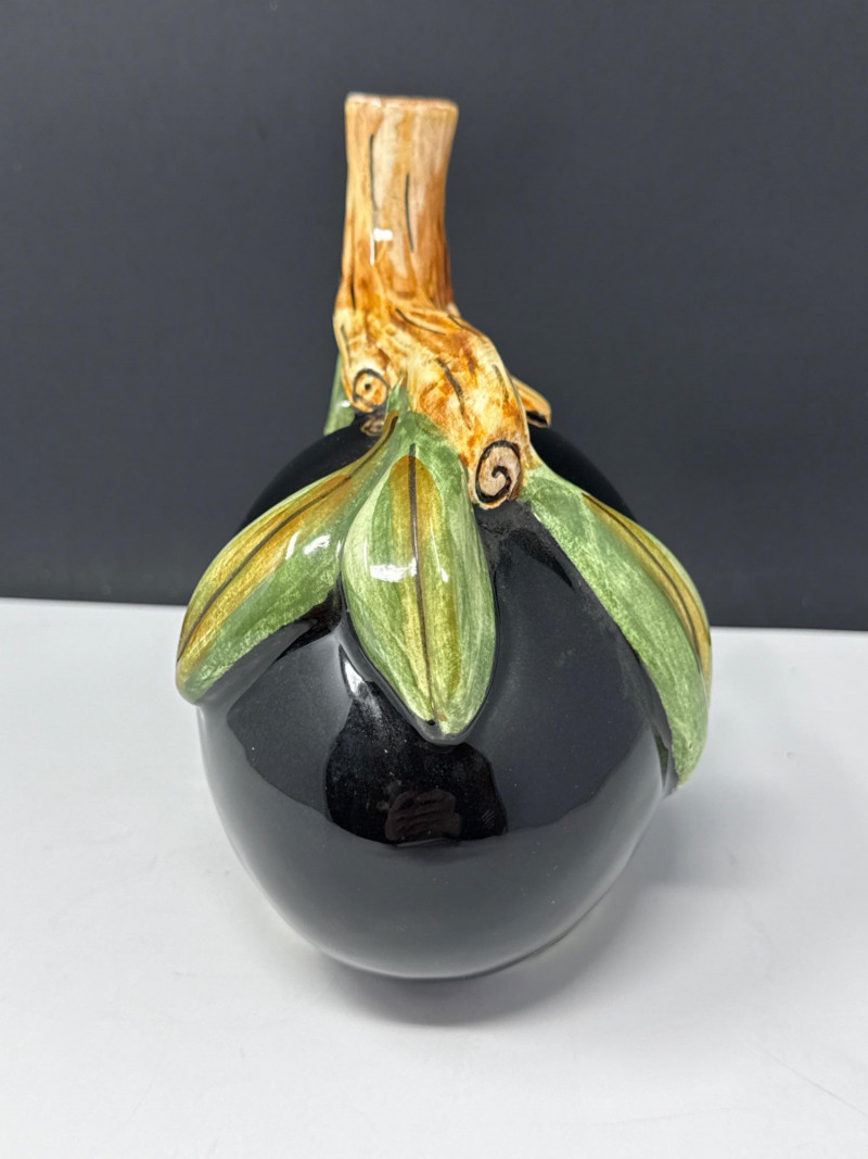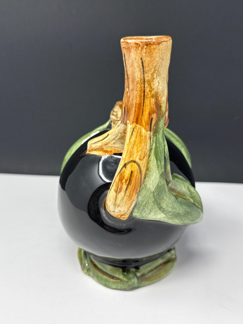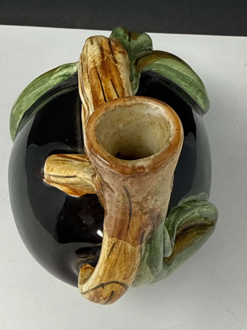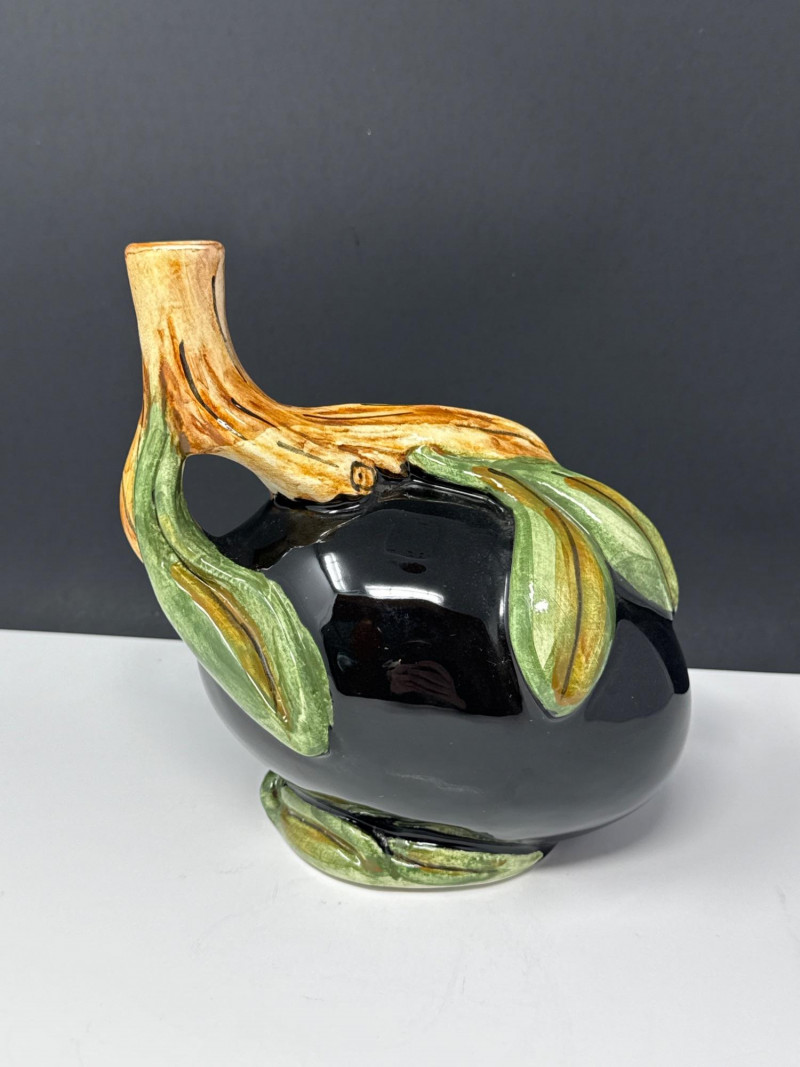This vintage Italian Majolica olive oil decanter is a stunning example of artisanal ceramic craftsmanship, featuring a bold, spherical body finished in a high-gloss black glaze. The vessel is beautifully accented with an embossed olive branch design, showcasing vibrant green leaves and ripening olives that wrap around the piece and form a naturalistic, branch-style handle. Standing approximately 7.5 inches tall, this decorative cruet combines Mediterranean rustic charm with a sleek, mid-century aesthetic. Authenticity: This is a classic piece of Italian Majolica, known for its historical tin-glazing technique and intricate sculptural details. Maintenance: The decanter is currently without its original stopper and will need a cork for functional use. Dimensions: The piece measures 7" L x 5" W x 7.5" H, making it a perfect size for a kitchen counter display or a vintage pottery collection. *it does need a cork for stopperCondition & Notes: