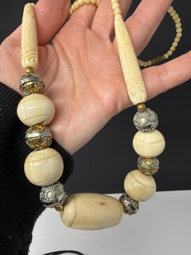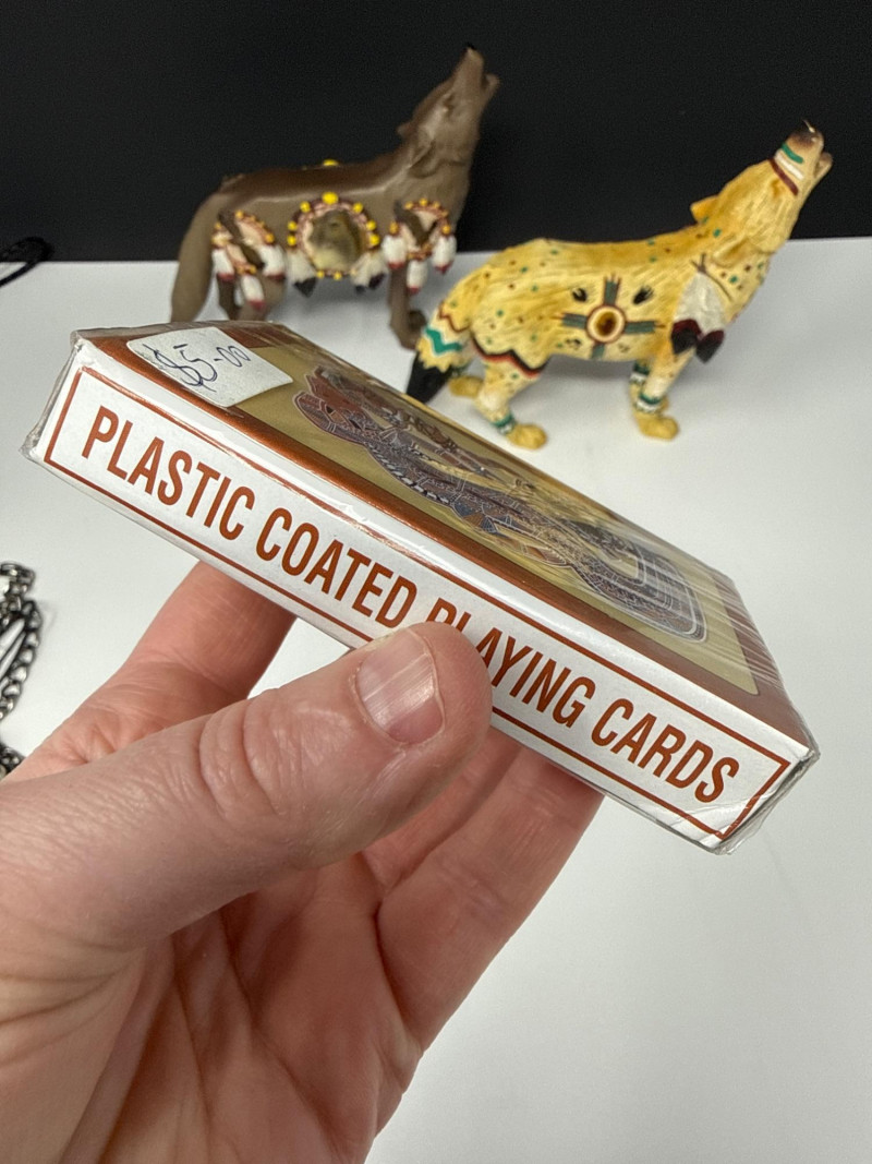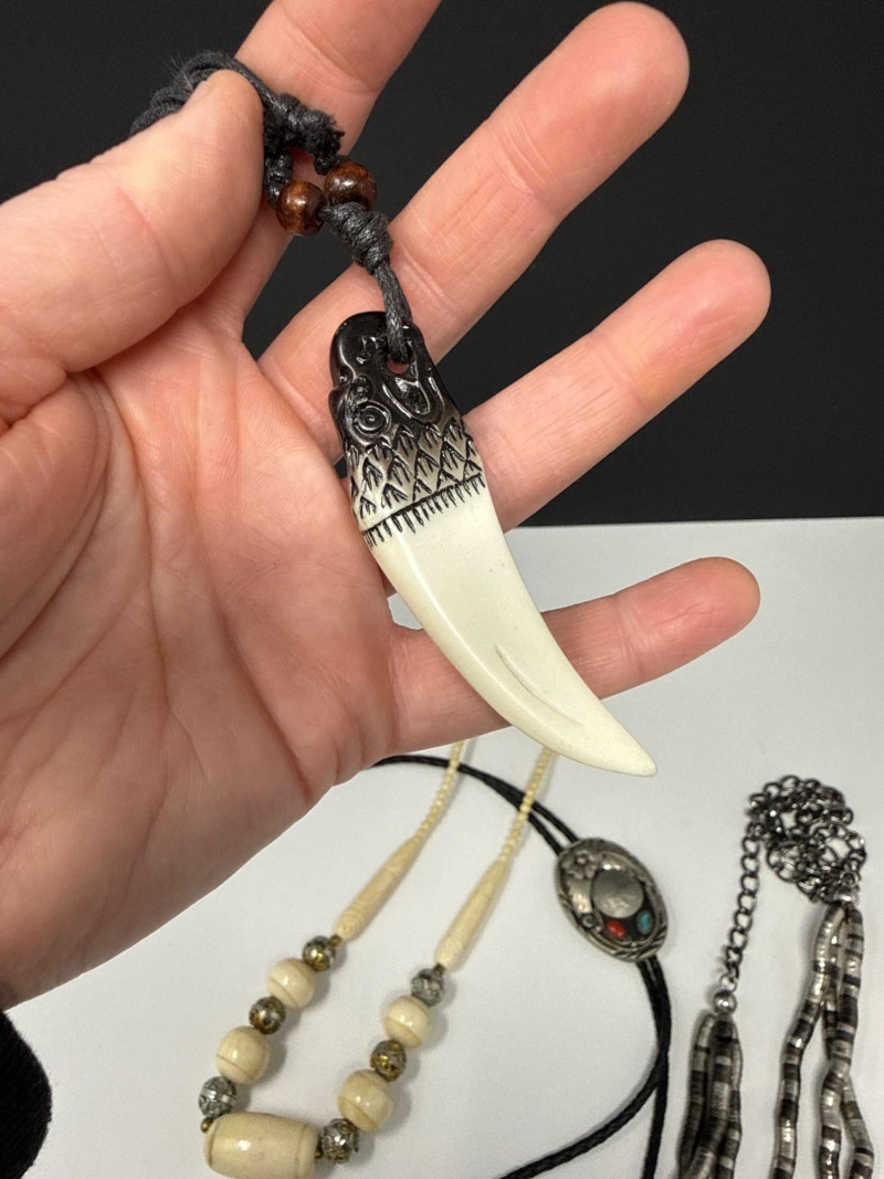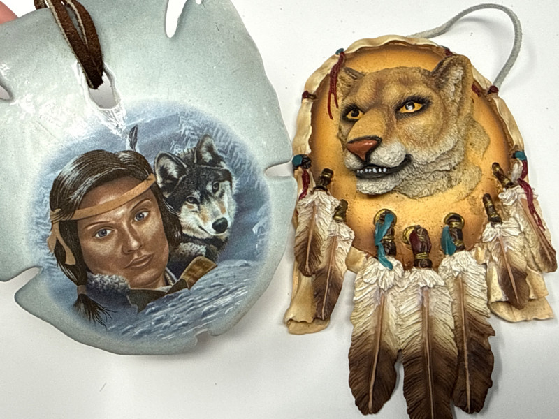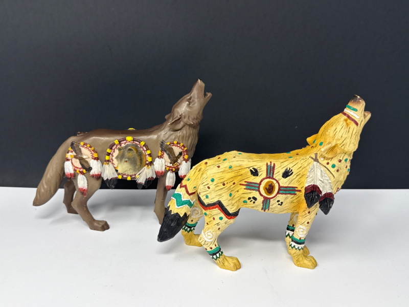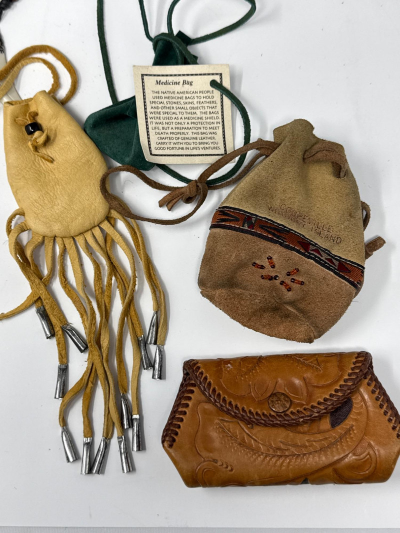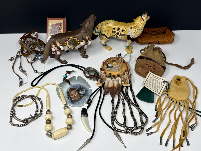 This eclectic collection features a diverse array of Native American-inspired jewelry and decor, showcasing traditional artisanal techniques and materials. The lot includes hand-stitched leather pouches with fringed detailing, several beaded necklaces, and unique animal spirit figurines, including a wolf and a cougar. A notable highlight is the variety of natural bone or stone accents that bring a rustic, spiritual energy to the collection. Whether you are a collector of indigenous-style crafts or looking for unique southwestern accents, this multi-piece set offers a rich variety of textures and storied designs. *Wolf figurines measure- 5 3/4 in. long 6 in. tall 2 3/4 in. wide. *please note leg is repaired on one of them.