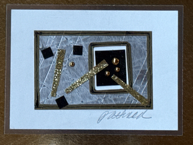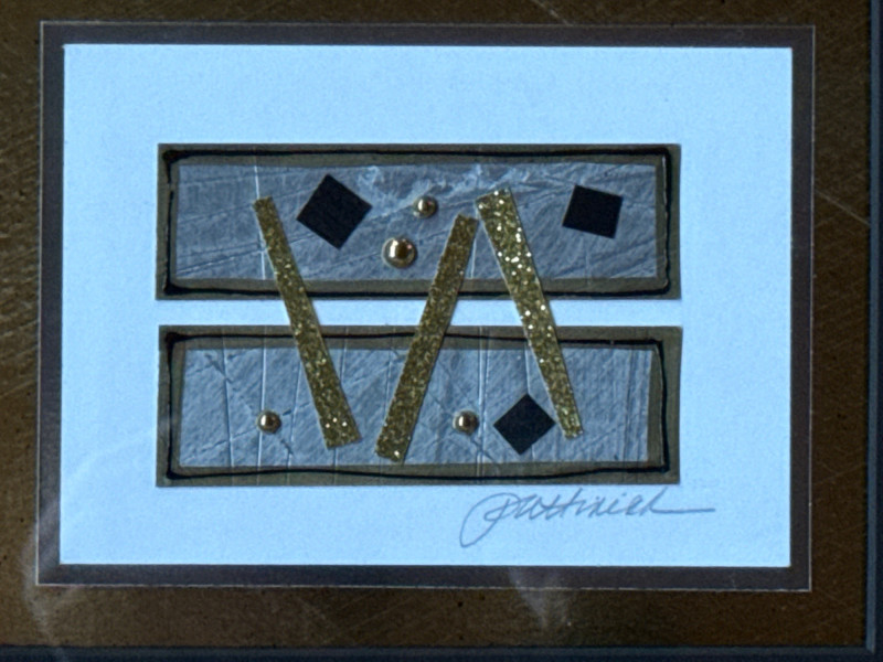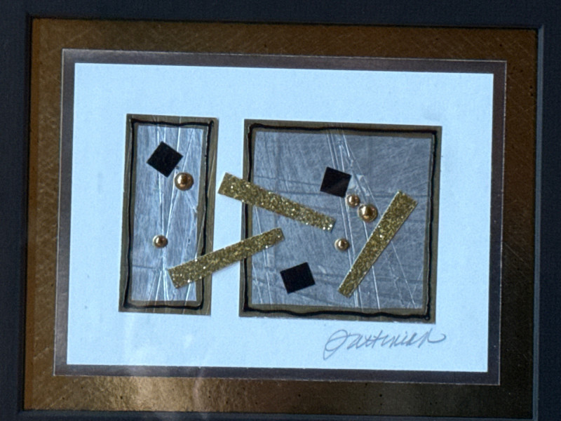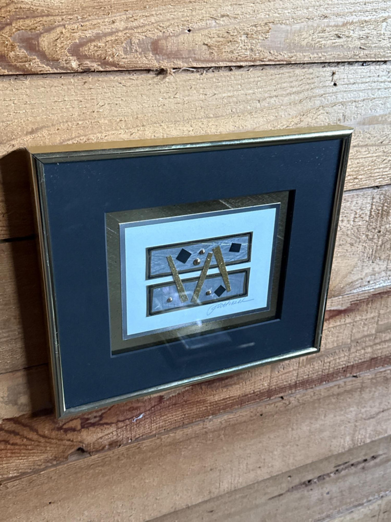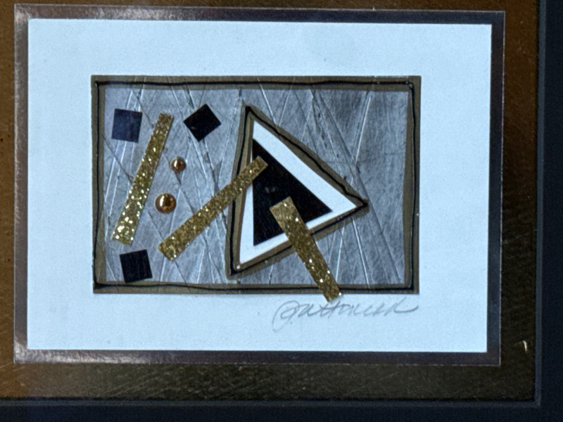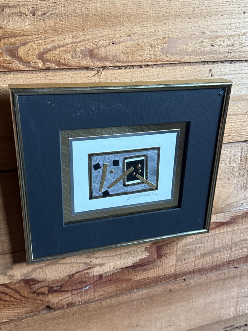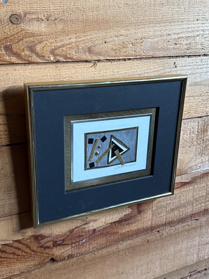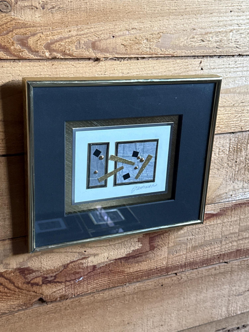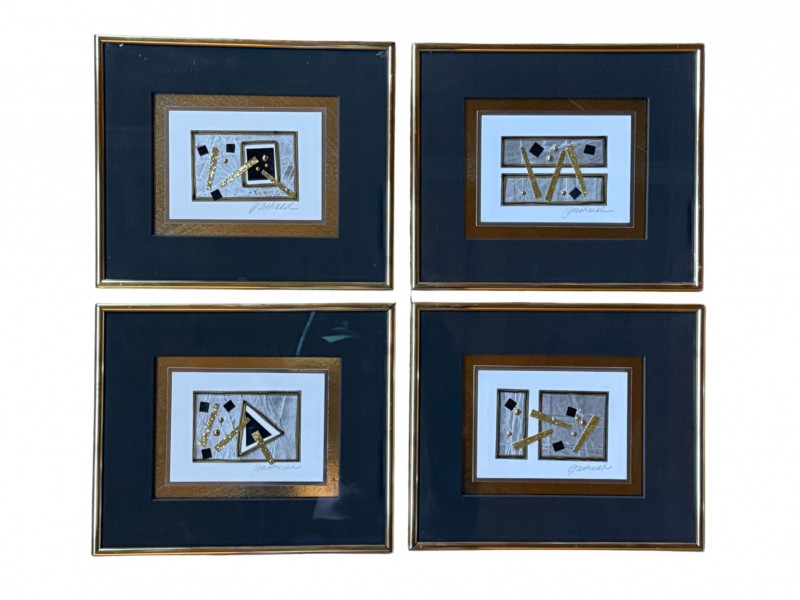 This lot features a curated collection of four abstract mixed-media artworks, each showcasing a modern, geometric aesthetic with 3D elements. These pieces are professionally framed and coordinated to be displayed as a cohesive gallery set. Art Style: Modern abstract featuring raised geometric shapes, metallic accents, and textured backgrounds. All pieces are signed Item Details: