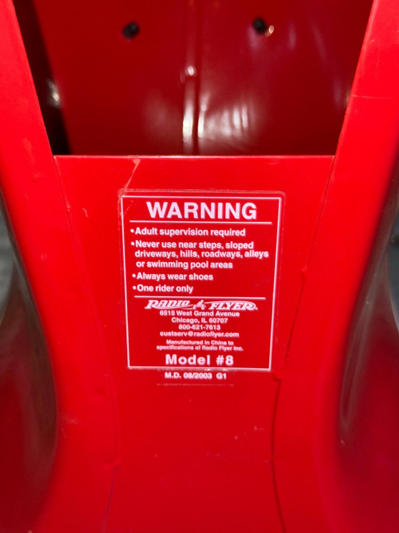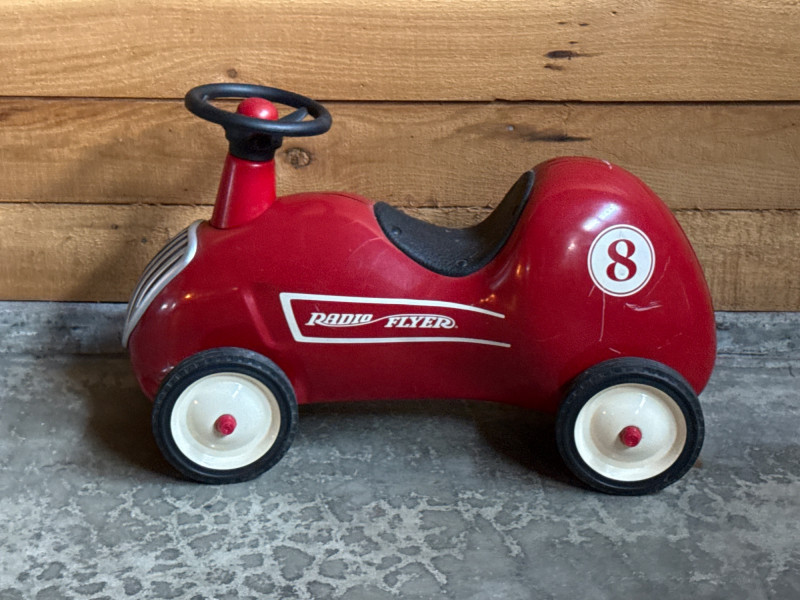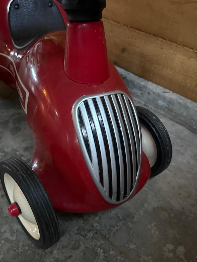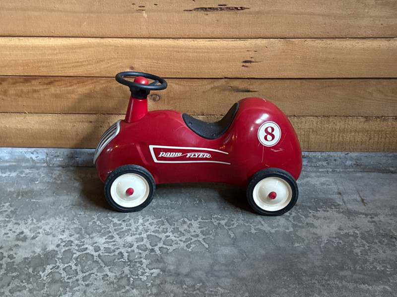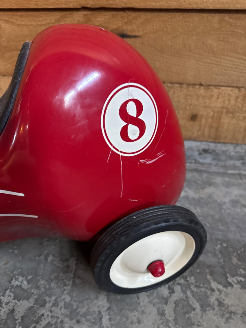 his lot features a classic Radio Flyer Model 8 Roadster, a vintage-inspired ride-on toy that captures the timeless aesthetic of mid-century pedal cars. Finished in signature bright red, this sturdy toy is designed for both play and as a nostalgic decor piece. Brand/Model: Design: Features a sleek, aerodynamic body with a silver-tone steering wheel and "8" racing decals. Construction: Classic metal body with durable wheels and a comfortable molded seat. Dimensions: Measures 26” L x 11” W x 15” H. Please note photos- this piece does show signs of use. Still in working order. Item Details: