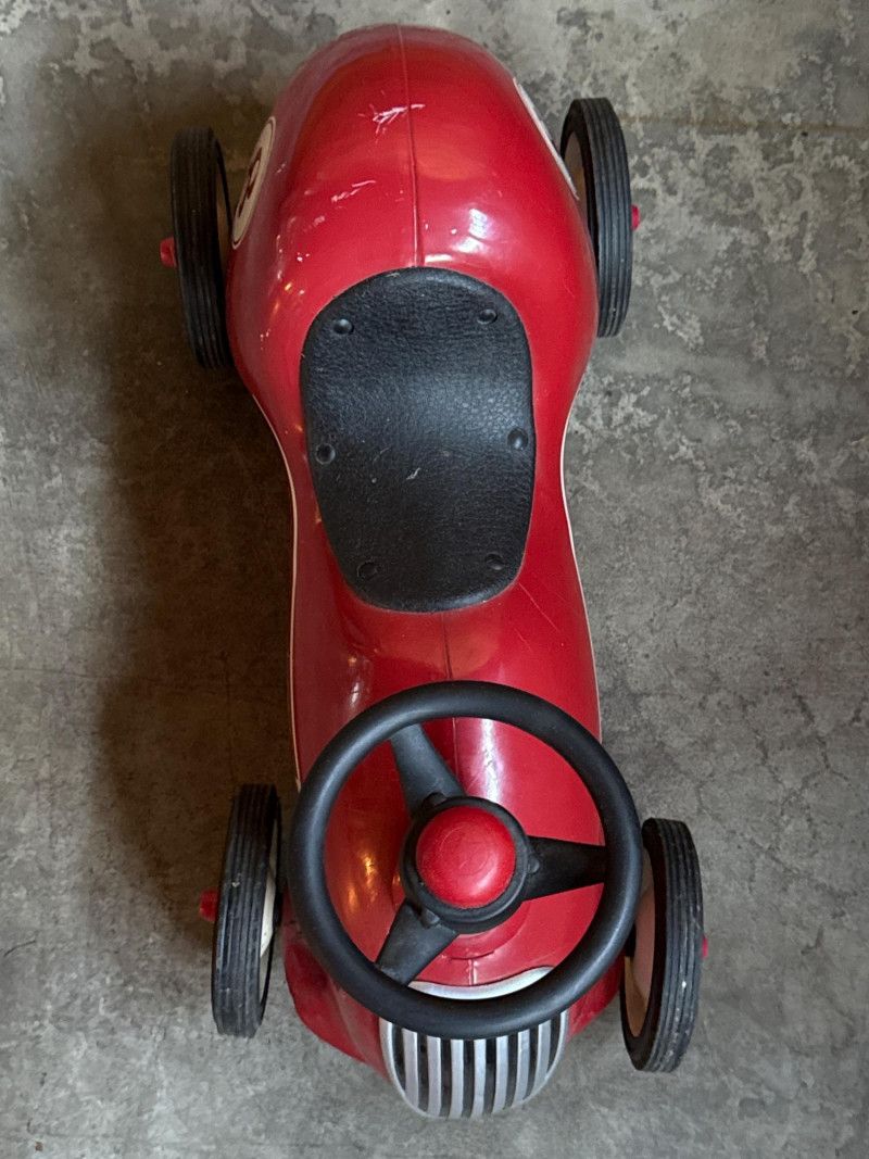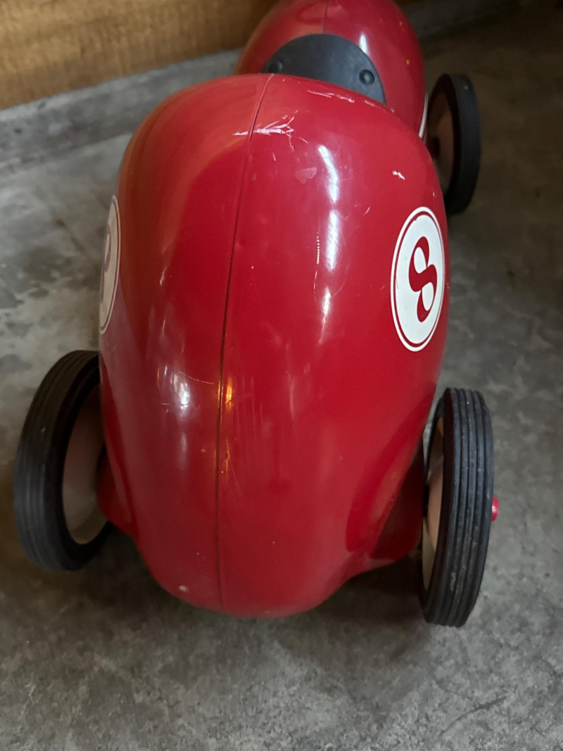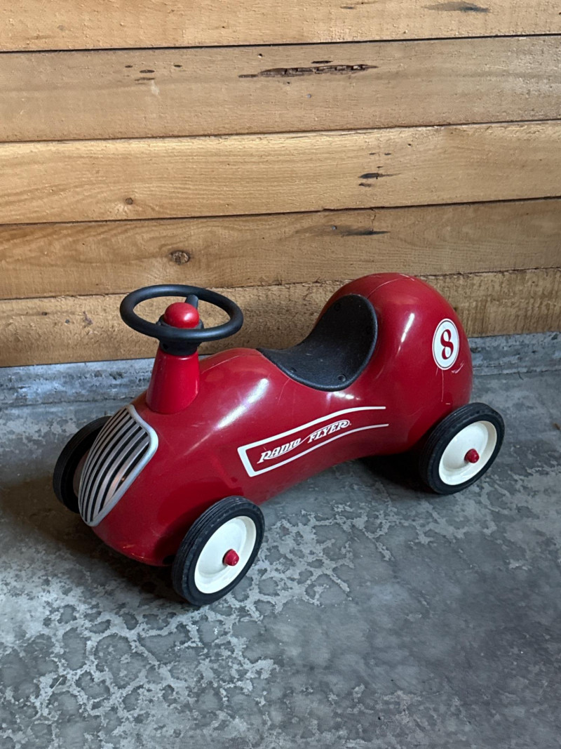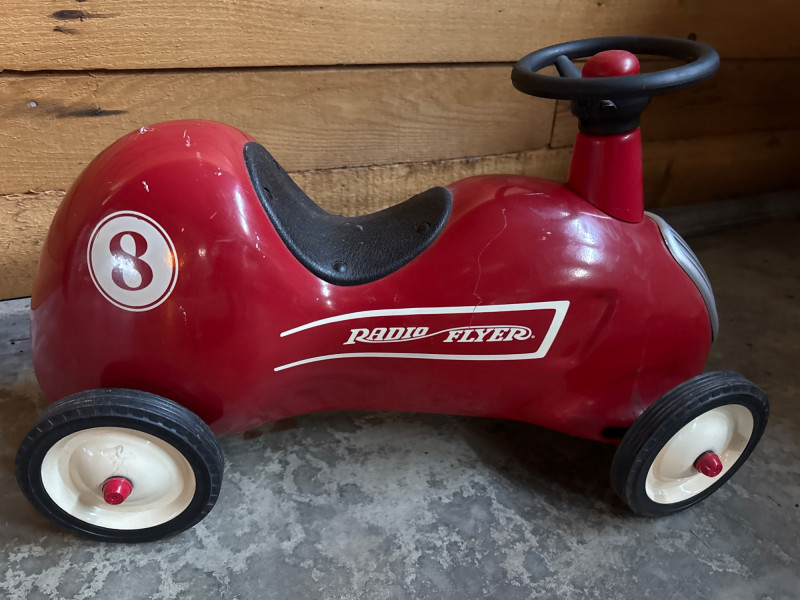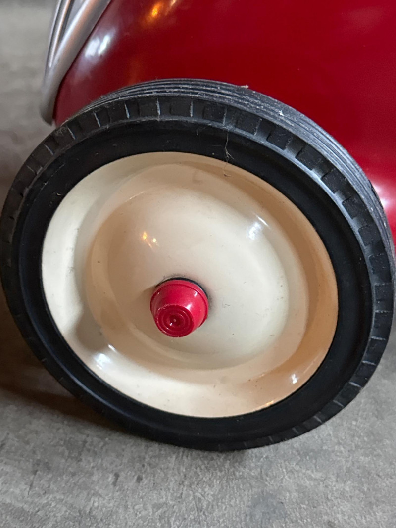 his lot features a classic Radio Flyer Model 8 Roadster, a vintage-inspired ride-on toy that captures the timeless aesthetic of mid-century pedal cars. Finished in signature bright red, this sturdy toy is designed for both play and as a nostalgic decor piece. Brand/Model: Design: Features a sleek, aerodynamic body with a silver-tone steering wheel and "8" racing decals. Construction: Classic metal body with durable wheels and a comfortable molded seat. Dimensions: Measures 26” L x 11” W x 15” H. Please note photos- this piece does show signs of use. Still in working order. Item Details: