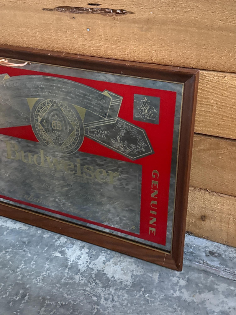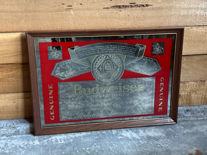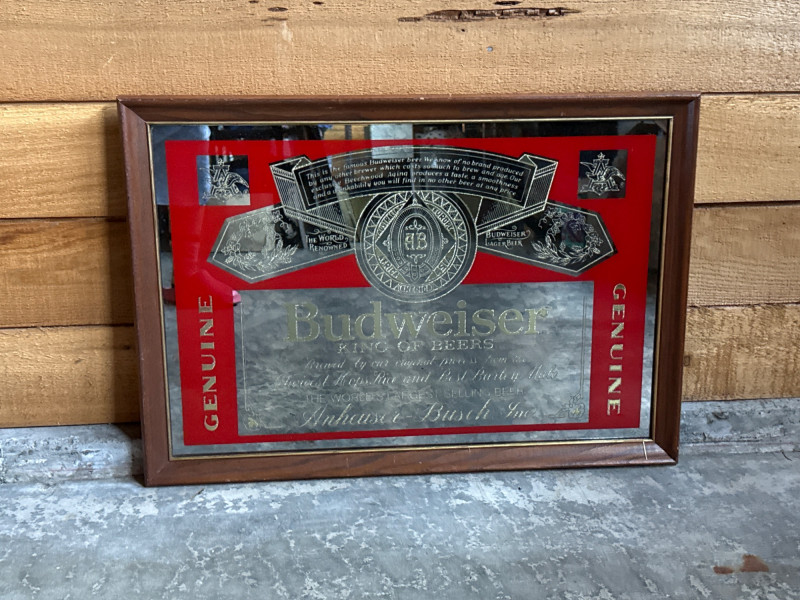 This lot features a classic Vintage Budweiser Mirror, a quintessential piece of breweriana decor perfect for a home bar, man cave, or vintage collection.