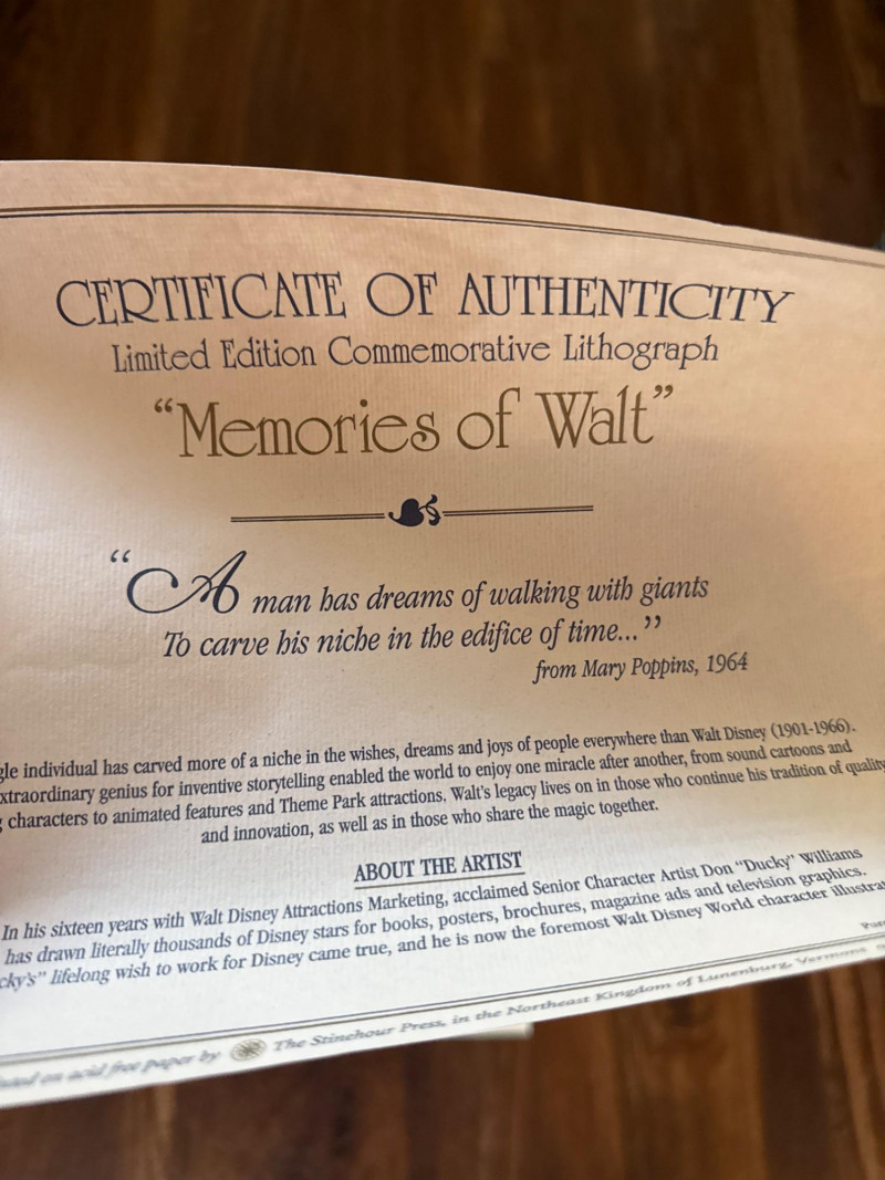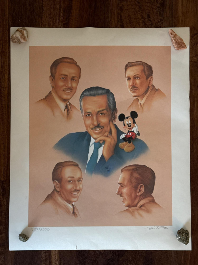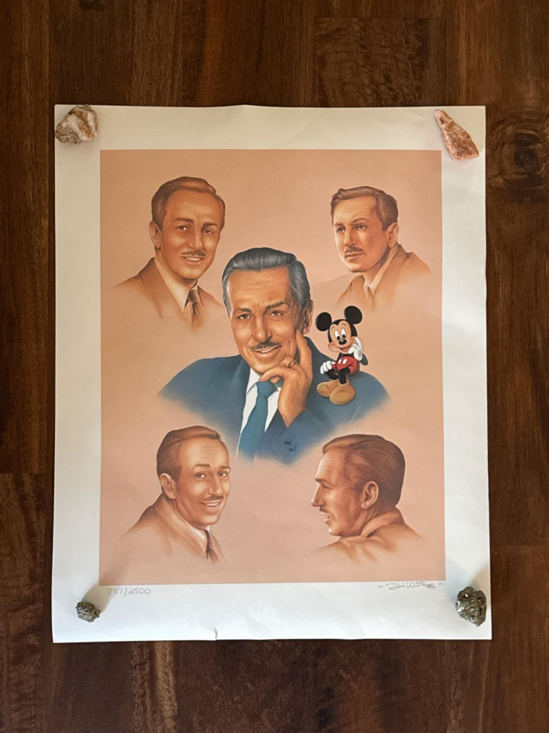 "Memories of Walt" (sometimes referred to as "Memories of Walt Disney"). Key Details of the Artwork Artist: This commemorative lithograph was created by renowned Disney animator and artist Don "Ducky" Williams. Design: It features a montage of portraits depicting Walt Disney at various stages of his career, alongside his iconic character, Mickey Mouse.