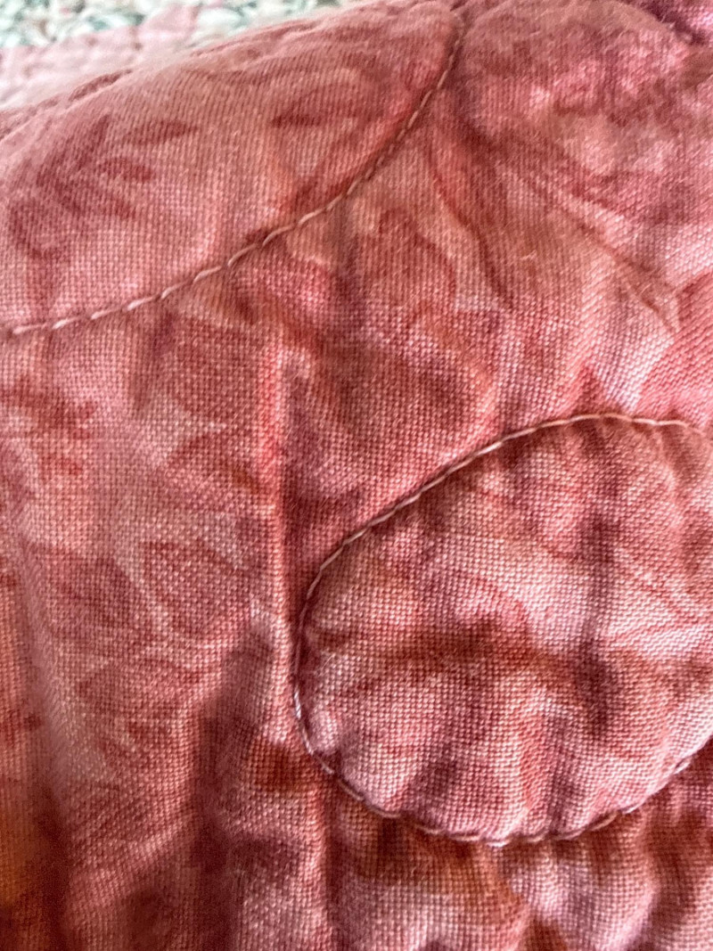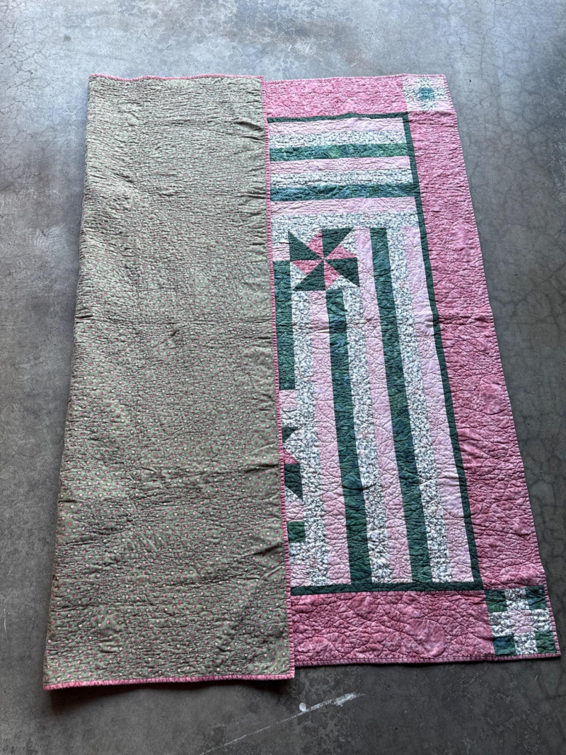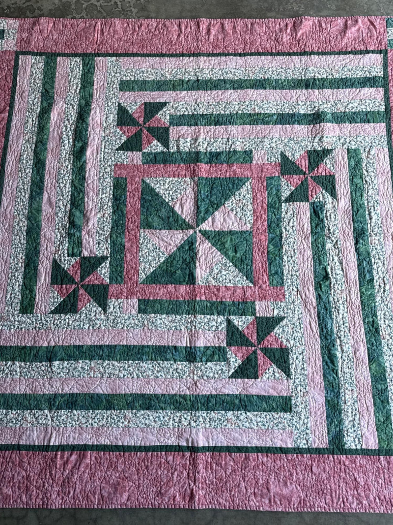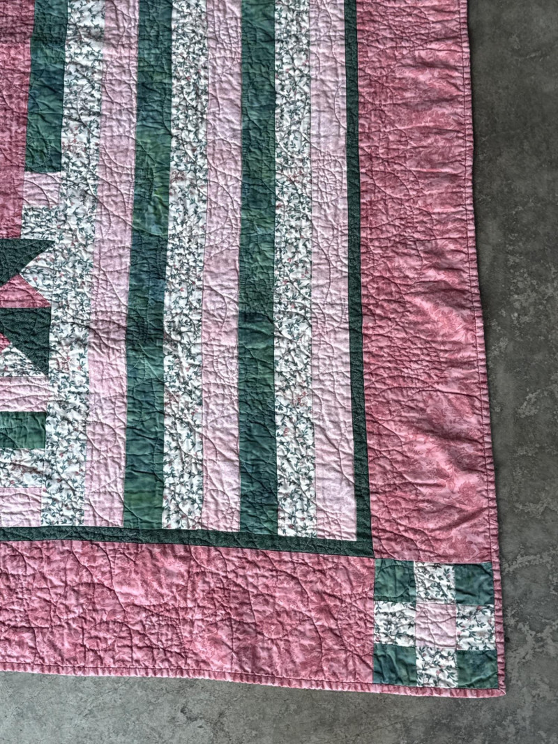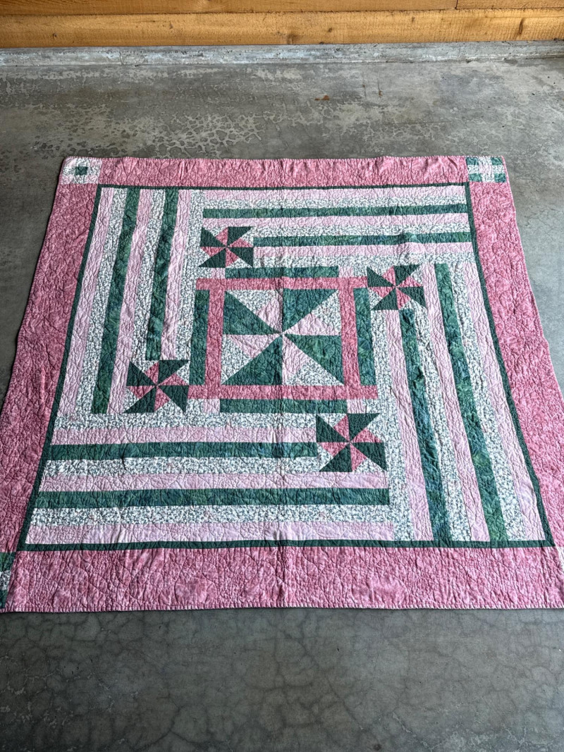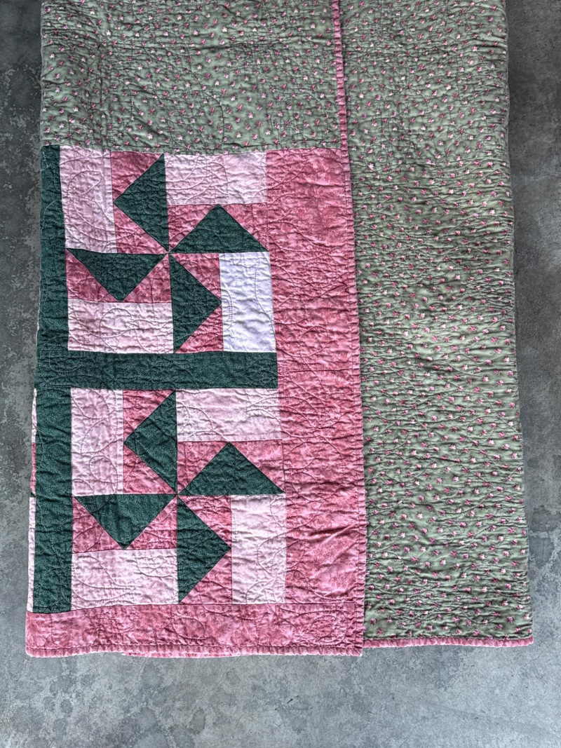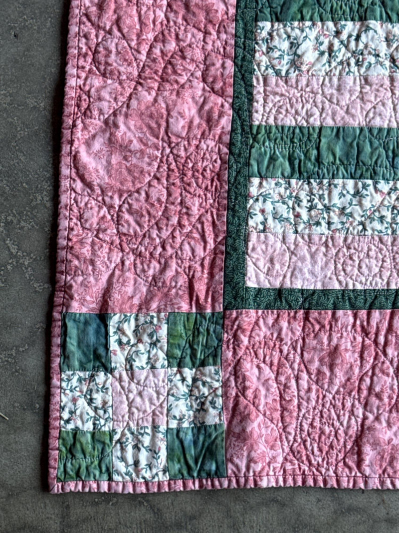 Vintage Pink & Green Lap Quilt 63” x 64.25” Wonderful, pre-loved condition.