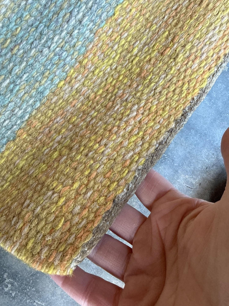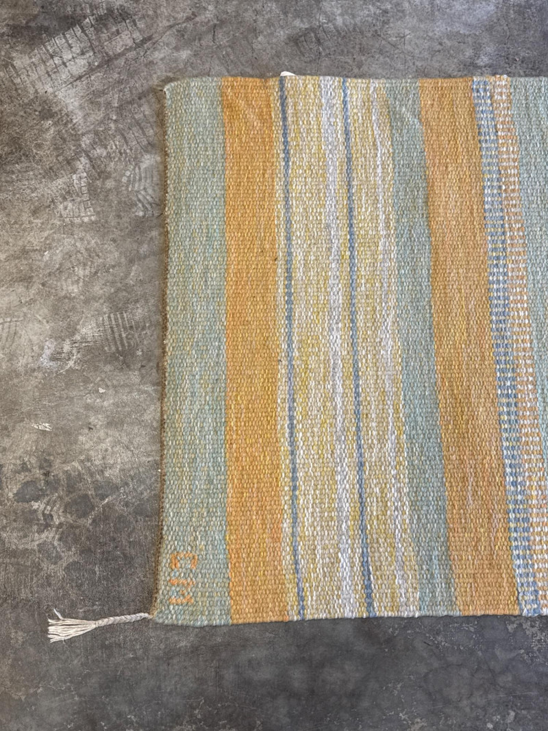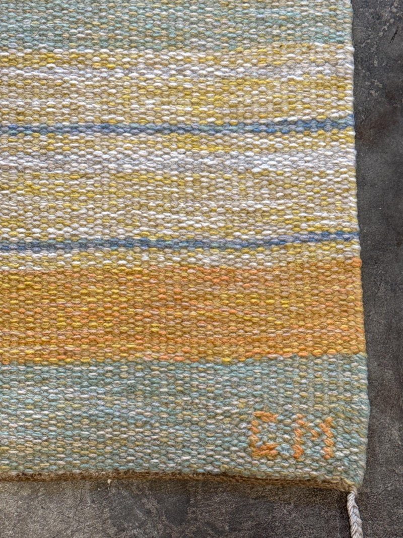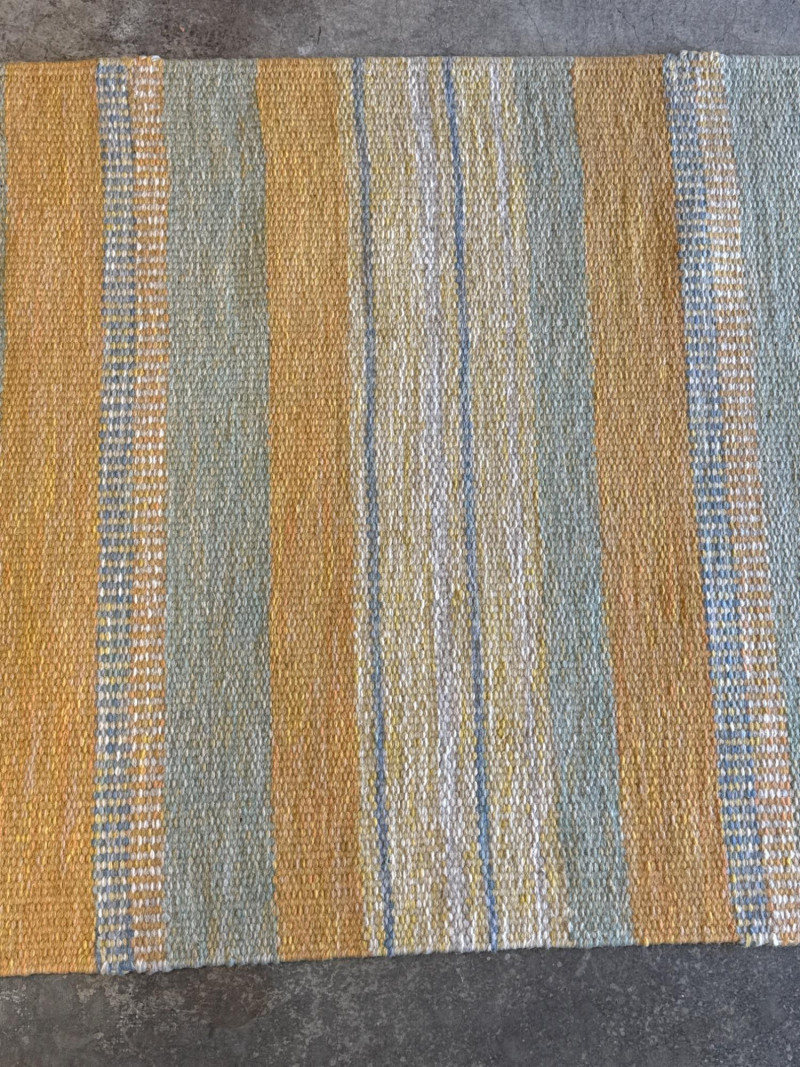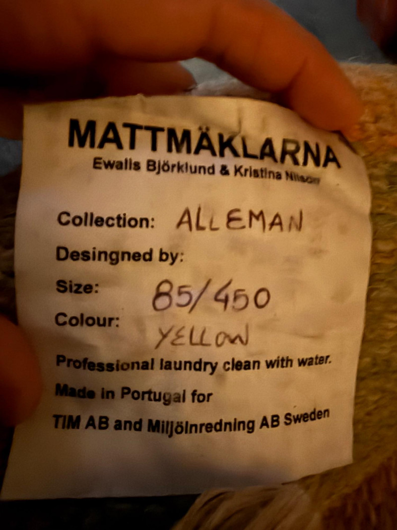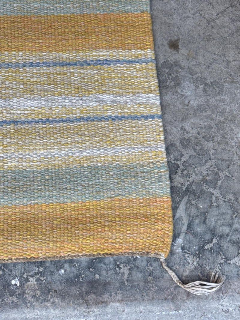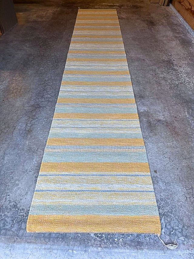 Product Name: Collection: Alleman Brand/Manufacturer: Mattmäklarna (Designed by Ewalle Björklund & Kristina) Origin: Made in Portugal for TIM AB and Miljöinredning AB Sweden. This is a high-quality Scandinavian-style wool runner featuring a contemporary striped pattern. The color palette is described as "Yellow," though the visual design incorporates a sophisticated blend of: Muted golden yellow Soft grey/blue-grey Cream/off-white The rug has a flat-weave texture with finished edges and simple fringing at the ends, making it ideal for high-traffic areas like hallways or entryways that require a modern, "Mid-Century Modern" (MCM) touch. Dimensions: Approximately 174.5 inches long by 32.5 inches wide (roughly 14.5 feet by 2.7 feet). Material: 100% Wool (indicated by the professional cleaning instructions on the care tag). Condition: The images show the rug in a clean, rolled-out state with the original manufacturer's labels intact.Item Overview