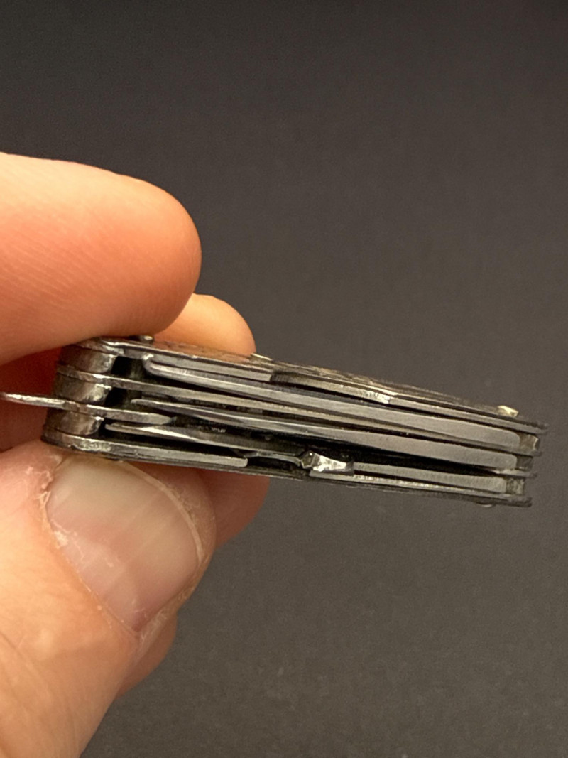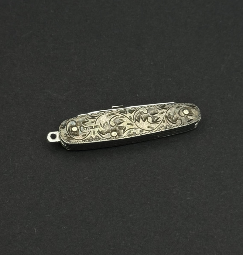 This antique sterling silver ladies' pocket knife is a beautiful example of early 20th-century craftsmanship. The handle features an intricate, Victorian-style floral scrollwork design expertly engraved into the sterling silver scales. Compact and elegant, this folding knife measures approximately 1.75” long when closed and includes a small hanging loop, suggesting it was originally designed to be worn on a watch chain or chatelaine. The "STERLING" hallmark is clearly visible on the bolster, making it a sophisticated addition for any collector of vintage vanity items or fine miniature cutlery.