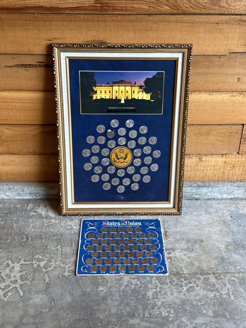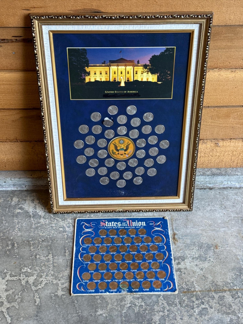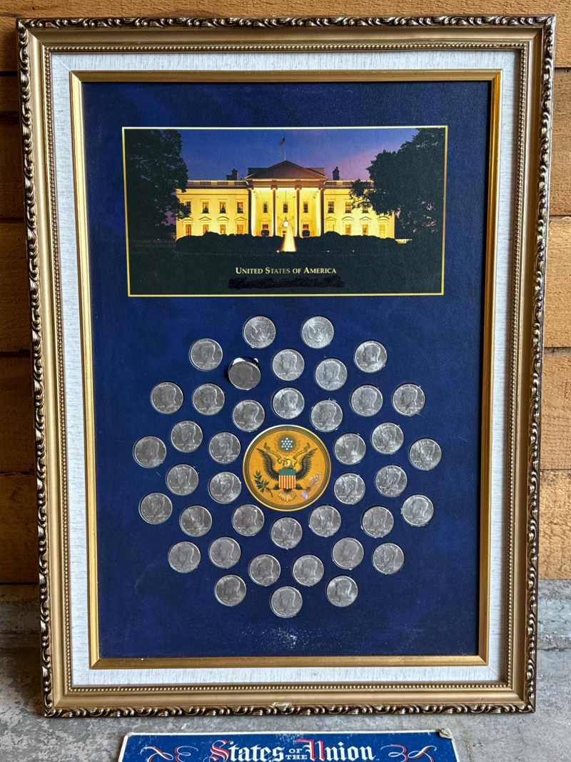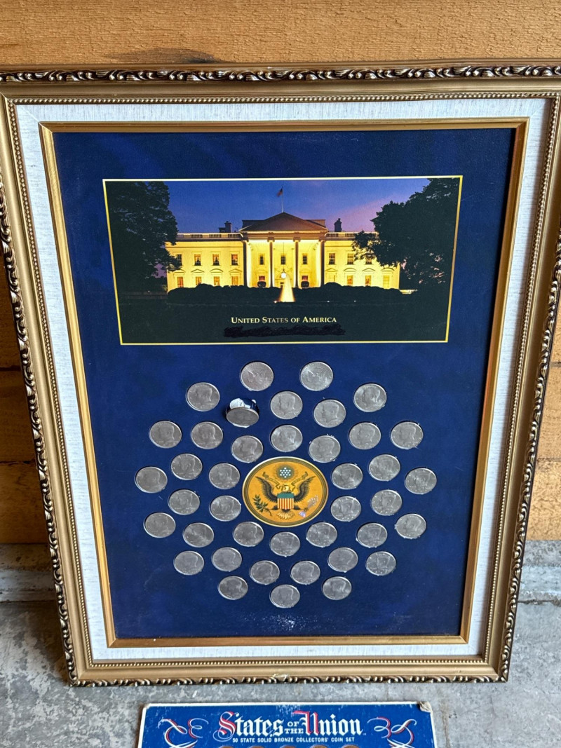 Description: Framed Commemorative Display: Features a professionally framed and matted wall hanging titled "United States of America" with a vibrant image of the White House. Kennedy Half Dollar Set: The framed display includes a circular arrangement of Kennedy Half Dollars surrounding a central Great Seal of the United States emblem. "States of the Union" Bronze Set: Includes a 50 State Solid Bronze Collectors' Coin Set folder. Educational Detail: The bronze set folder features individual slots for all 50 states, listing each state’s name and its date of admission to the Union (e.g., Delaware, Dec. 7, 1787). Aesthetic: The framed piece features a gold-tone ornate frame with a deep blue matte, making it a ready-to-hang piece for a home office, library, or history enthusiast. Condition: Both the framed display and the coin folder appear to be in good vintage condition. Please refer to the high-resolution photos for specific coin dates and condition details. Brand/Series: States of the Union 50 State Solid Bronze Collectors' Coin Set. Items Included: (1) Framed Kennedy Half Dollar wall hanging, (1) Bronze coin collector folder with coins. **a couple coins are loose. The framed piece appears to have something blacked out with a sharpie. Please note photos for more details. Patriotic Coin Collection: Framed Half Dollars & Bronze State Medals