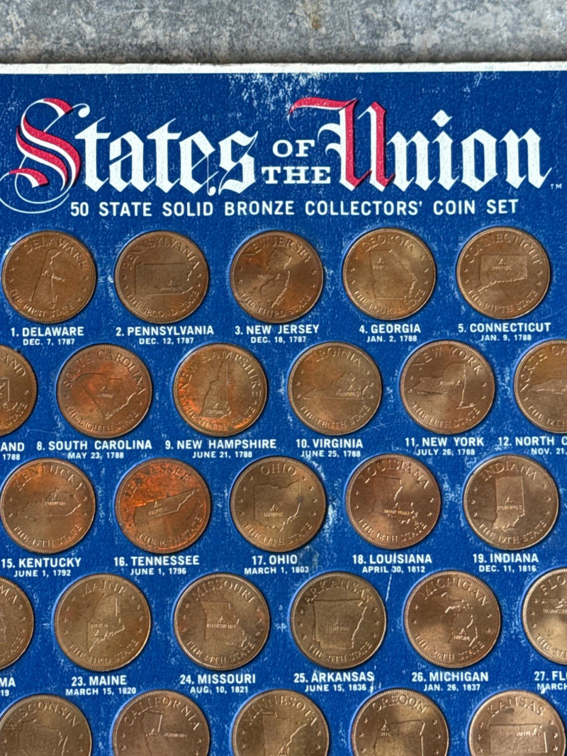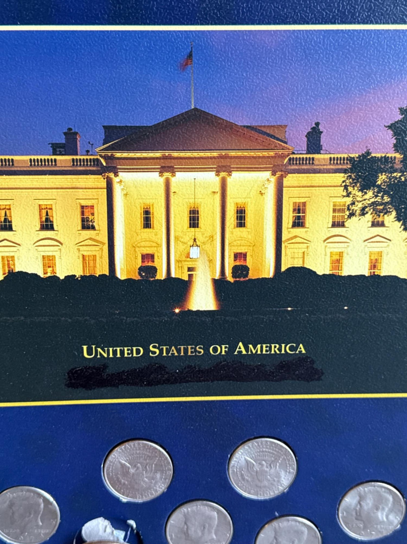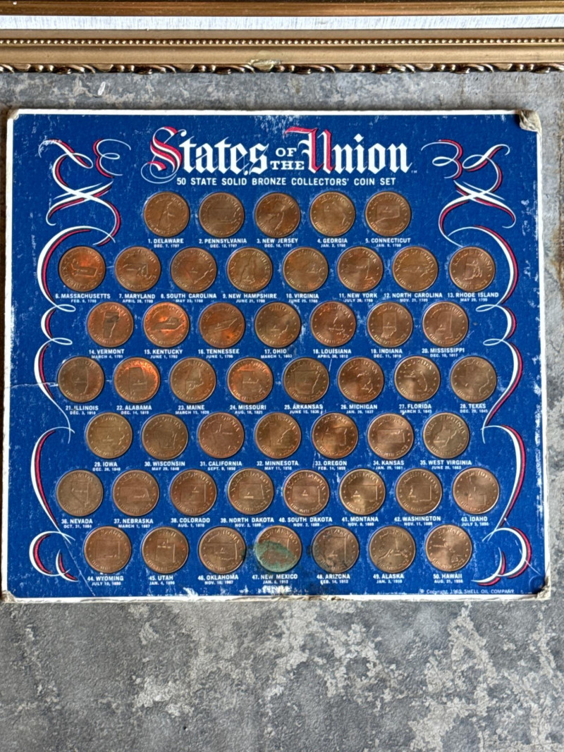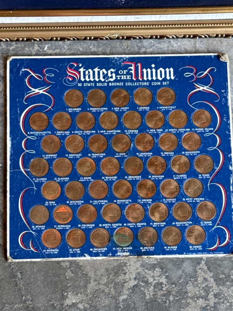 Description: Framed Commemorative Display: Features a professionally framed and matted wall hanging titled "United States of America" with a vibrant image of the White House. Kennedy Half Dollar Set: The framed display includes a circular arrangement of Kennedy Half Dollars surrounding a central Great Seal of the United States emblem. "States of the Union" Bronze Set: Includes a 50 State Solid Bronze Collectors' Coin Set folder. Educational Detail: The bronze set folder features individual slots for all 50 states, listing each state’s name and its date of admission to the Union (e.g., Delaware, Dec. 7, 1787). Aesthetic: The framed piece features a gold-tone ornate frame with a deep blue matte, making it a ready-to-hang piece for a home office, library, or history enthusiast. Condition: Both the framed display and the coin folder appear to be in good vintage condition. Please refer to the high-resolution photos for specific coin dates and condition details. Brand/Series: States of the Union 50 State Solid Bronze Collectors' Coin Set. Items Included: (1) Framed Kennedy Half Dollar wall hanging, (1) Bronze coin collector folder with coins. **a couple coins are loose. The framed piece appears to have something blacked out with a sharpie. Please note photos for more details. Patriotic Coin Collection: Framed Half Dollars & Bronze State Medals