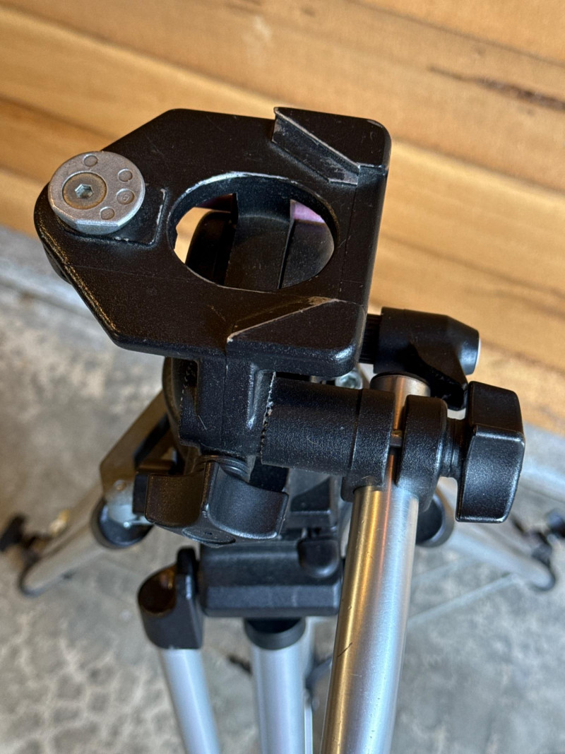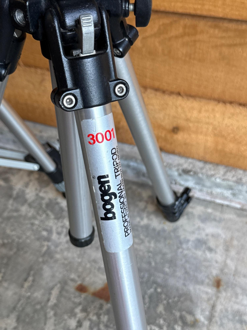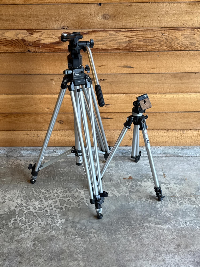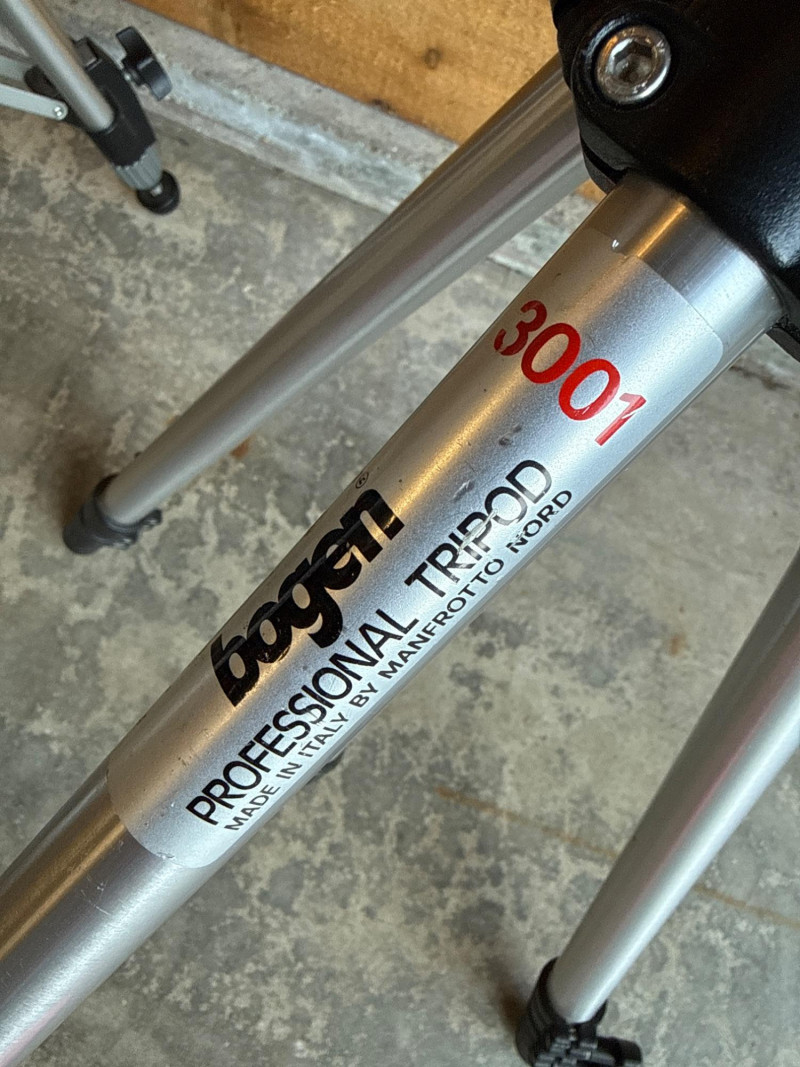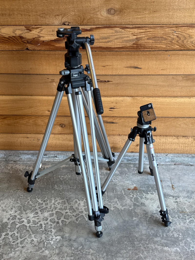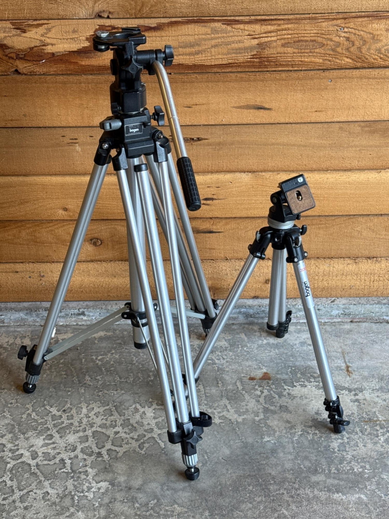 This lot includes two (2) high-quality professional camera tripods manufactured by Bogen. Primary Tripod: Features a Bogen 3001 Professional Tripod base. Equipped with a Bogen Model #3041 professional tripod head. Made in Italy by Manfrotto for Bogen. Secondary Tripod: A smaller, complementary silver-tone Bogen tripod, ideal for lightweight setups or secondary camera angles. Key Features: Durable aluminum construction with adjustable telescoping legs. Sturdy three-way pan/tilt head on the primary unit for precise camera positioning. Includes mounting plates as shown in photos. Condition: Both units show signs of professional use consistent with high-end photography gear. The metal finishes are in good condition, and all adjustment knobs and latches appear intact. Aesthetic: Classic brushed silver and black industrial design, synonymous with reliable Italian camera support systems.