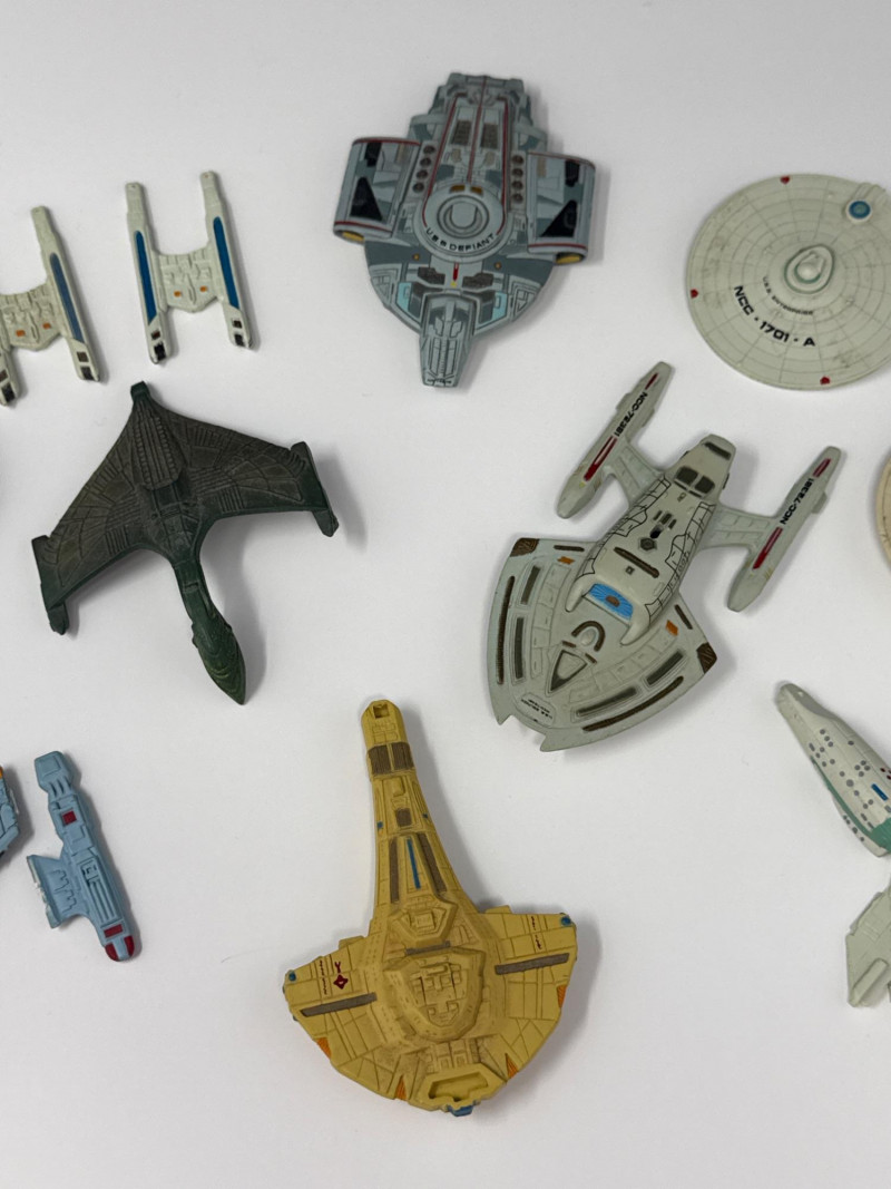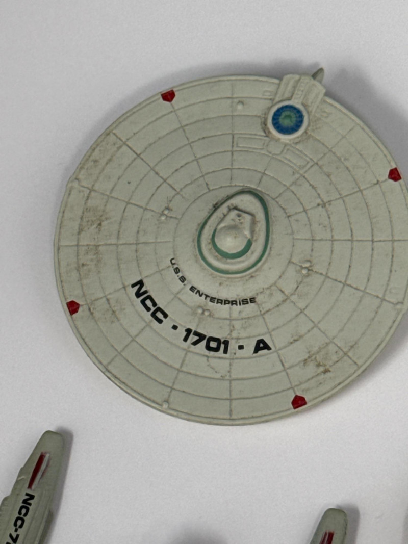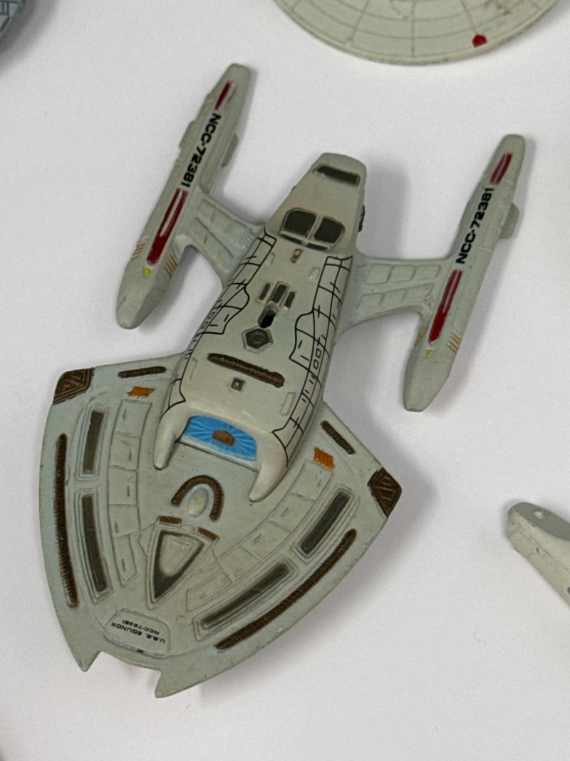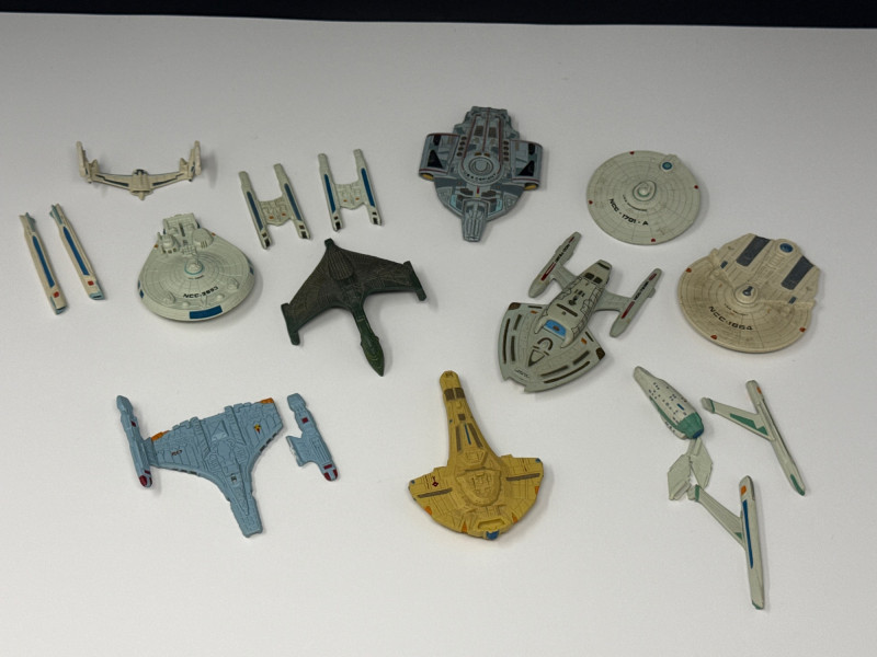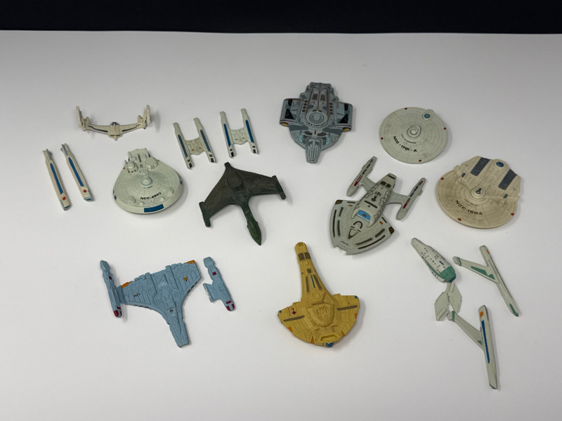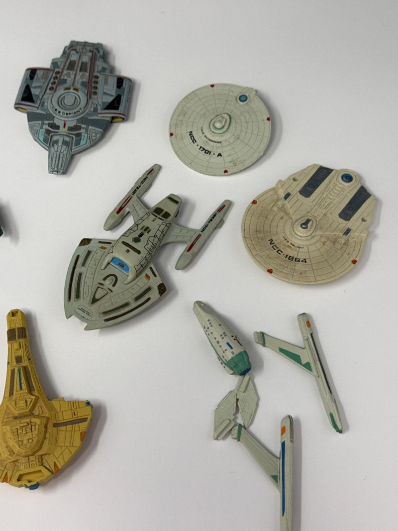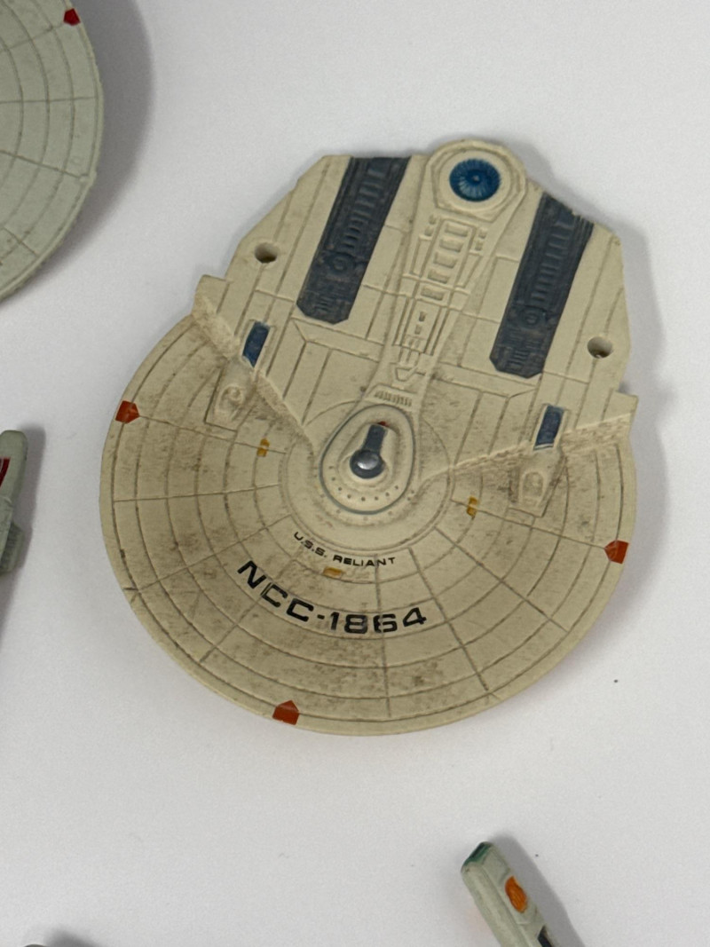 A vintage collection of Star Trek miniature space ships and figures. Key Identification: The set includes highly recognizable vessels such as the U.S.S. Reliant (NCC-1864) and others featuring registries like NCC-1993. Brand/Series: These appear to be from the Micro Machines series by Galoob, originally released in the early 1990s (approx. 1993–1994). Collection Variety: The lot features an assortment of ships and figurines including: Federation starships (Miranda-class and others). Potential Klingon or Romulan vessels (based on typical Micro Machine pack variety). Small character "standee" figurines. Dimensions: These are small-scale "micro" miniatures, with ships measuring approximately up to 4 inches in length. Condition: Vintage pre-owned condition. The pieces show authentic detailing for their size; please refer to the close-up photos for specific condition of individual nacelles and painted markings. *unassembled. One of the tabs are broken off