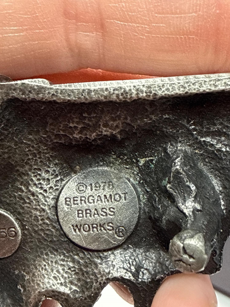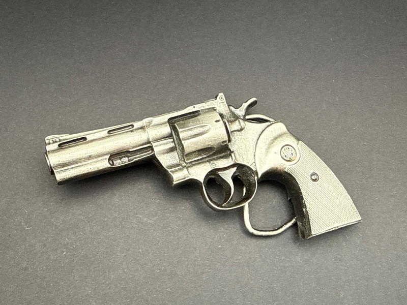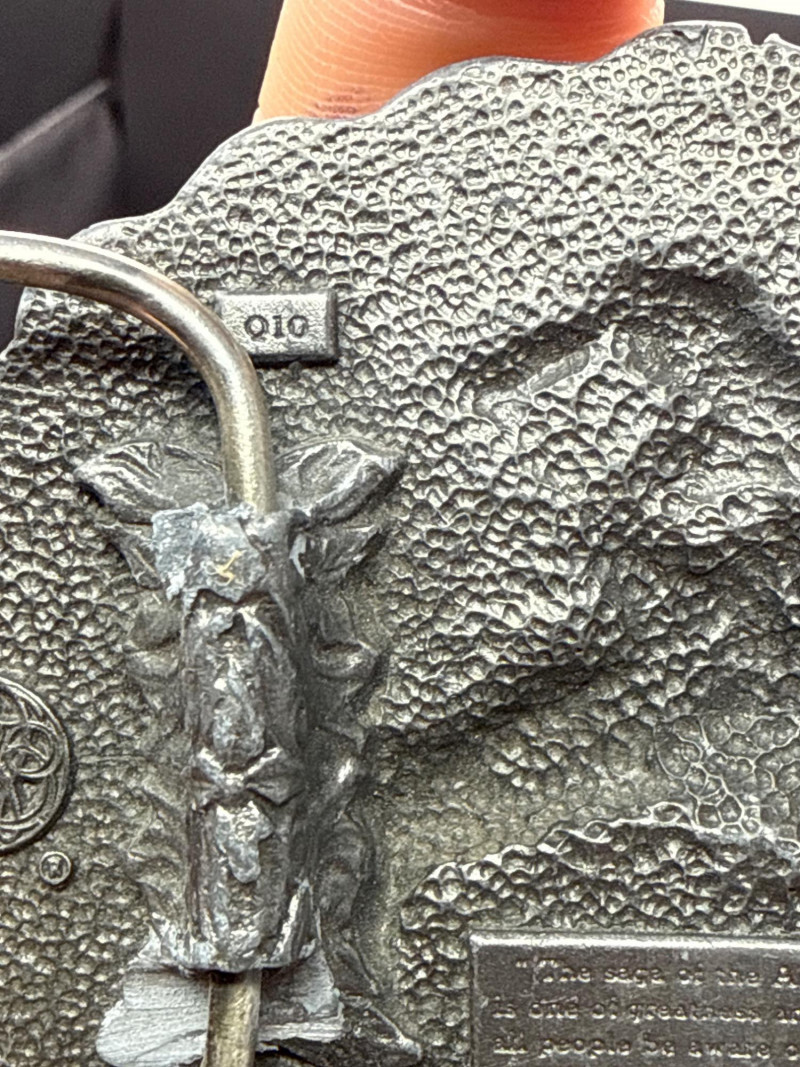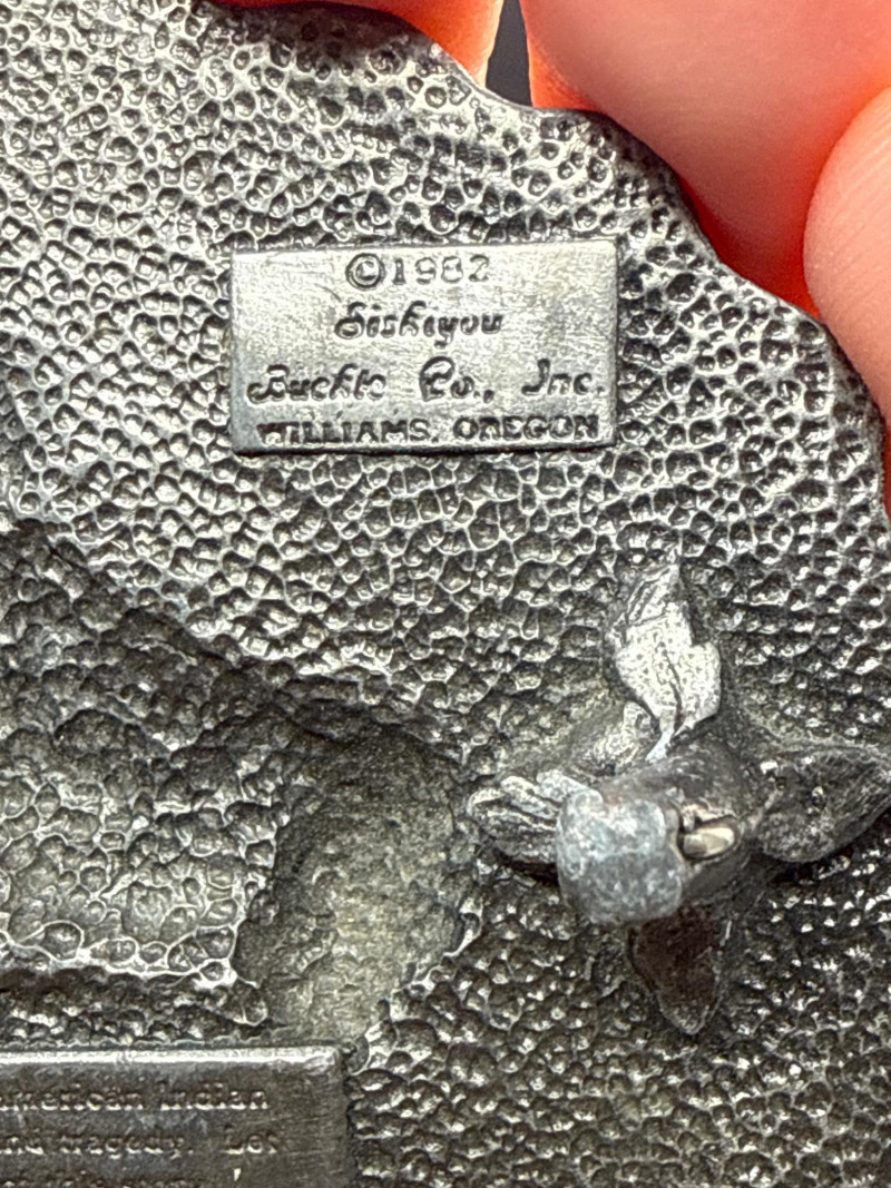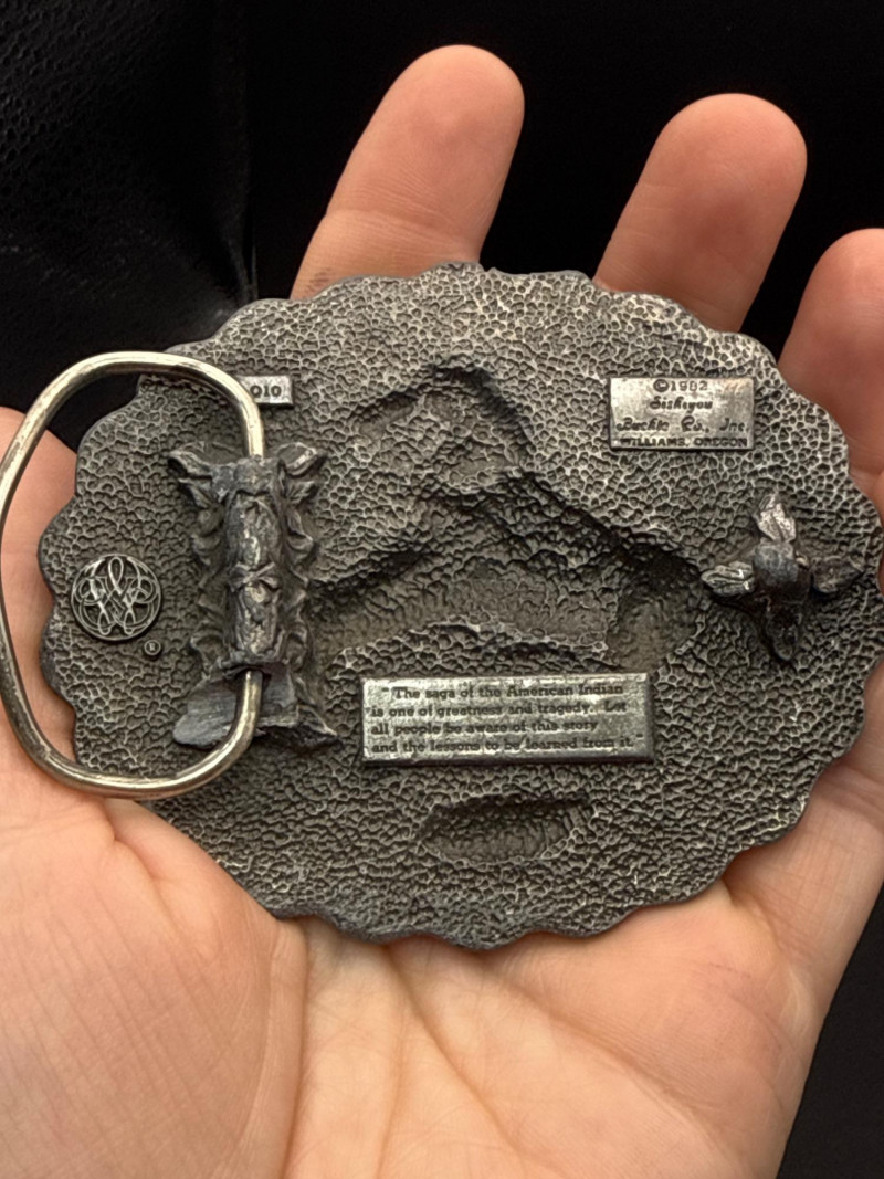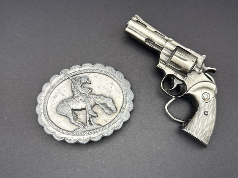 This lot features two (2) unique vintage Western-themed belt buckles crafted from solid pewter. "End of the Trail" Buckle: Design: Features a detailed, high-relief "End of the Trail" motif depicting the iconic image of a weary Native American warrior on horseback. Shape: Circular with a decorative "scalloped" edge. Dimensions: Approximately 3.25 inches in diameter. Miniature Revolver Buckle: Design: A highly detailed 3D miniature replica of a classic Western-style six-shooter revolver. Function: Features a hidden belt loop and prong on the reverse side, allowing it to be worn as a statement buckle. Dimensions: Approximately 4.5 inches in length. Material & Finish: Both buckles are made of heavy-duty pewter with an antiqued patina that emphasizes the fine textures and sculptural details. Condition: Excellent vintage condition with clear markings and sturdy hardware on the reverse. Please see the gallery for photos of the backings.