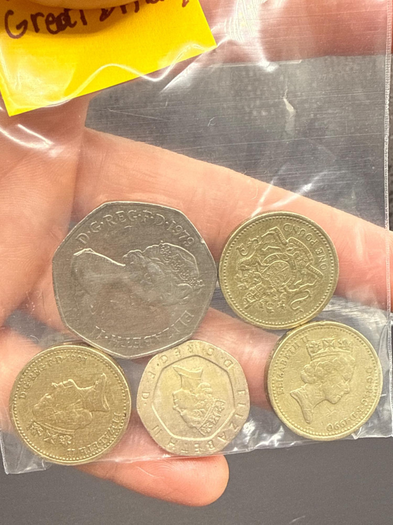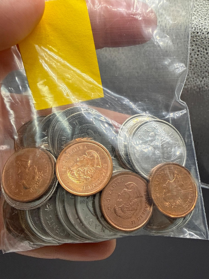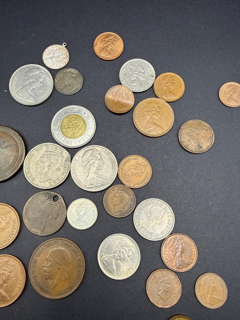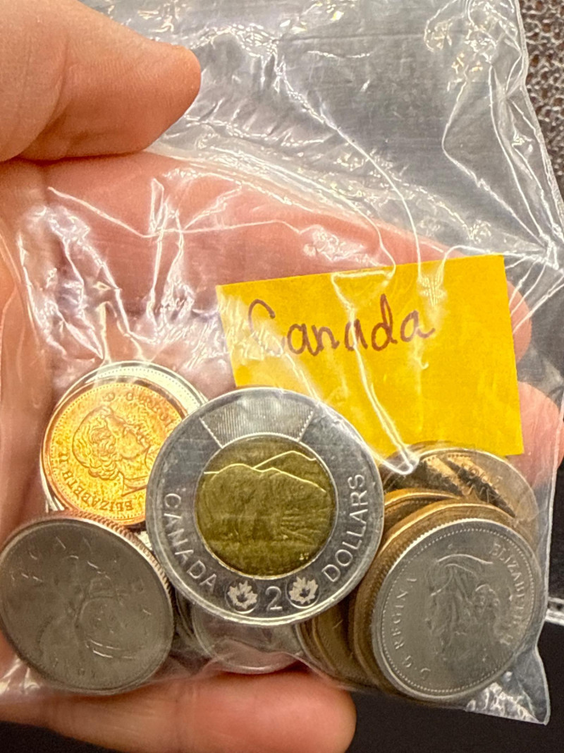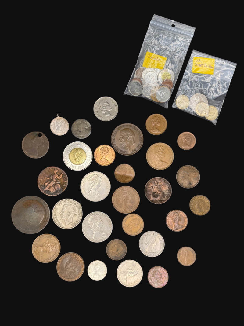 A diverse assortment of vintage and modern foreign currency, primarily focused on the United Kingdom and Canada. Canadian Currency: Features a variety of denominations, including two-dollar coins (Toonies) and one-dollar coins (Loonies). Includes a vintage 1910 Canada One Cent large penny in circulated condition. Several coins are organized in a bag labeled "Canada" for easy identification. United Kingdom & Commonwealth Currency: Includes notable historical pieces such as a Victoria Dei Gra Britt Regina copper coin. Features coins depicting George V and George VI, showcasing a range of British numismatic history. Contains a classic Britannia seated figure motif on several copper/bronze coins. Condition: The collection ranges from heavily circulated vintage copper to modern bi-metallic coins. Most show a natural aged patina typical of historical currency. Total Scope: This lot consists of two bags of coins plus a loose assortment of over 20 individual pieces as shown in the overview.