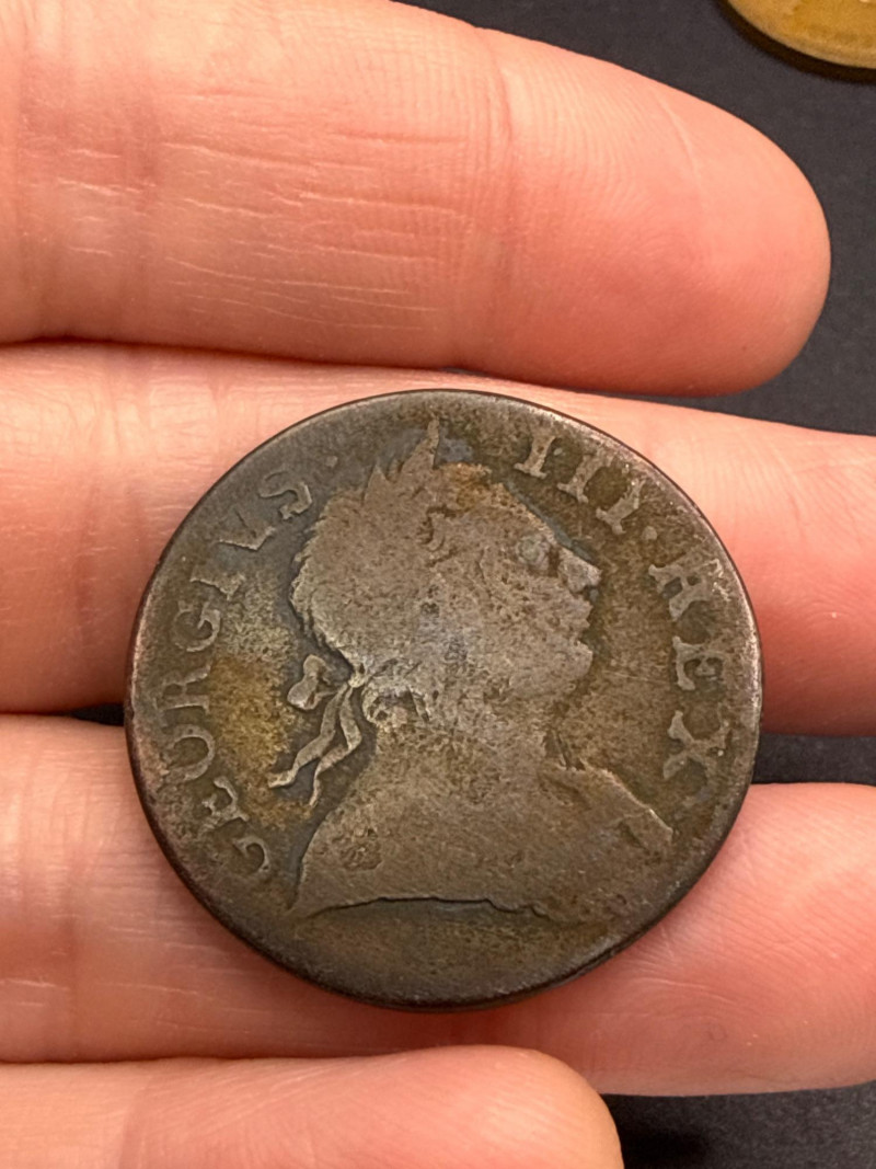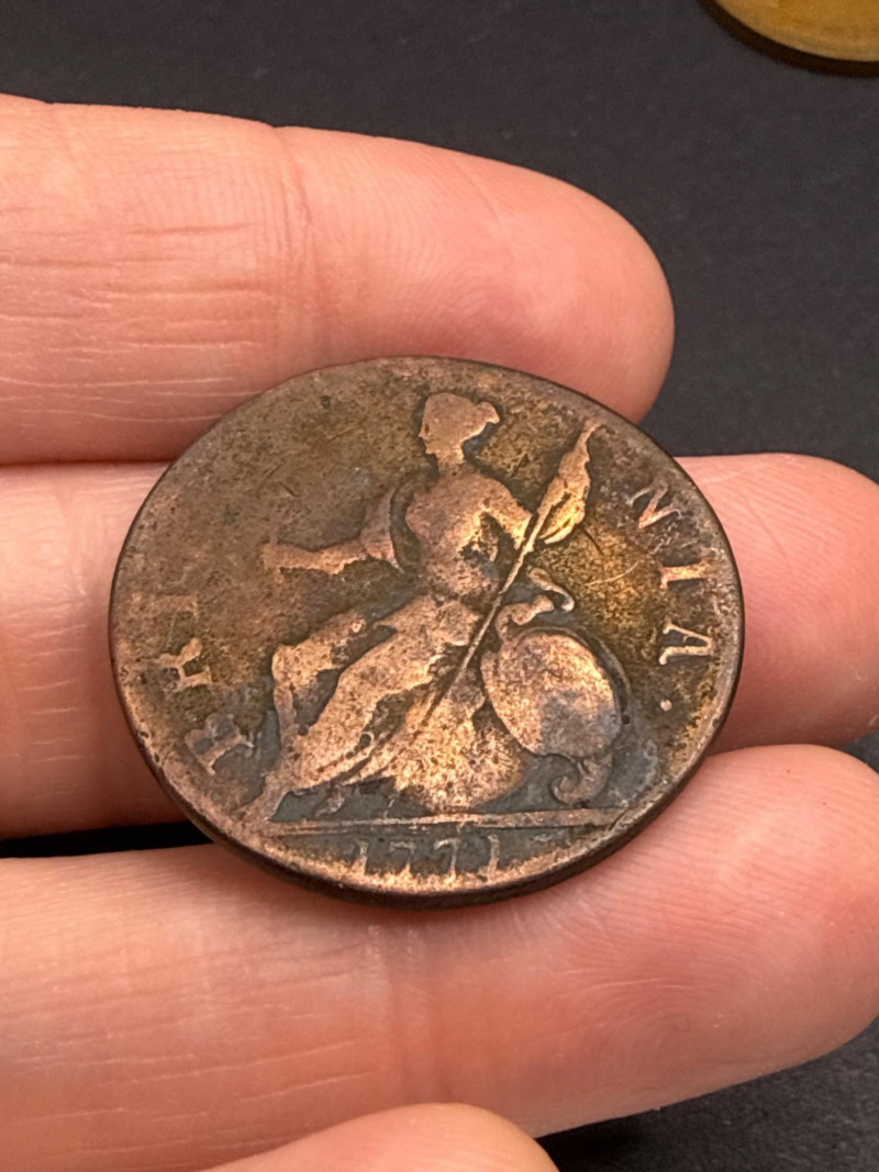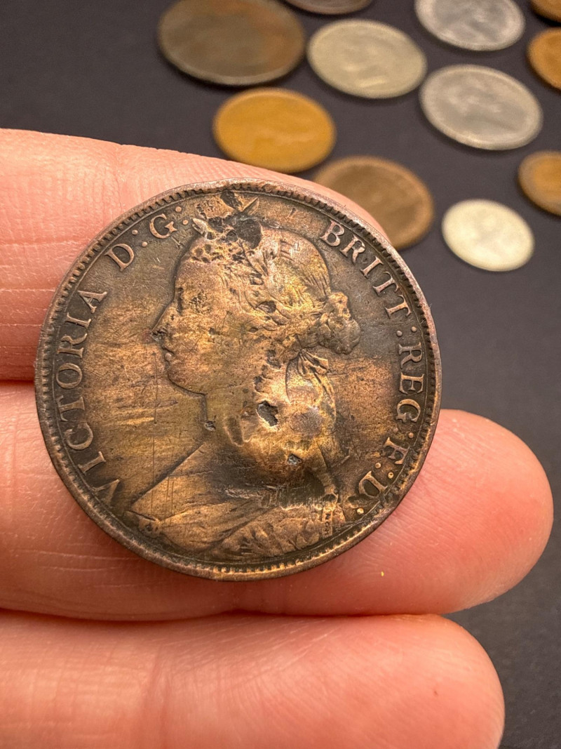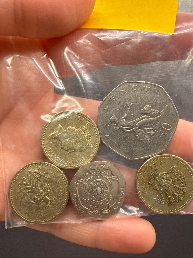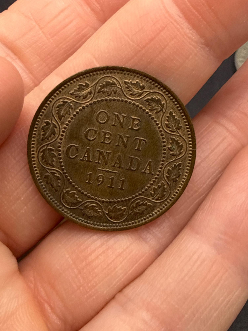 A diverse assortment of vintage and modern foreign currency, primarily focused on the United Kingdom and Canada. Canadian Currency: Features a variety of denominations, including two-dollar coins (Toonies) and one-dollar coins (Loonies). Includes a vintage 1910 Canada One Cent large penny in circulated condition. Several coins are organized in a bag labeled "Canada" for easy identification. United Kingdom & Commonwealth Currency: Includes notable historical pieces such as a Victoria Dei Gra Britt Regina copper coin. Features coins depicting George V and George VI, showcasing a range of British numismatic history. Contains a classic Britannia seated figure motif on several copper/bronze coins. Condition: The collection ranges from heavily circulated vintage copper to modern bi-metallic coins. Most show a natural aged patina typical of historical currency. Total Scope: This lot consists of two bags of coins plus a loose assortment of over 20 individual pieces as shown in the overview.