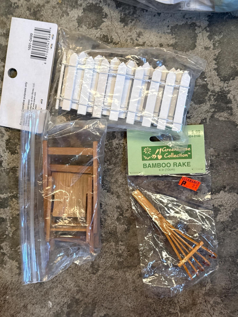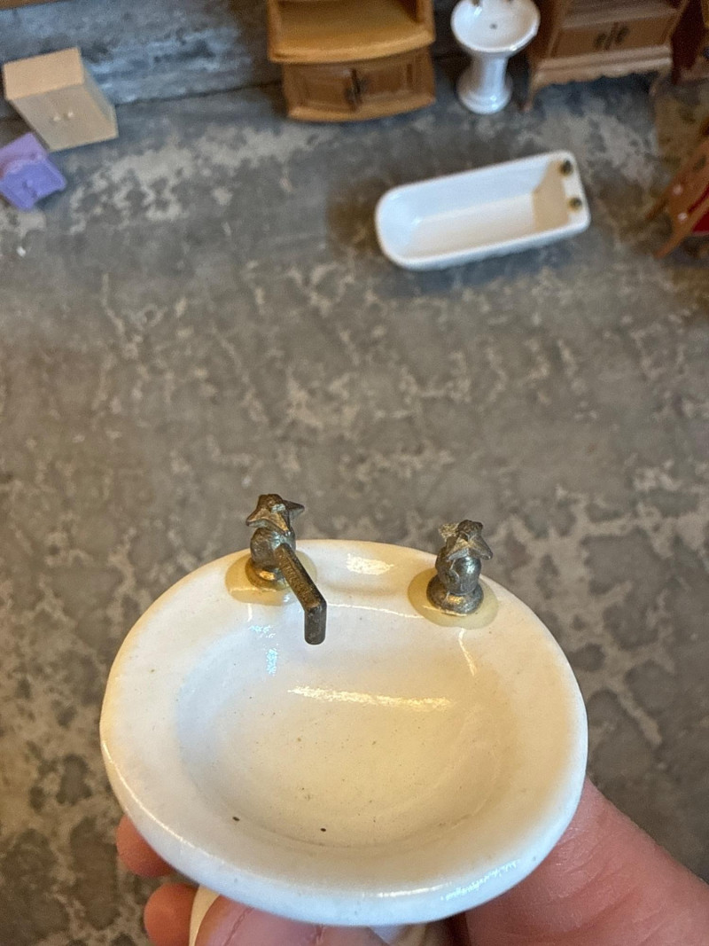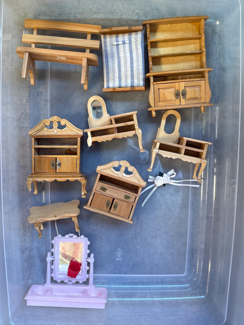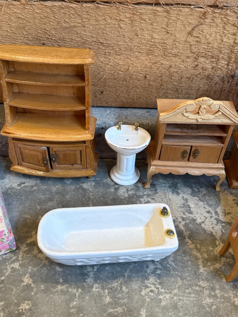 Miniature Vintage Doll House Furniture & Doll Clothes The picture of furniture in the tub is pieces that need repaired.