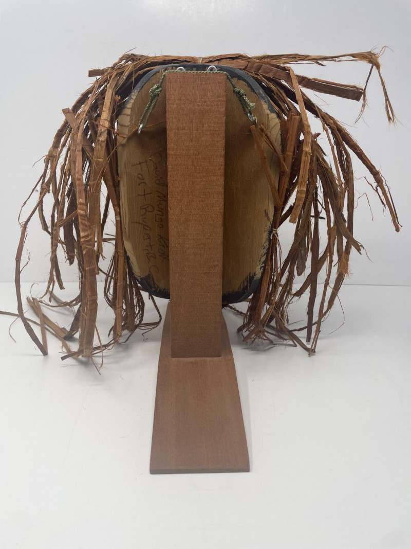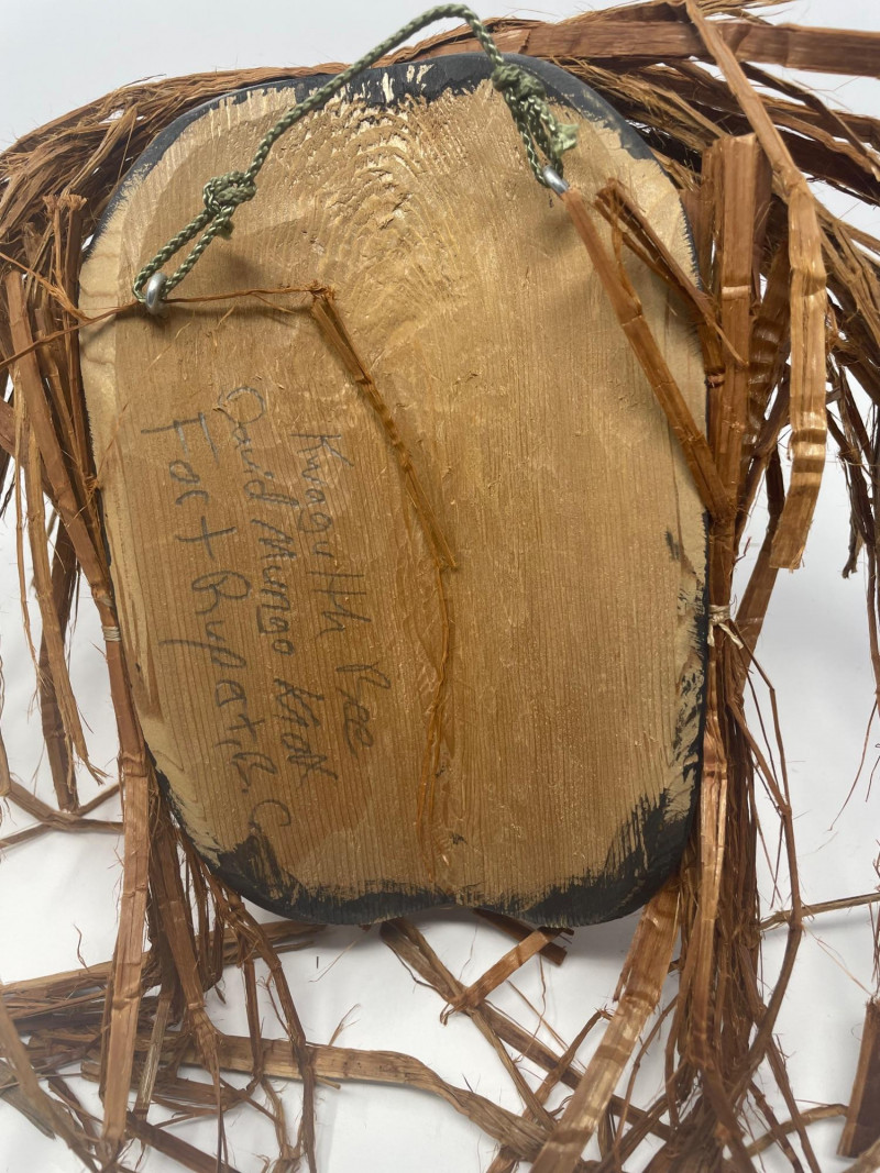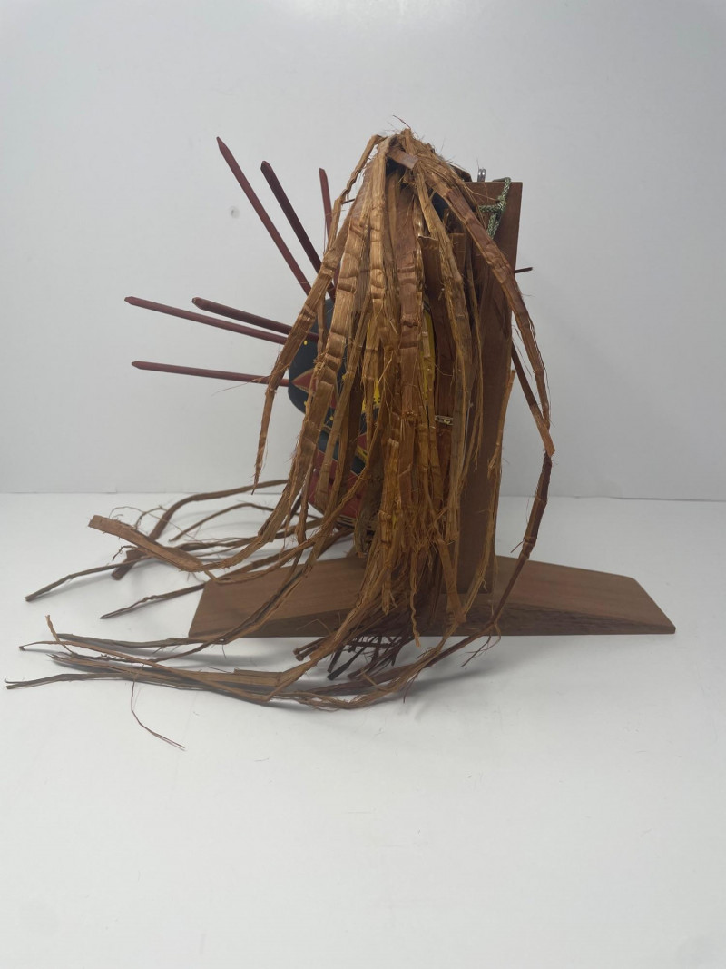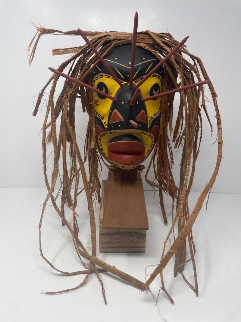 This is a striking ceremonial-style mask featuring: Bold geometric design: Painted in vivid black, yellow, and red with symmetrical patterns. Organic adornments: Long dried plant fibers cascade from the sides, resembling hair or ceremonial fringe. Radiating red spikes: Wooden spikes protrude outward from the face, enhancing its dramatic presence. Dimensions: Approximately 9” x 5½” with a 9” depth including the spikes. This piece blends folk artistry with theatrical flair, possibly inspired by tribal or ritual masks. The exaggerated features and radial composition suggest it was designed for visual impact—whether in performance, storytelling, or as a statement art object.