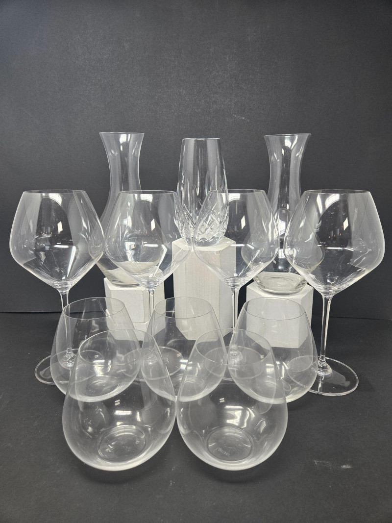 Riedel Glassware: Includes wine glasses and stemless varieties Designed for optimal aroma and flavor enhancement Elegant silhouettes with thin rims and balanced stems Ideal for red, white, or sparkling wines Waterford Vase: Classic cut-crystal design with brilliant clarity Perfect for floral arrangements or standalone display Adds timeless sophistication to any roomRiedel Wine Glasses 4/stems, 5 stemless & Waterford Vase – Premium Crystal Entertaining Set
