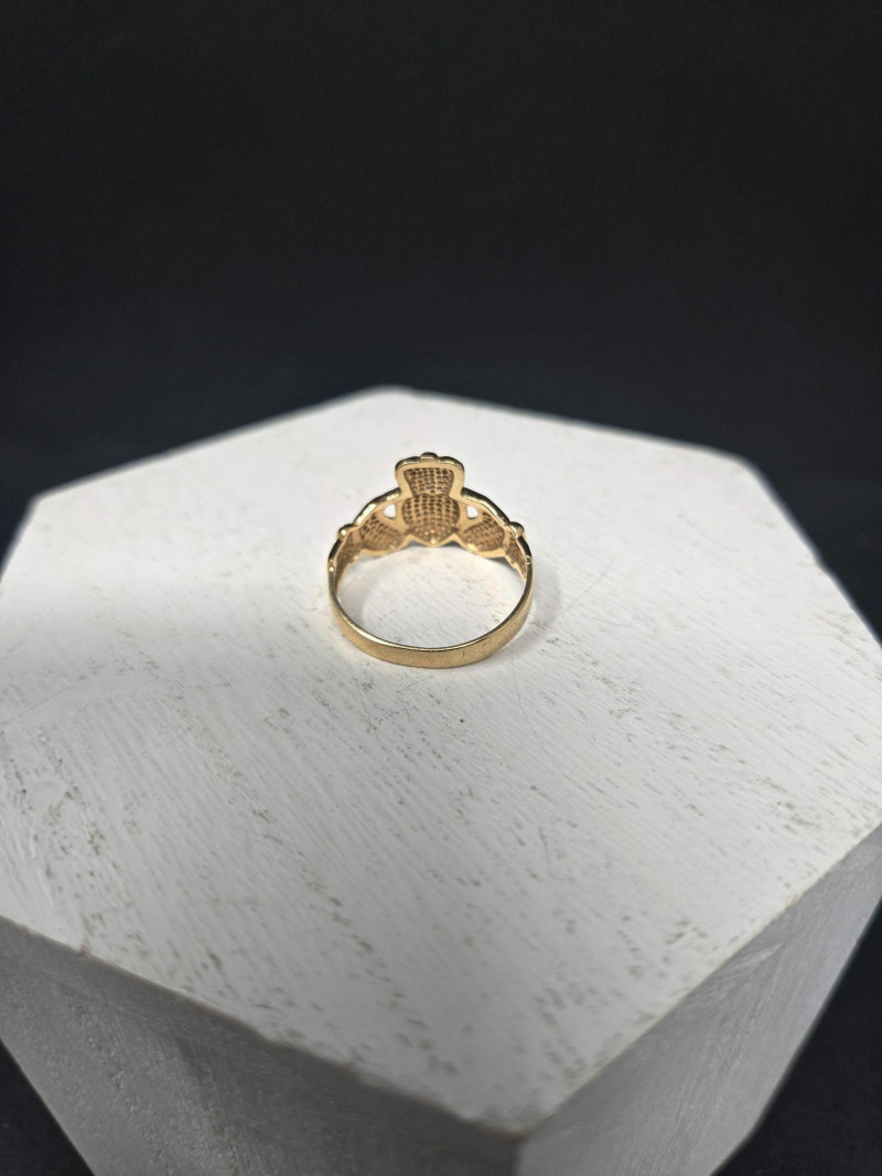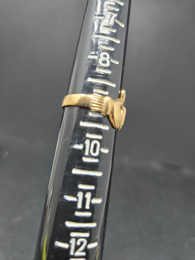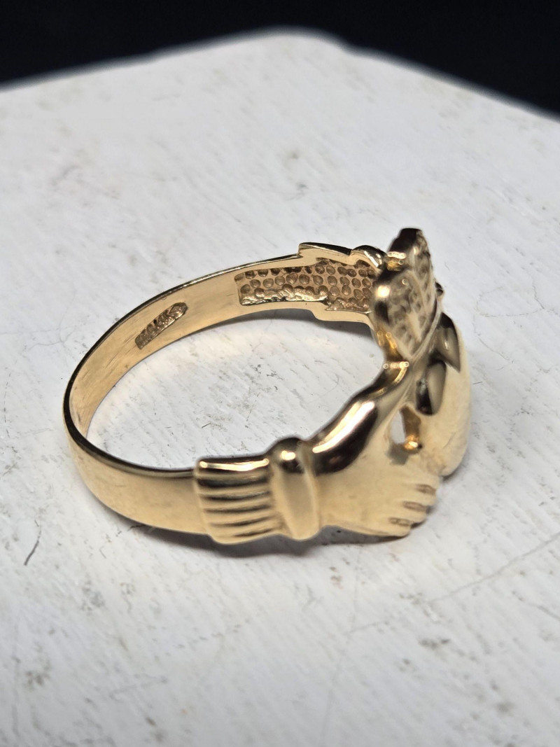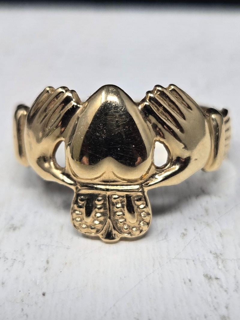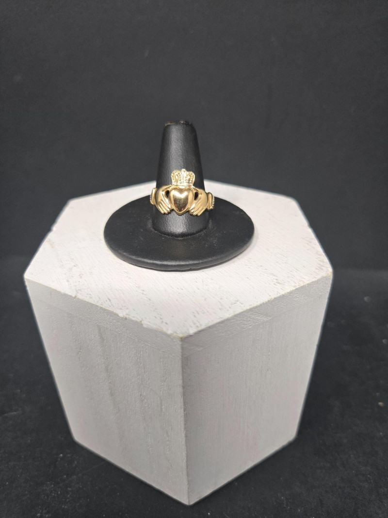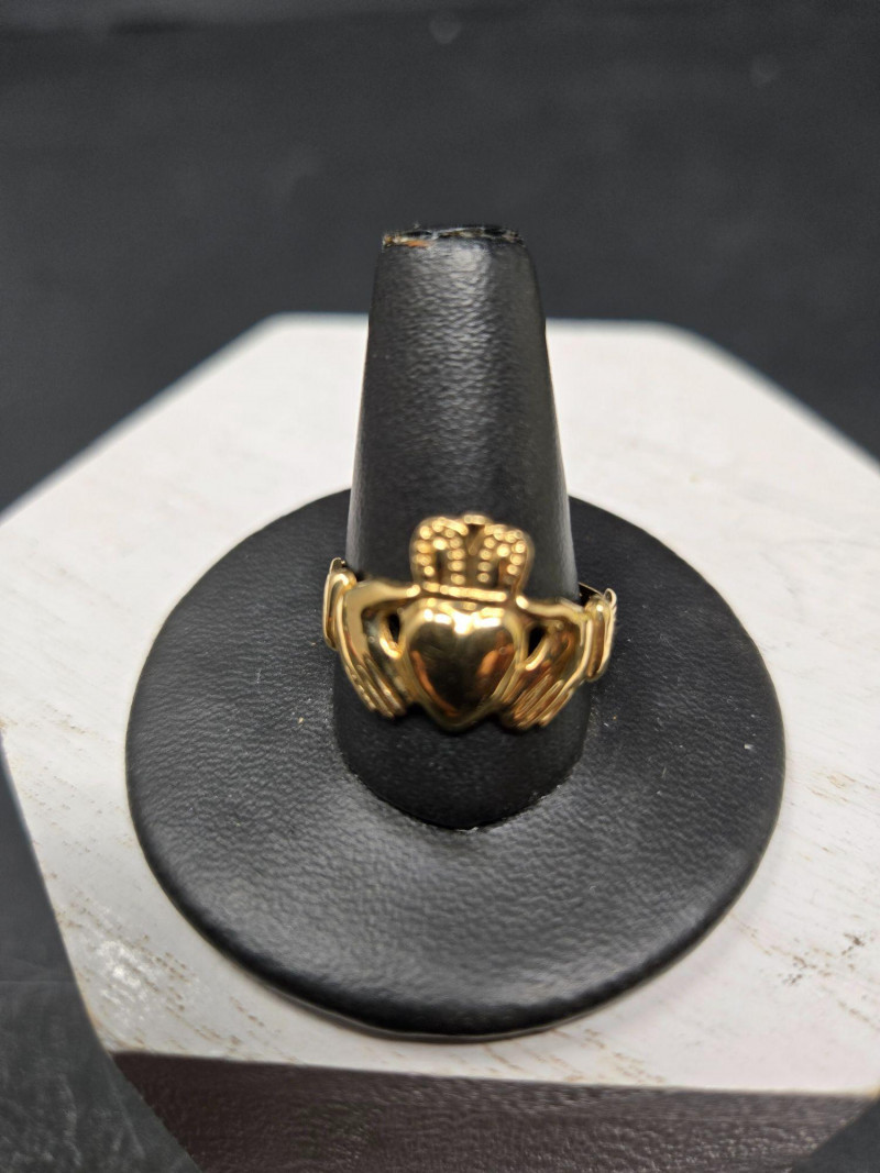 Material: Solid 14k gold, weighing 3.49 grams. Size: Ring size 9 Design: Traditional Claddagh motif—two hands holding a crowned heart, symbolizing friendship (hands), love (heart), and loyalty (crown). Finish: Polished gold with fine detailing