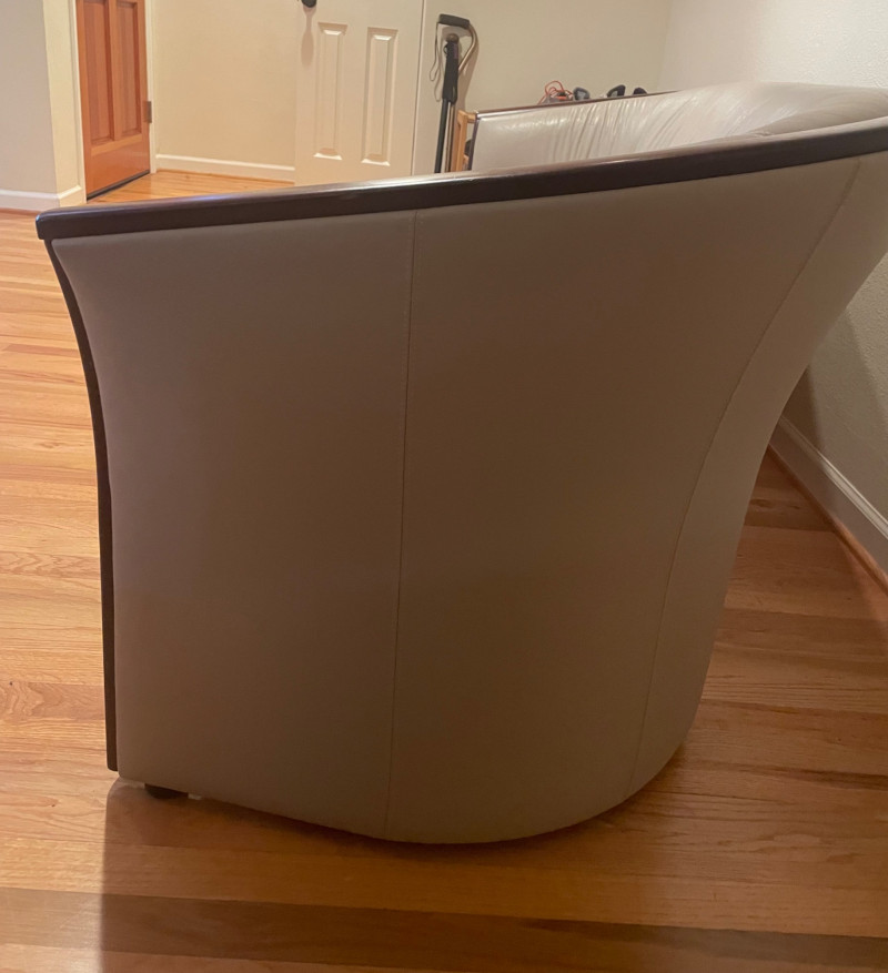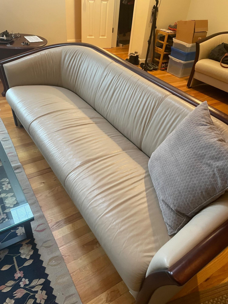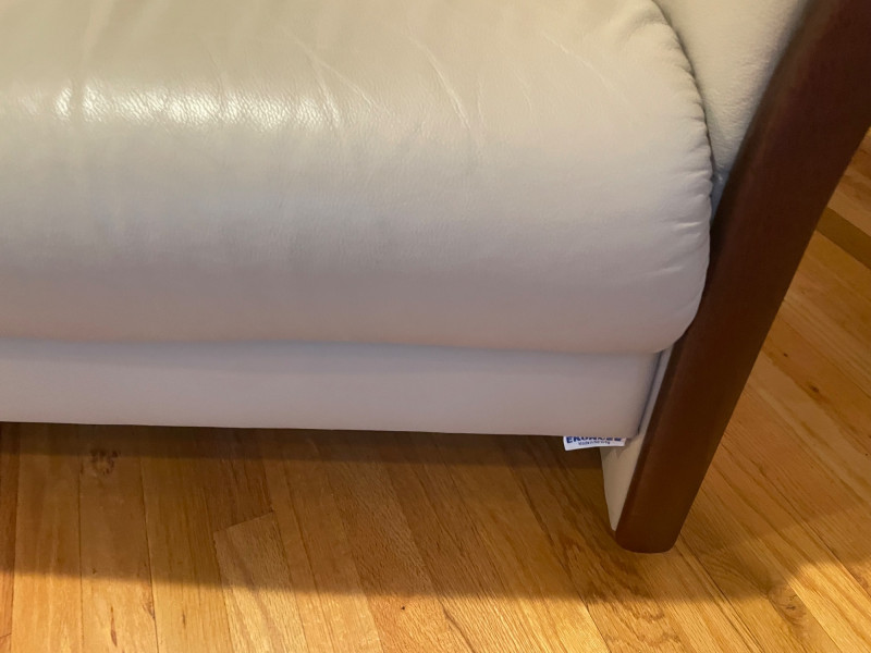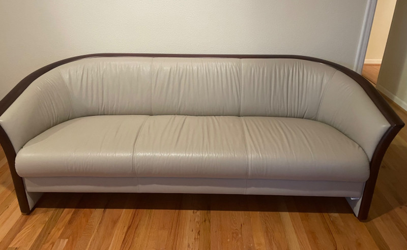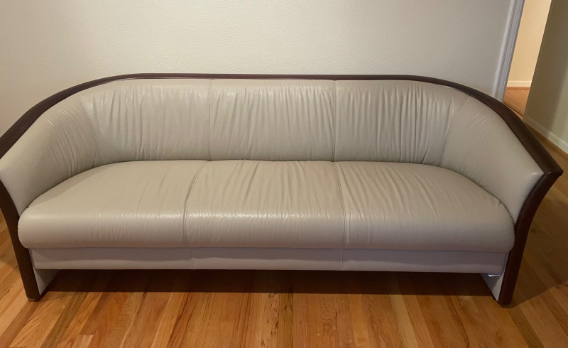 Ekornes Leather Couch Made in Norway, is a premium Scandinavian piece known for its ergonomic design and luxurious materials. Key features include: Supple leather upholstery: Smooth, high-quality leather in a rich neutral tone, offering both comfort and durability. Norwegian craftsmanship: Made by Ekornes, the renowned manufacturer behind the Stressless® brand, celebrated for its sleek lines and superior support. Three-seat configuration: Generously sized with contoured cushions and subtly curved armrests for a modern yet cozy silhouette. Dimensions: Approximately 31”H x 78” L; Seat 21” D x 72” L .