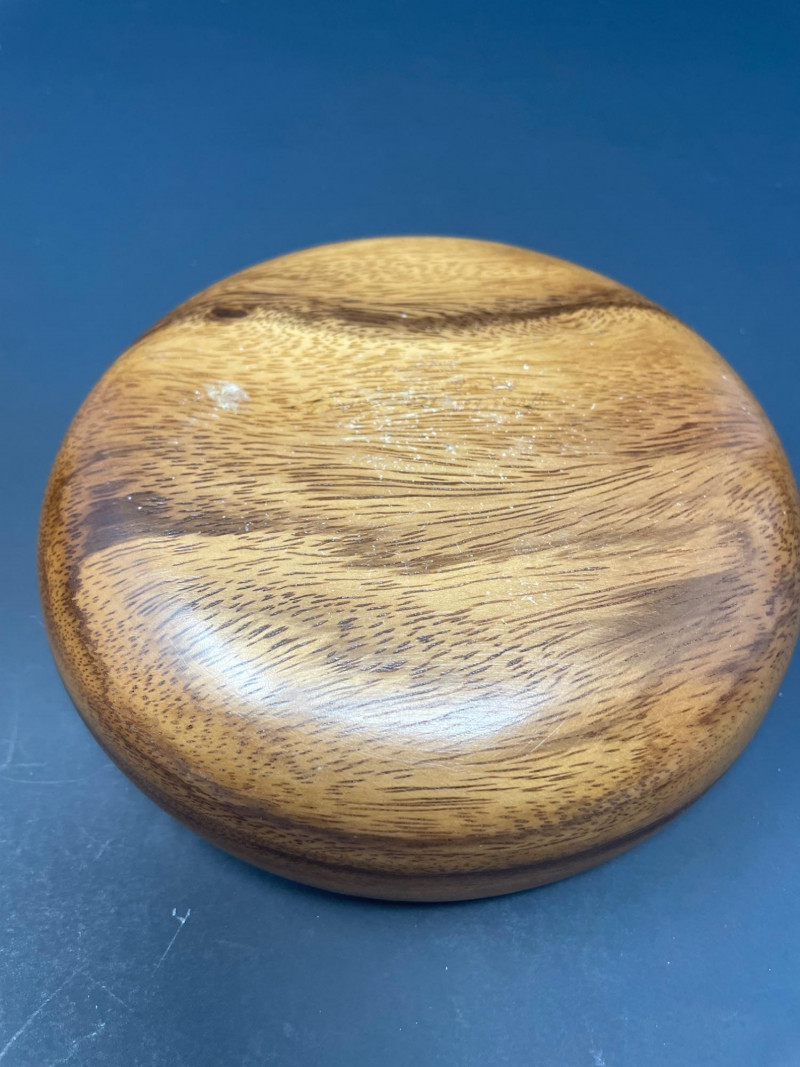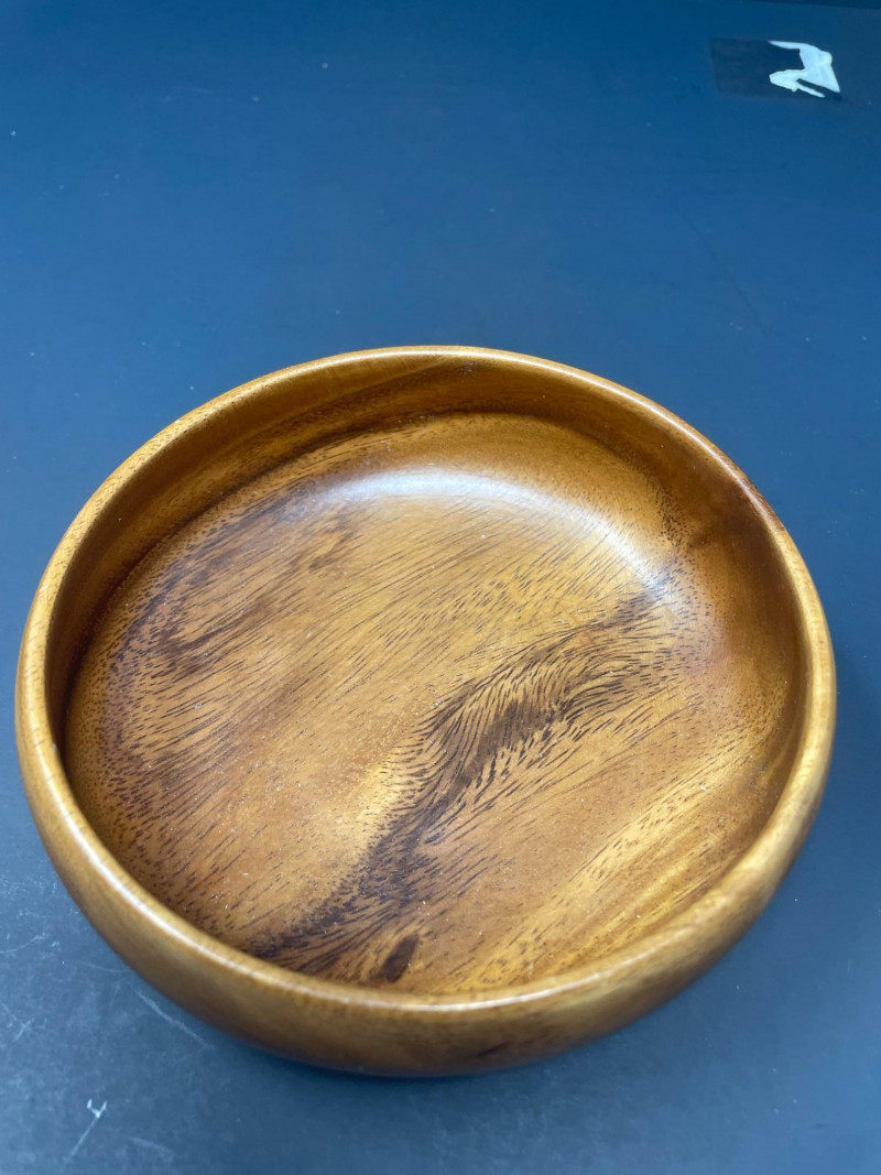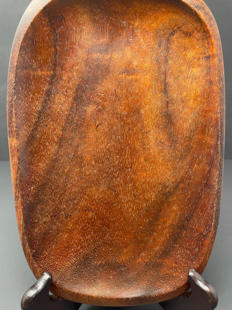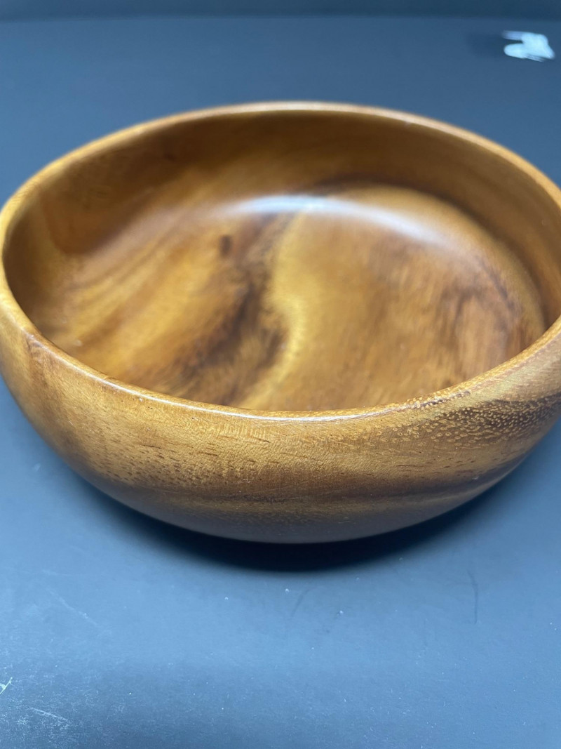 A small, versatile bowl with classic island styling. Expect normal wear consistent with vintage and handcrafted wood pieces. All items sold AS IS WHERE IS Dan DeLuz Wood Tray: 9” x 5 3/4” Shaker Wood Box: 10” x 7” x 2 1/2” H - NOTE: Undetermined Artist Signature on bottom of box House of Kain Wood Bowl: 5 34” Round x 2” HIncluded Pieces