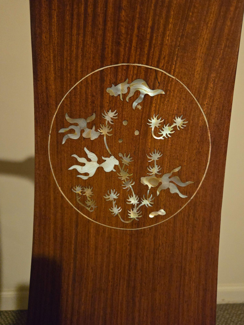 Polished hardwood with decorative inlay Excellent condition: structurally sound with light wear consistent with age