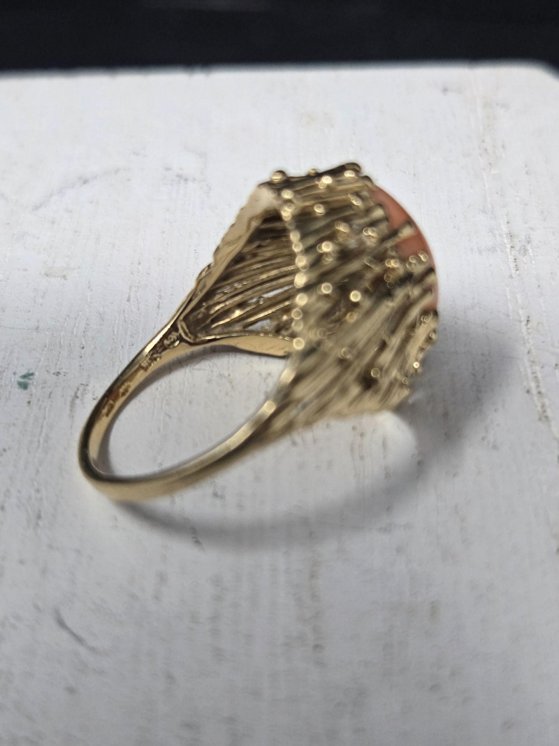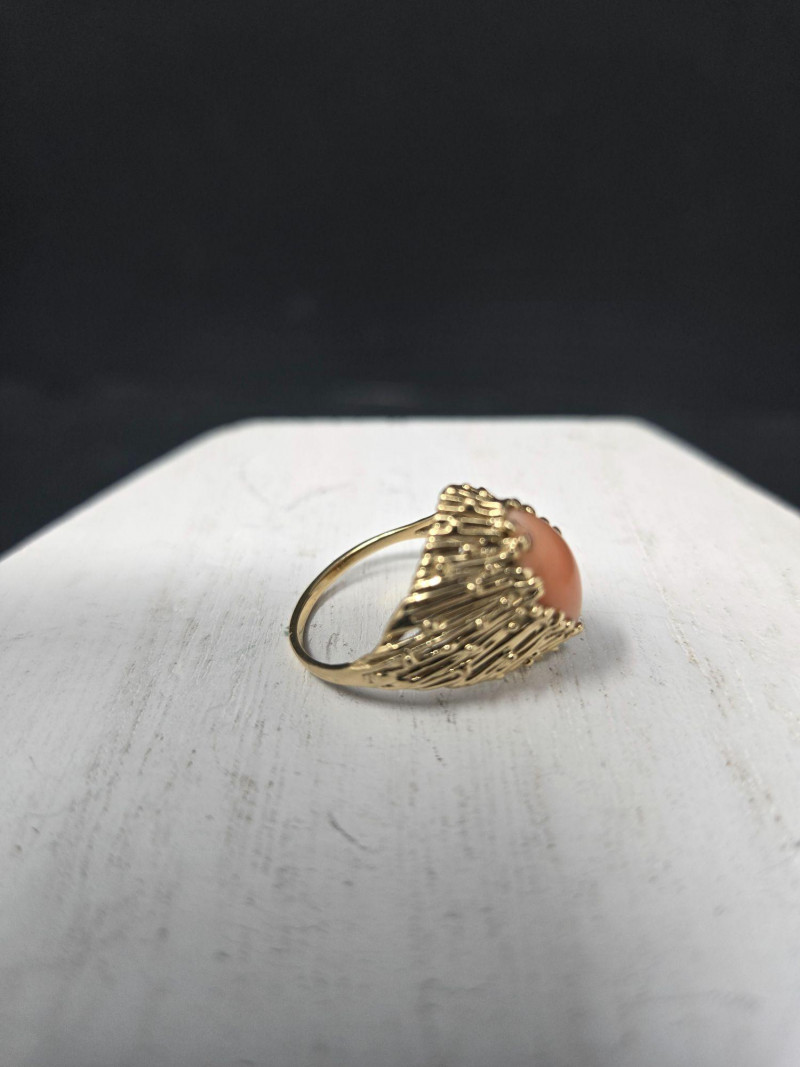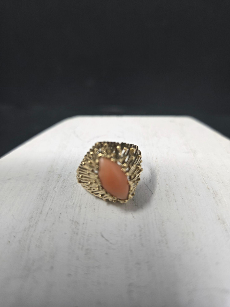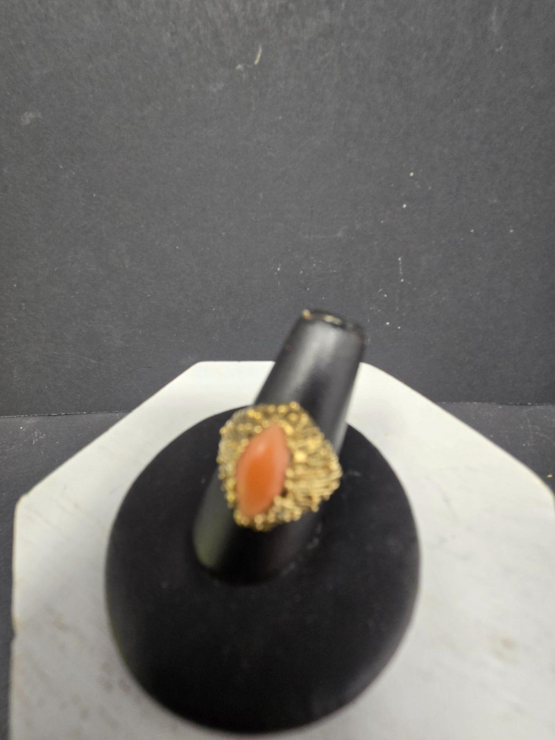 14k Gold Ring with Coral Stone, is a striking piece of vintage jewelry that blends warmth, elegance, and intricate craftsmanship. Material: Solid 14k gold, weighing 3.65 grams. Gemstone: Oval-shaped coral stone in a rich orange hue, set in a textured gold bezel. Size: Ring size 7 Design: Ornate setting with detailed goldwork that enhances the natural beauty of the coral.