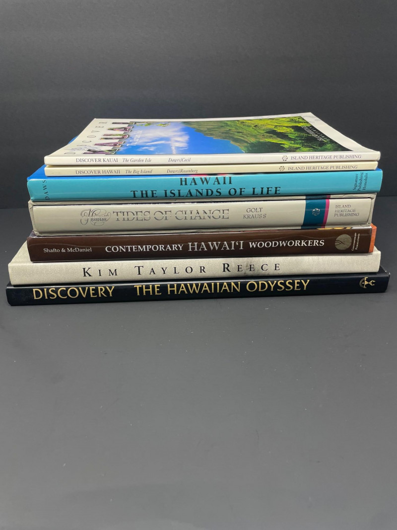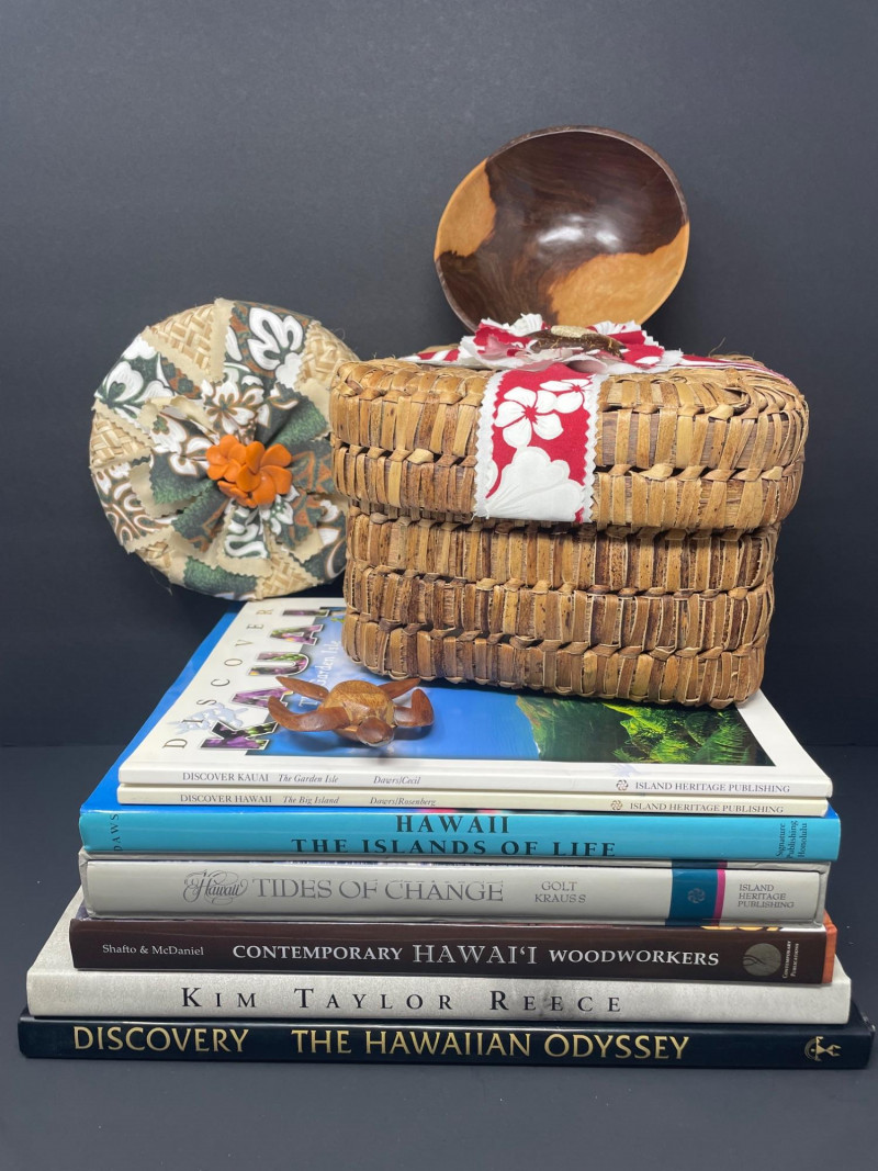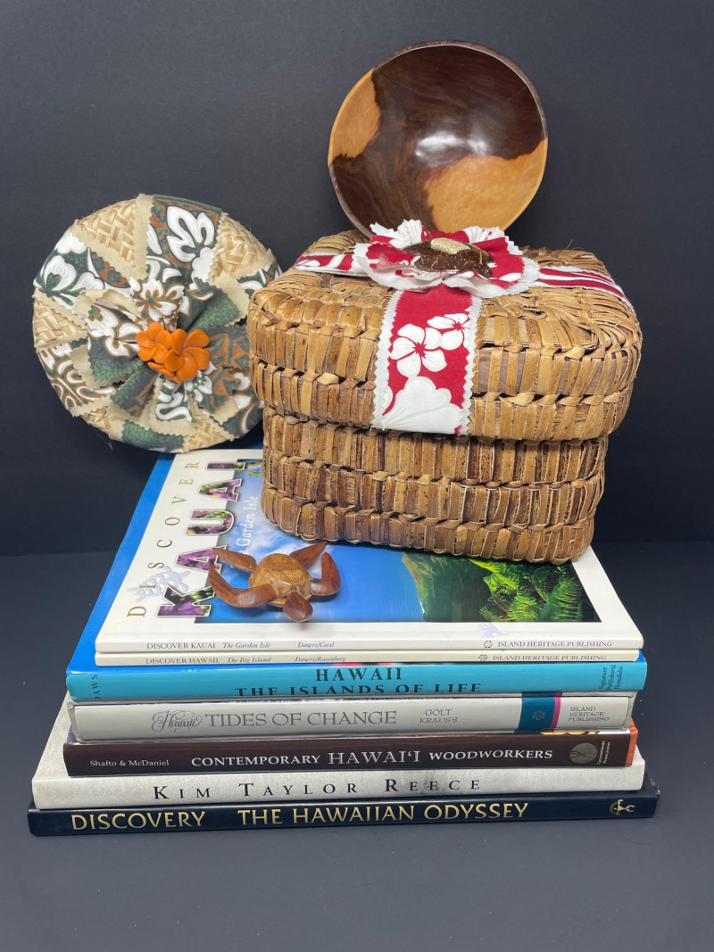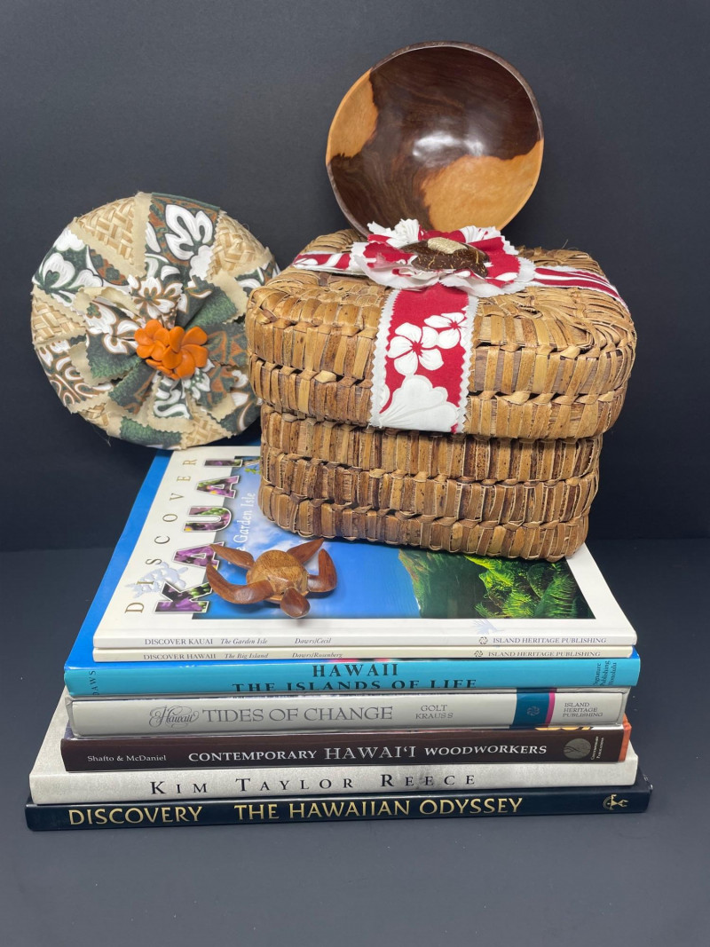 This curated lot includes: Books (7 total): Discover Kauai: The Garden Isle by Danni Grill Discover Hawaii: The Big Island by Danni Grill Hawaii: The Islands of Life Tides of Change by Colt Krauss Contemporary Hawaii Woodworkers by Shawfio & McDaniel Kim Taylor Reece (Hawaiian photography) Discovery: The Hawaiian Odyssey Decorative Accents: Woven basket with red-and-white hibiscus ribbon Two-tone wooden bowl Carved wooden sea turtle Circular woven floral ornament with orange flower center