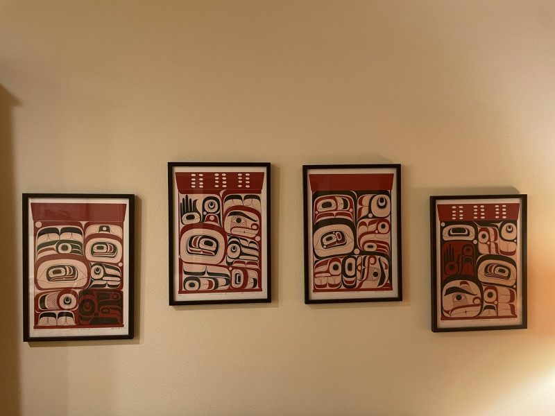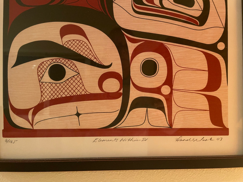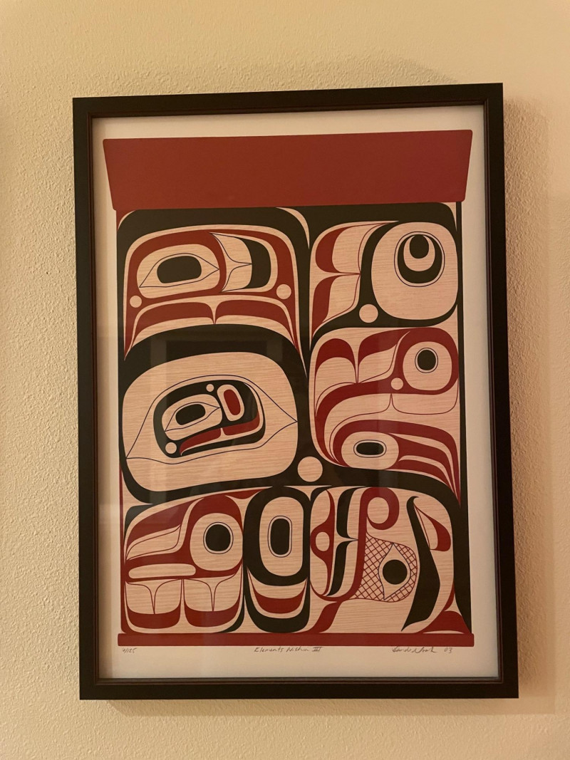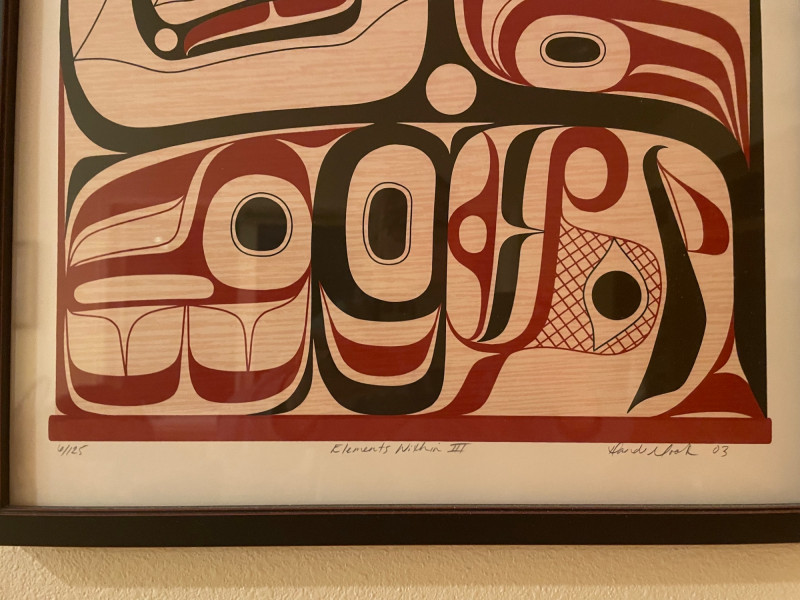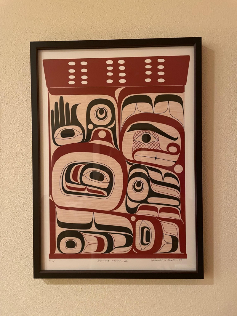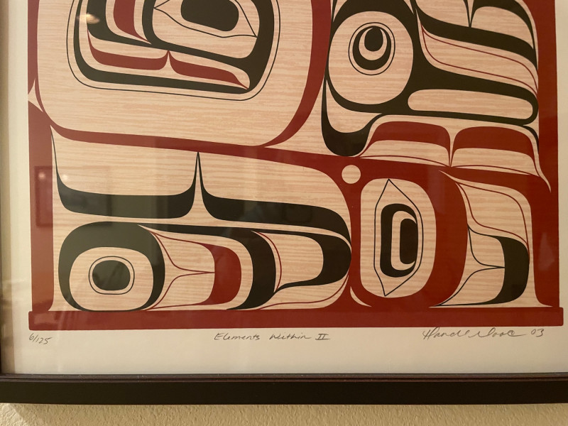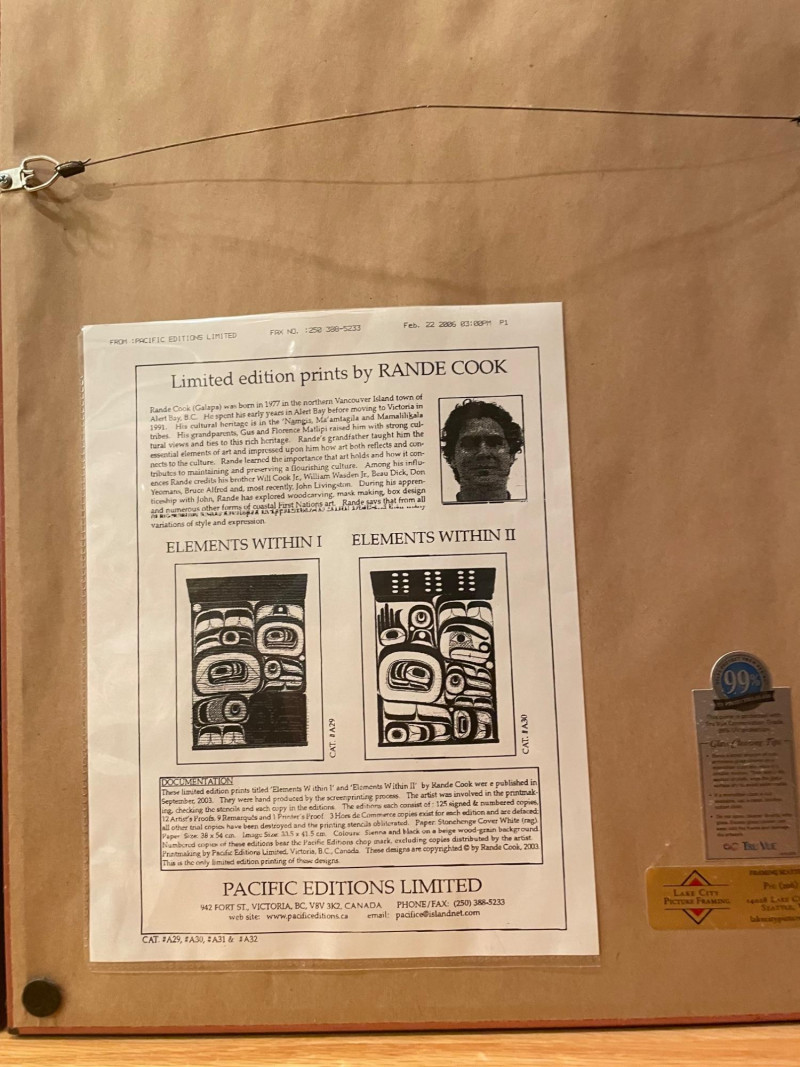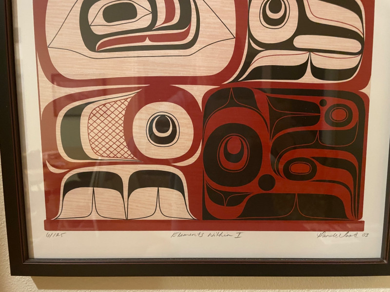 “Elements” 1–4, is a powerful quartet of framed prints by the acclaimed Kwakwaka’wakw artist. These works reflect Cook’s mastery of formline design and his contemporary approach to Indigenous storytelling. Highlights include: Stylistic precision: Each piece features bold black, red, and white shapes arranged in symmetrical, abstract compositions that evoke faces, eyes, and elemental forces. Cultural symbolism: The red bands with white ovals across the top of three prints may represent traditional motifs such as salmon eggs, ceremonial regalia, or spiritual markers. Presentation: Professionally framed and matted, ready for display as a cohesive set or individual statement pieces. Dimensions: Each Framed print measures approximately 22 1/2” H x 16” W Signed by Artist Rande Cook’s work bridges ancestral tradition and modern expression.