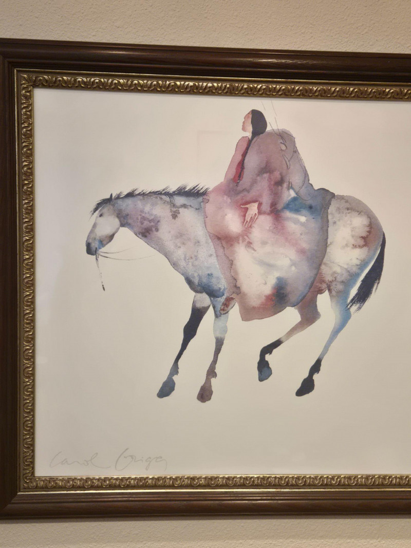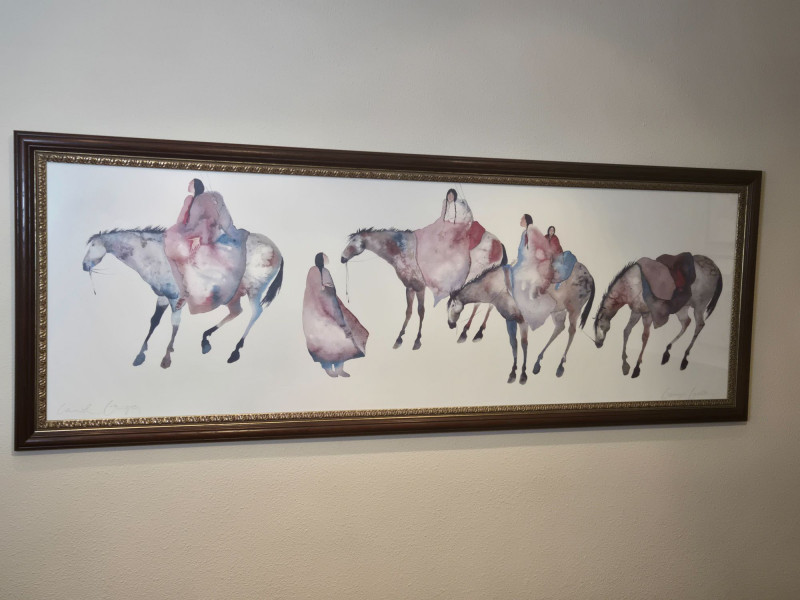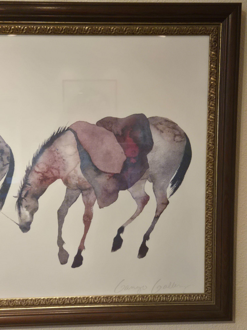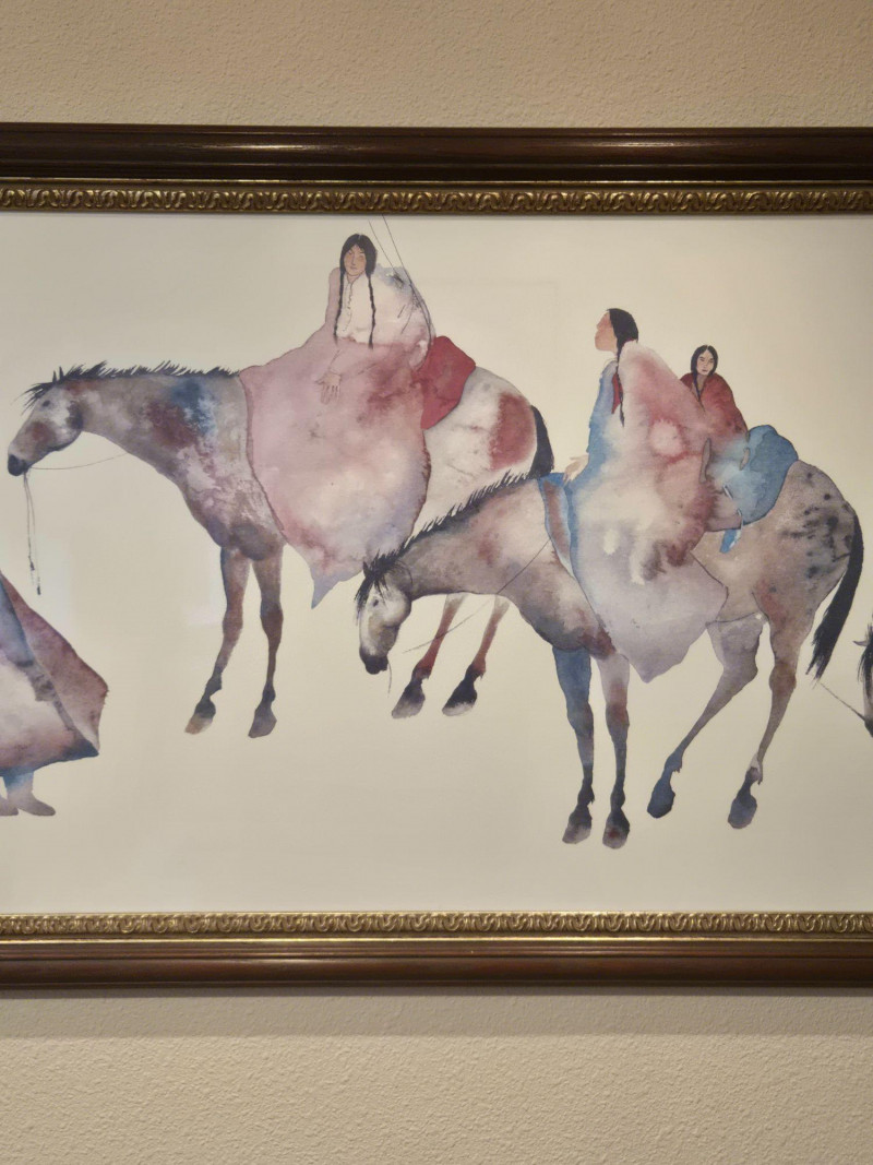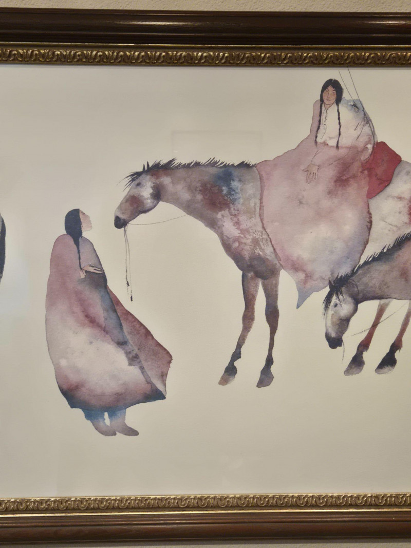 Artwork Description: Ethereal depiction of Native American figures with horses Soft brushwork and muted tones of pink, blue, and brown Stylized forms emphasize movement and serenity Signed in both lower corners, indicating authenticity or limited editionCarol Grigey Native American Print – Gango Gallery Edition