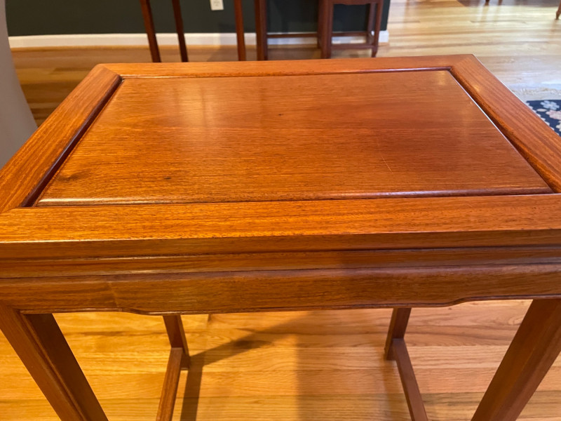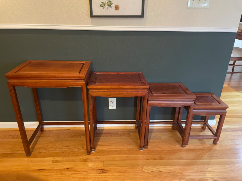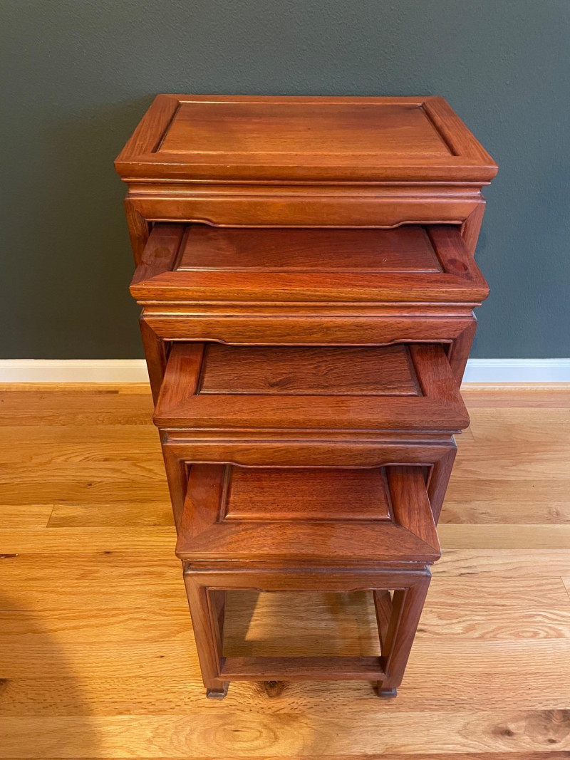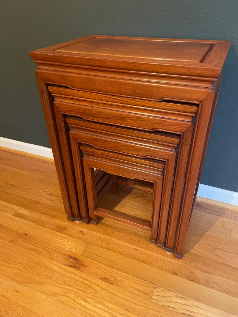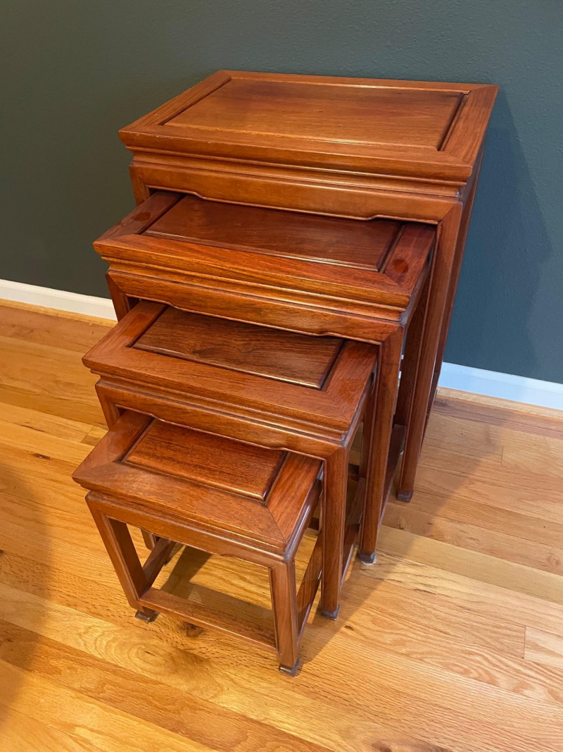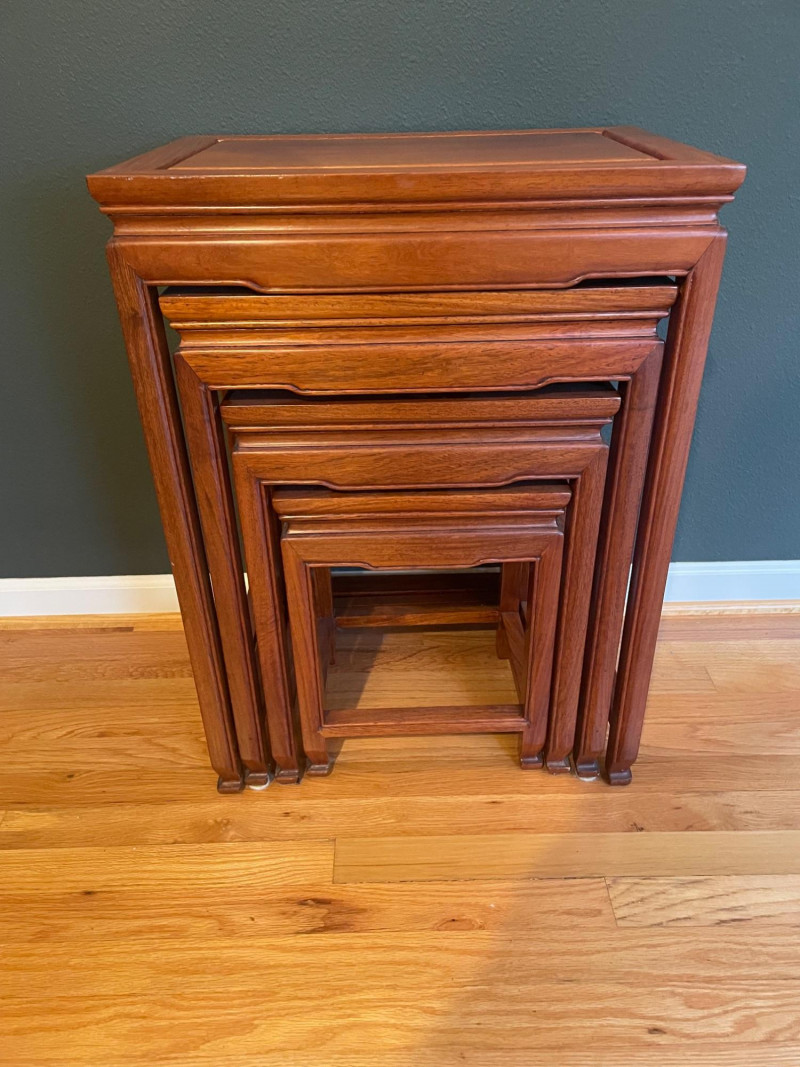 Small 15 1/2” H x 12” W x 10” D Medium 19 1/2” H x 14 1/2” W x 11 1/2” D Large 23 1/2” H x 17” W x 12 1/2” D Ex Large 27”H x 20” W x 14” D Set of Four Nesting Tables, offers a classic blend of elegance and functionality. These polished wood tables feature: Space-saving design: Each table fits neatly beneath the next, ideal for flexible use in living rooms or sitting areas. Rich reddish-brown finish: Warm tones and beveled edges lend a refined, traditional aesthetic. Graduated sizing: Ranging from approximately 27” x 20” x 14” down to 15” x 12” x 10”, providing versatility for display or serving.