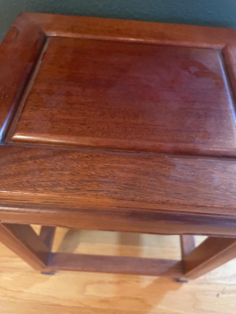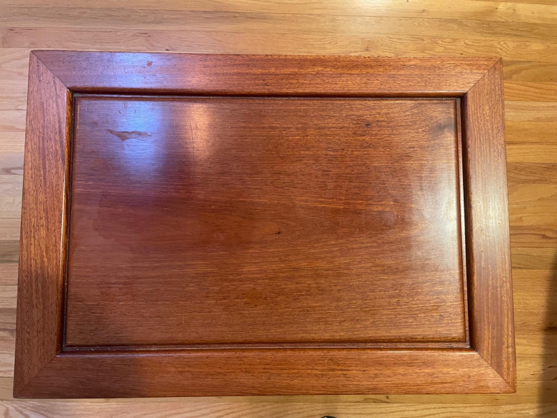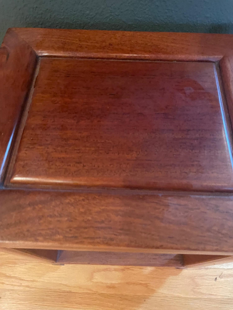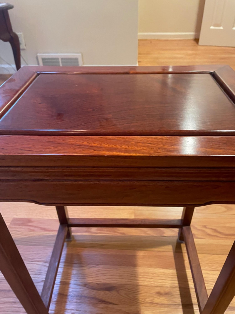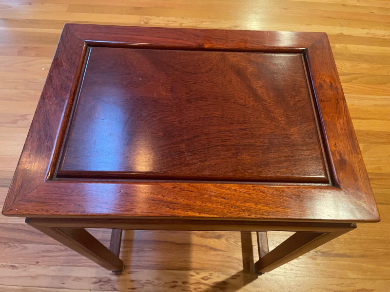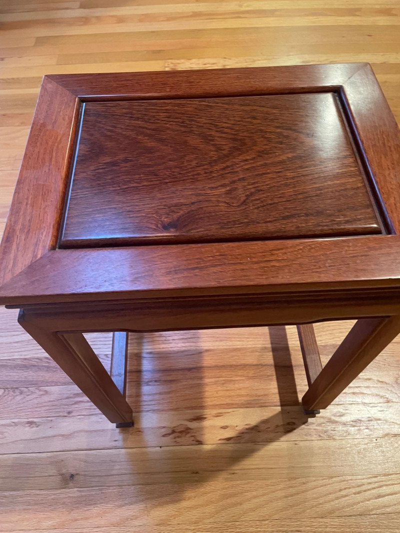 Small 15 1/2” H x 12” W x 10” D Medium 19 1/2” H x 14 1/2” W x 11 1/2” D Large 23 1/2” H x 17” W x 12 1/2” D Ex Large 27”H x 20” W x 14” D Set of Four Nesting Tables, offers a classic blend of elegance and functionality. These polished wood tables feature: Space-saving design: Each table fits neatly beneath the next, ideal for flexible use in living rooms or sitting areas. Rich reddish-brown finish: Warm tones and beveled edges lend a refined, traditional aesthetic. Graduated sizing: Ranging from approximately 27” x 20” x 14” down to 15” x 12” x 10”, providing versatility for display or serving.