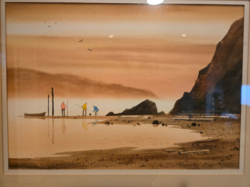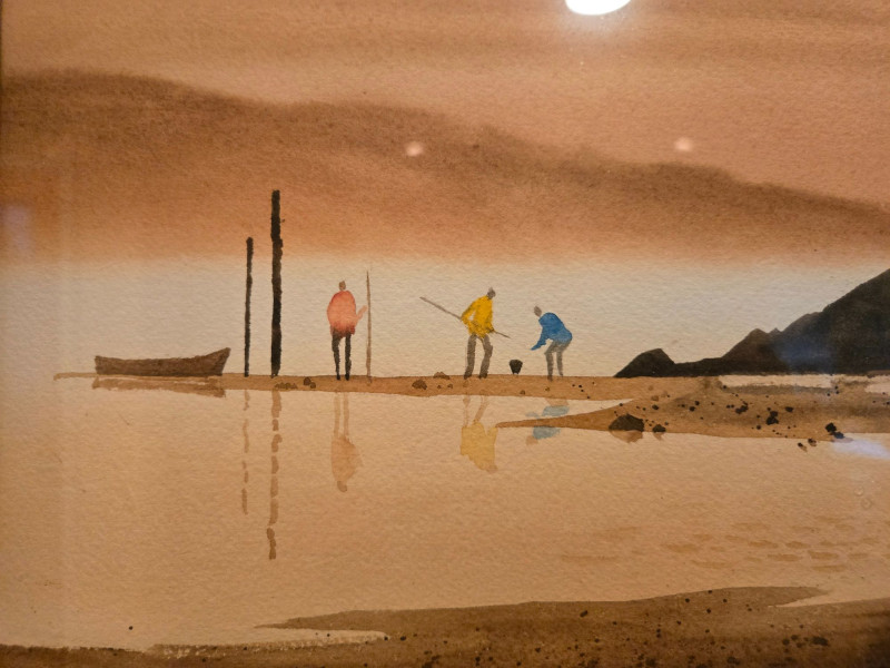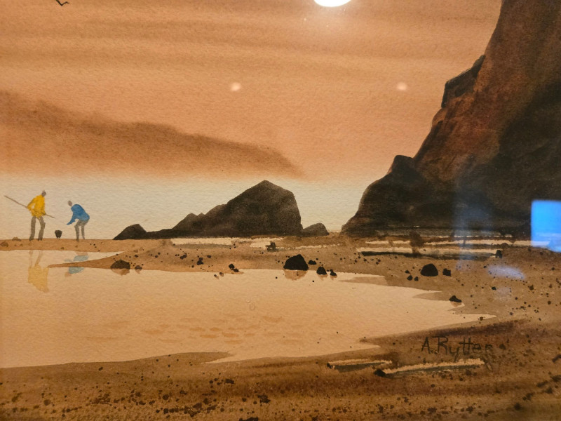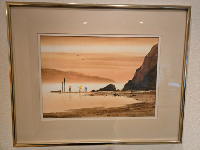 Artwork Description: Serene shoreline with three figures near the water, possibly fishing Warm hues of orange and pink reflect across calm waters Rocky cliff, moored boat, and birds in flight add depth and motion Signed in lower right corner, original or limited-edition piece“Chowder Weather” Watercolor by Ann Rutter – Framed Coastal Scene