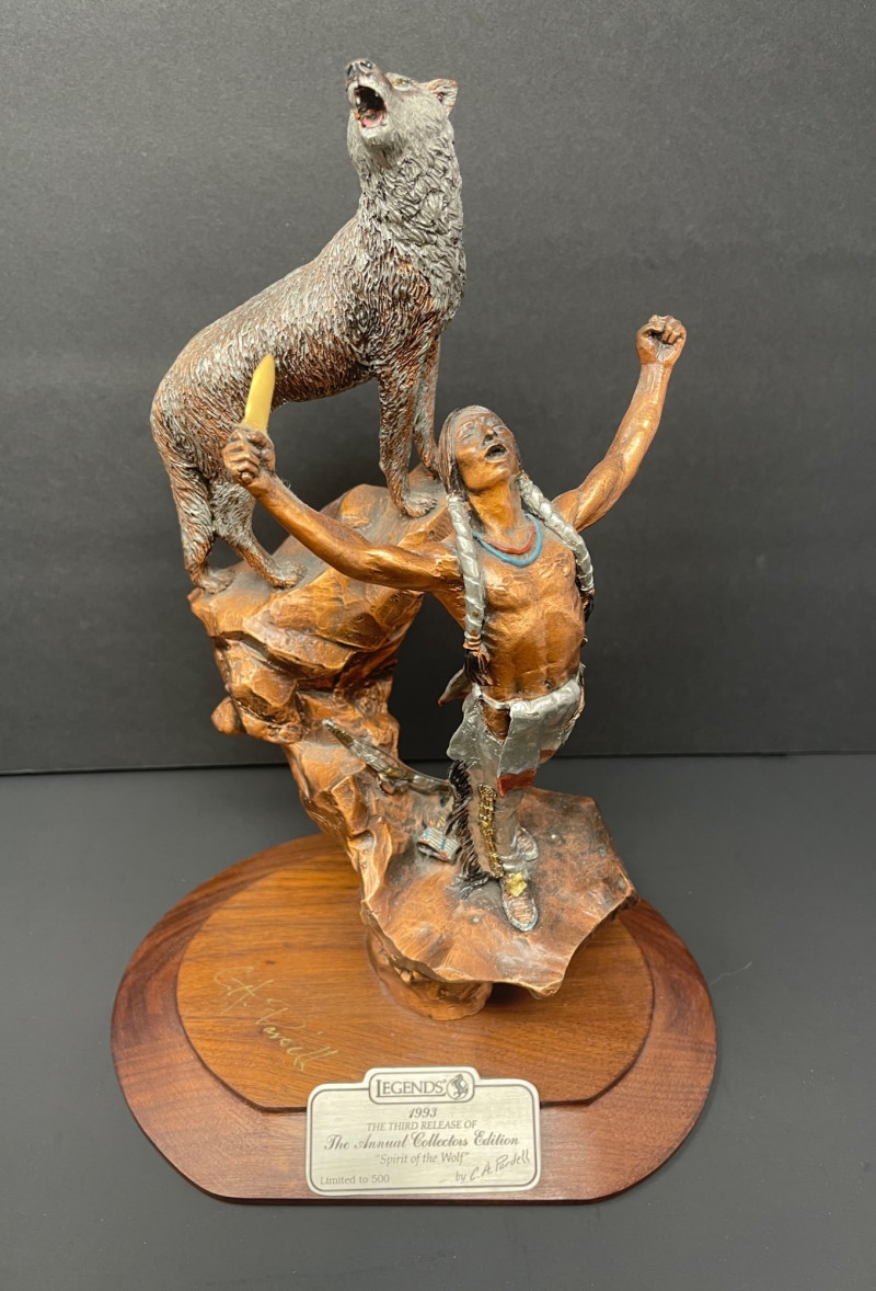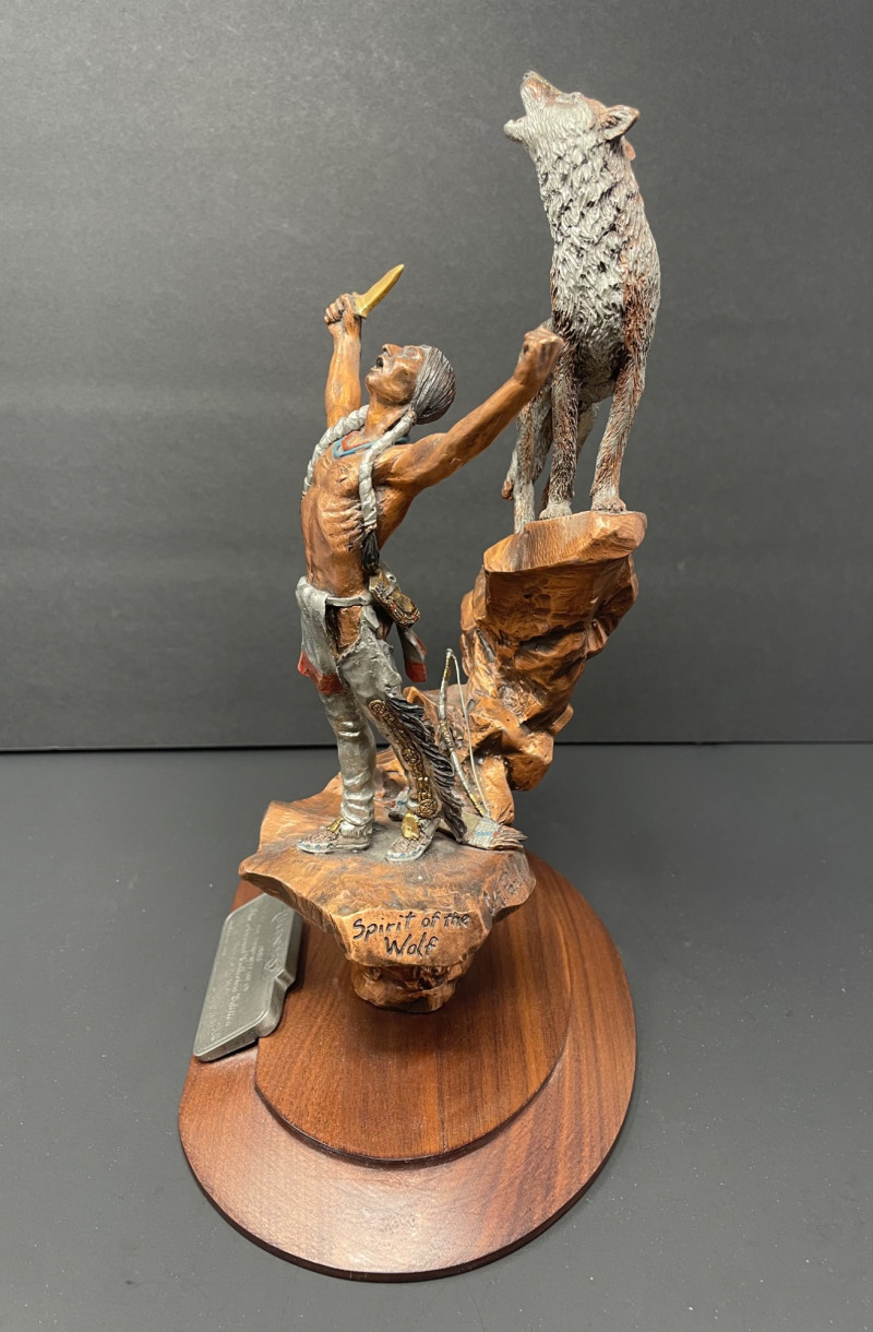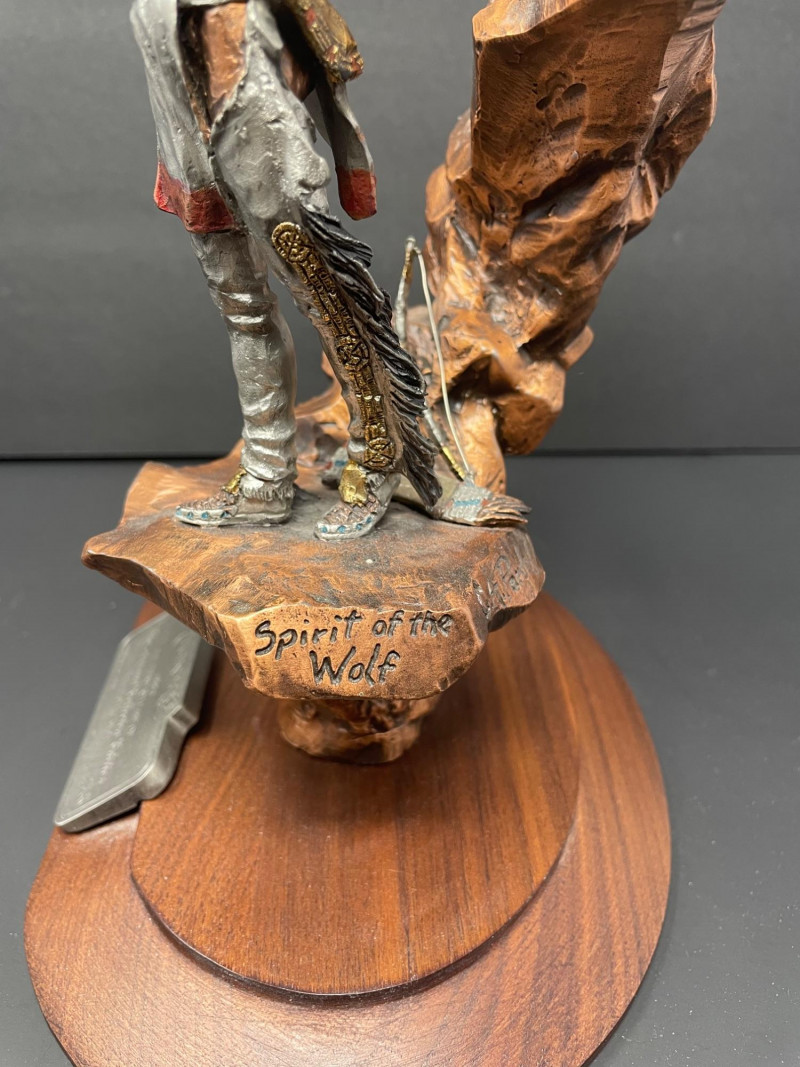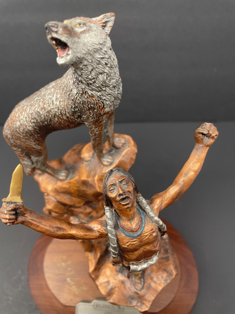 This detailed sculpture features a Native American figure with braided hair and traditional attire, standing atop a rocky formation with arms raised in a ceremonial pose. Behind the figure, a howling wolf echoes the spiritual connection between human and animal. The piece is mounted on a polished wooden base with an engraved plaque. Title: Spirit of the Wolf Series: Legends – Third Annual Collectors Edition Artist: C.A. Pardell Year: 1993 Edition: Limited to 500 pieces Materials: Mixed media with bronze-style finish Base: Wood with engraved plaque Condition: Excellent; no visible damage