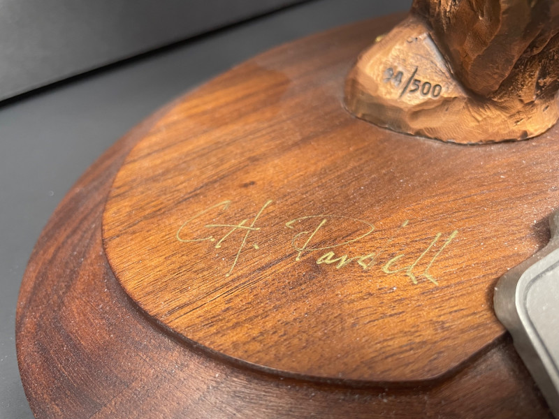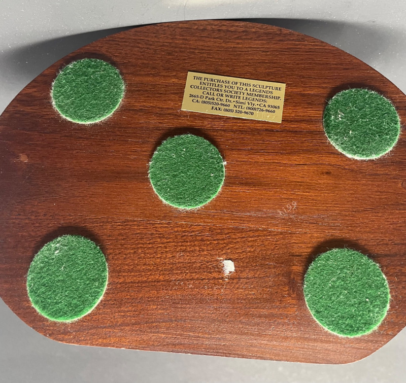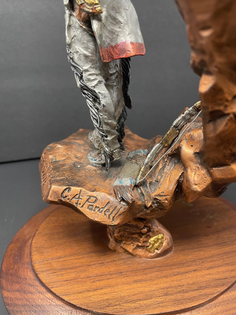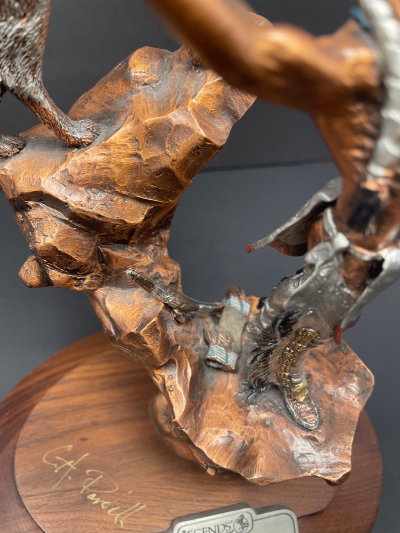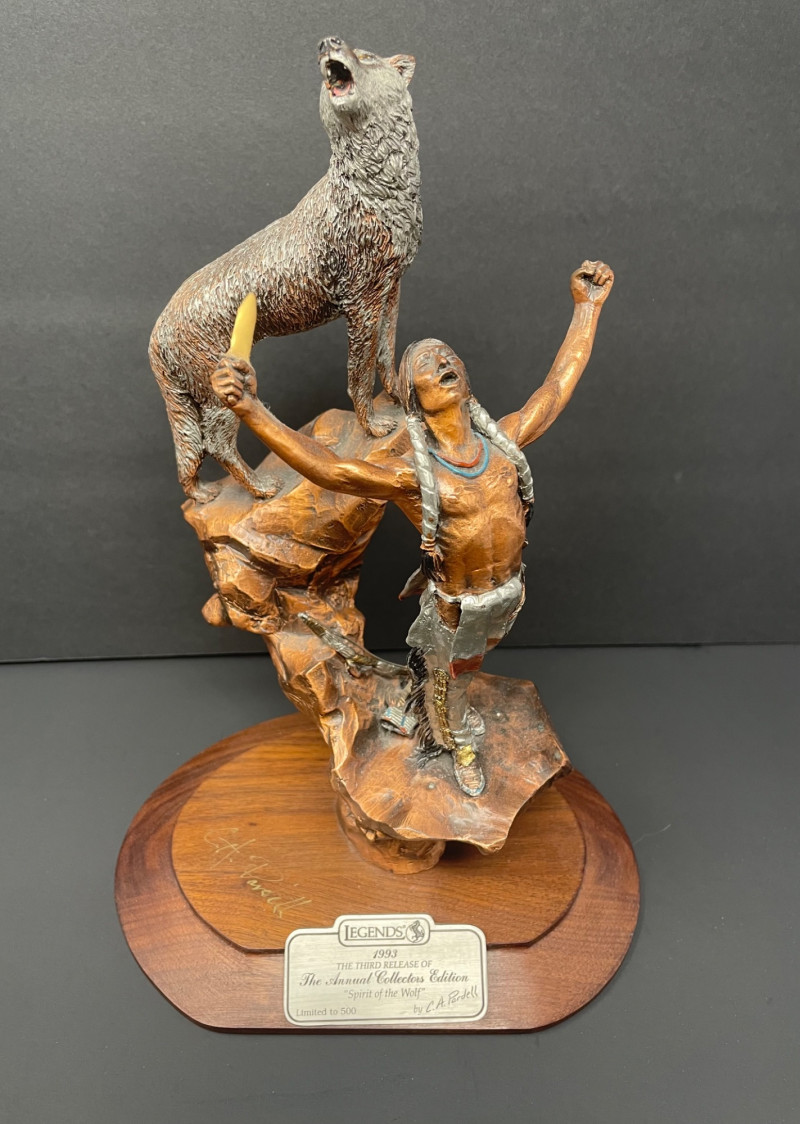 This detailed sculpture features a Native American figure with braided hair and traditional attire, standing atop a rocky formation with arms raised in a ceremonial pose. Behind the figure, a howling wolf echoes the spiritual connection between human and animal. The piece is mounted on a polished wooden base with an engraved plaque. Title: Spirit of the Wolf Series: Legends – Third Annual Collectors Edition Artist: C.A. Pardell Year: 1993 Edition: Limited to 500 pieces Materials: Mixed media with bronze-style finish Base: Wood with engraved plaque Condition: Excellent; no visible damage