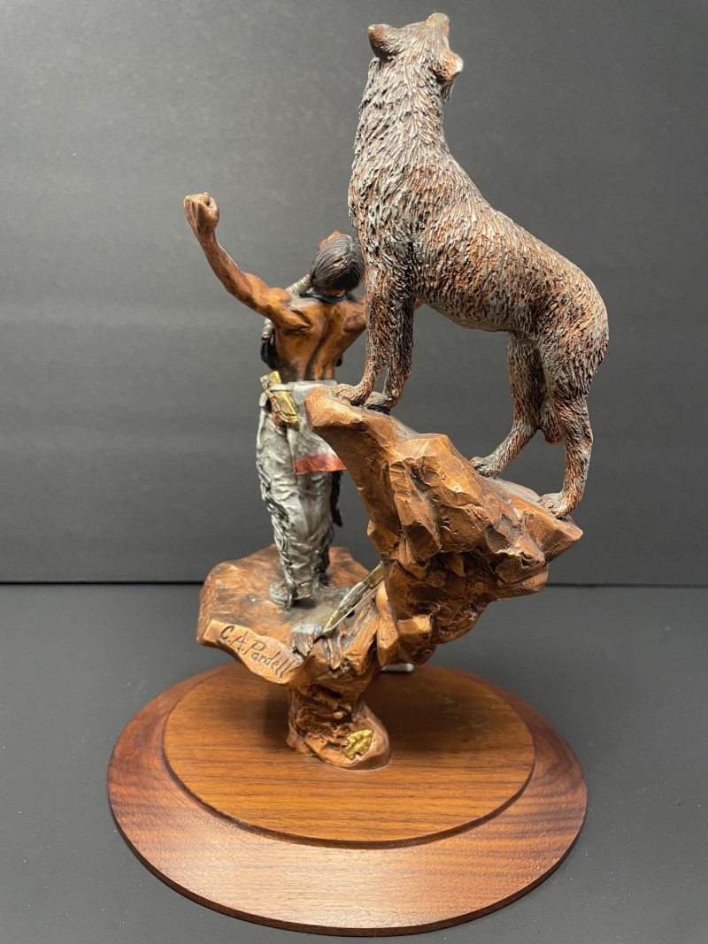 Limited edition bronze-finish statue by C.A. Pardell—Native American figure with howling wolf on rocky base Description