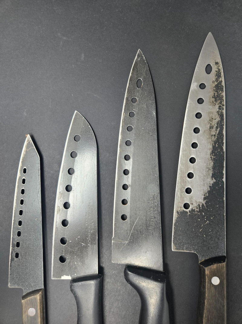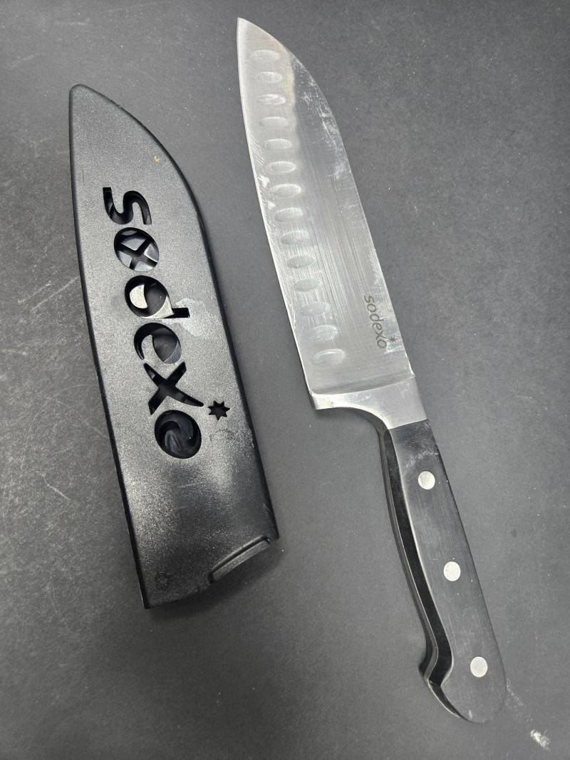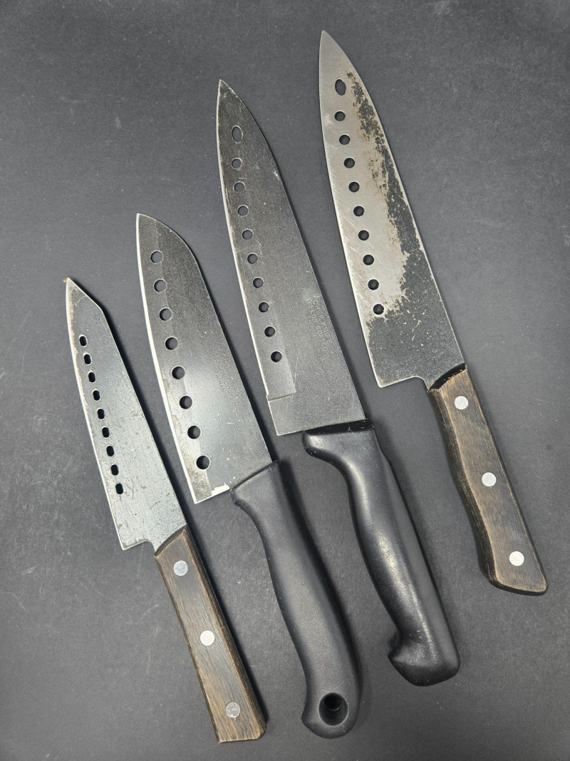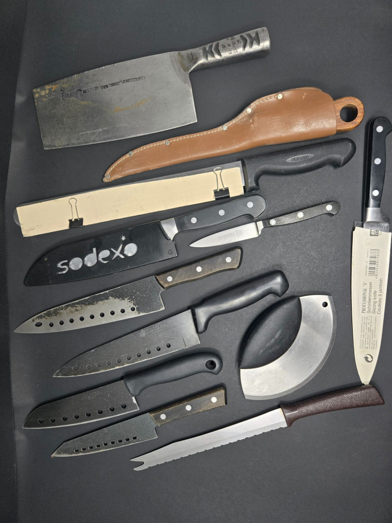 Knife Types & Brands: Chef’s knives, cleavers, paring knives, serrated slicers, and specialty blades Brands include Henkle, Sodexo, Tramontina, Franklin 3, Knife Germany, Montana Work Includes a mezzaluna (curved chopping knife) and a leather-sheathed utility knife Features & Accessories: Stainless steel blades with comfort grip handles Knife with leather sheath and wood loop for outdoor or field use White knife holder secured with binder clips for safe storage Some blades marked with Asian characters and “KAI” branding Culinary Knives Collection – Henkle, Knife Germany, Montana Work & More