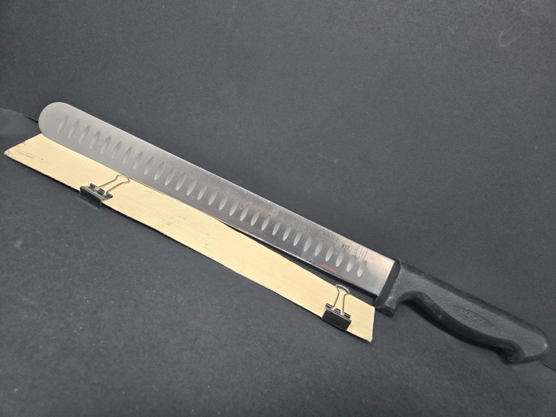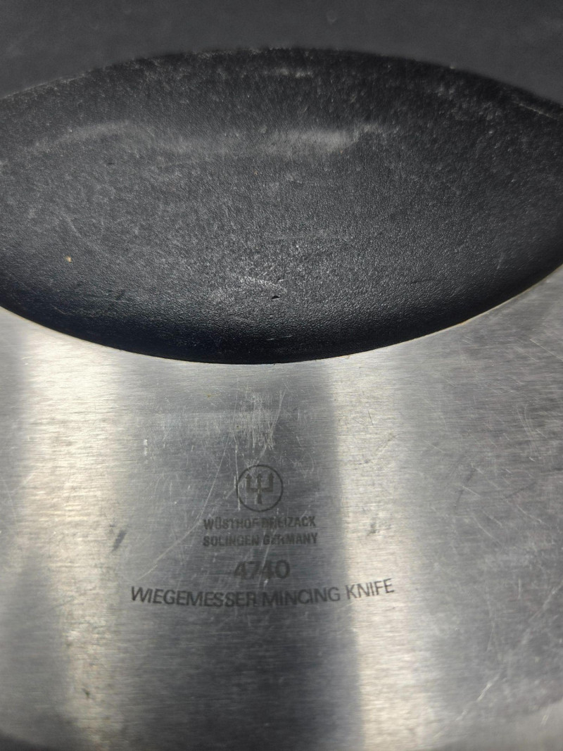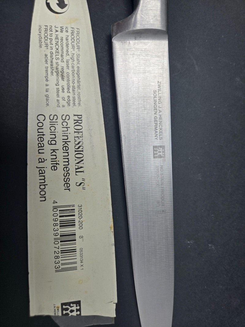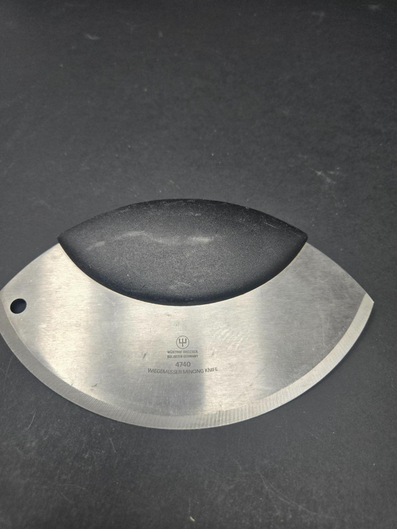 Knife Types & Brands: Chef’s knives, cleavers, paring knives, serrated slicers, and specialty blades Brands include Henkle, Sodexo, Tramontina, Franklin 3, Knife Germany, Montana Work Includes a mezzaluna (curved chopping knife) and a leather-sheathed utility knife Features & Accessories: Stainless steel blades with comfort grip handles Knife with leather sheath and wood loop for outdoor or field use White knife holder secured with binder clips for safe storage Some blades marked with Asian characters and “KAI” branding Culinary Knives Collection – Henkle, Knife Germany, Montana Work & More