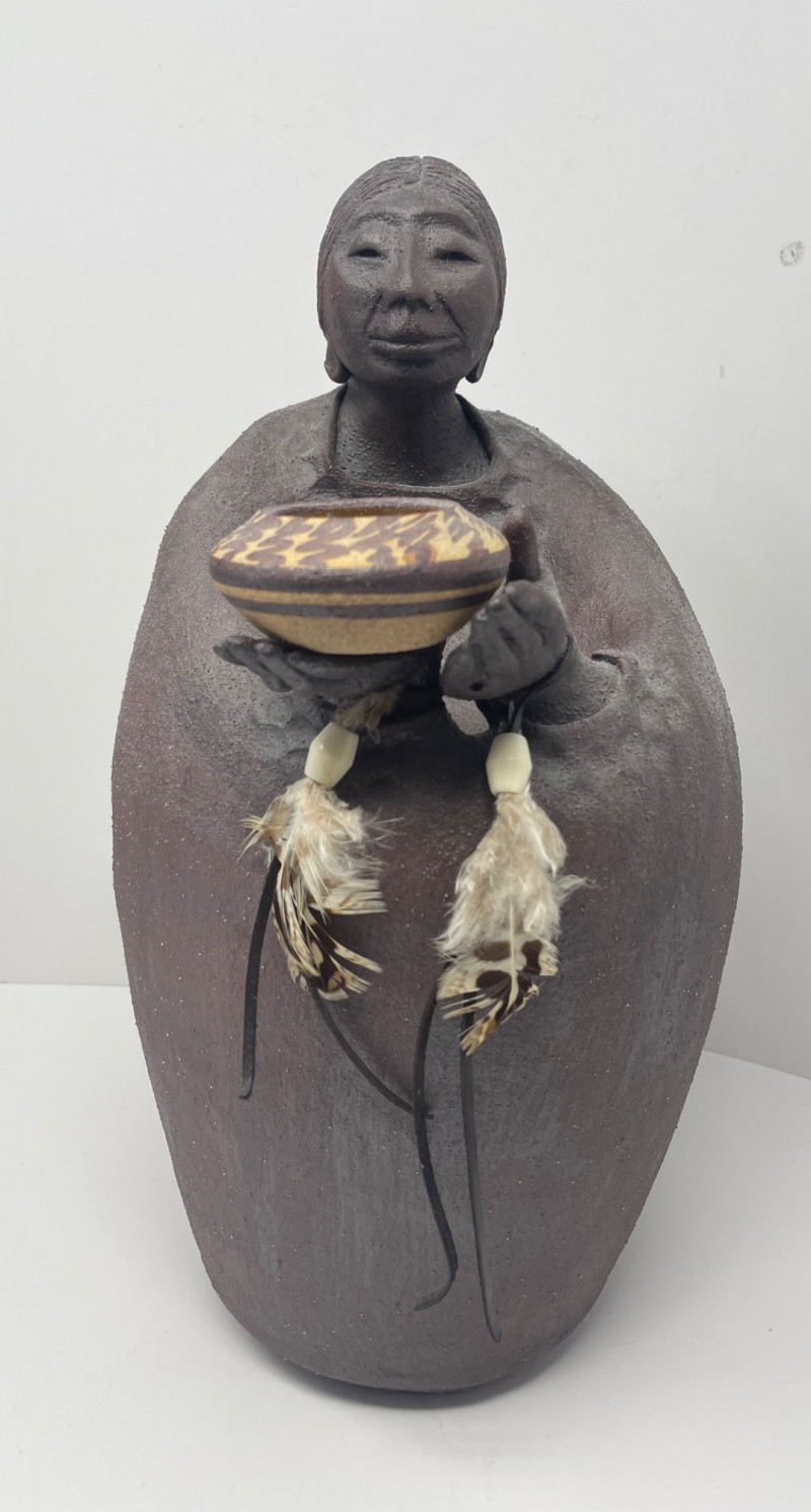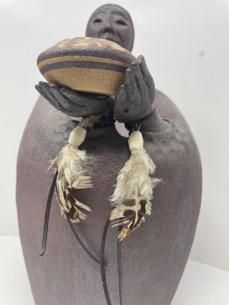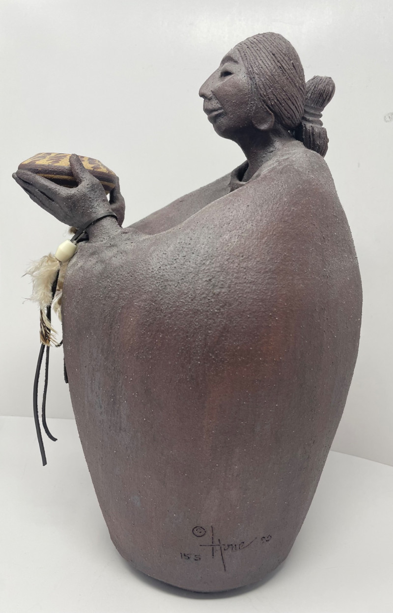 “American Story Teller” by Hone – 1990 is a soulful ceramic sculpture that honors Indigenous tradition through expressive form and symbolic detail. Handcrafted figure with bowl and feathered adornments—signed and culturally evocative Description