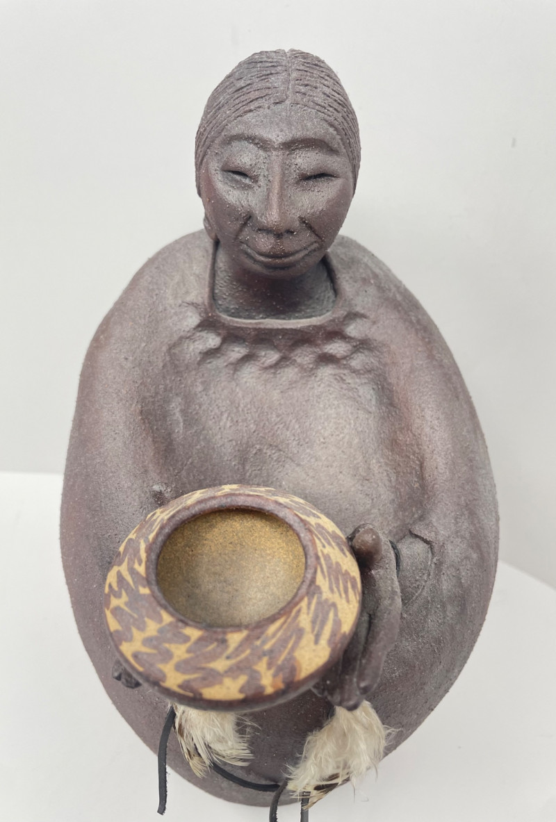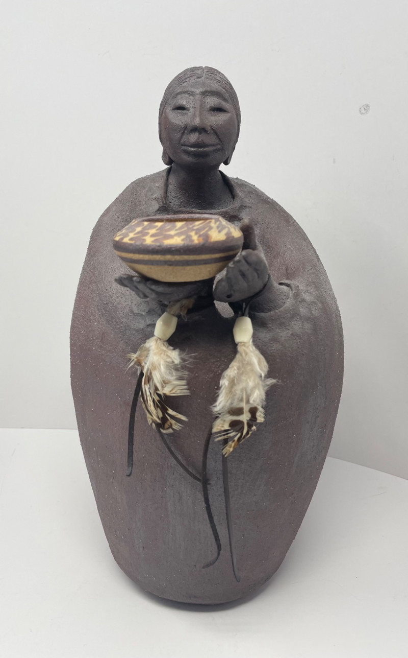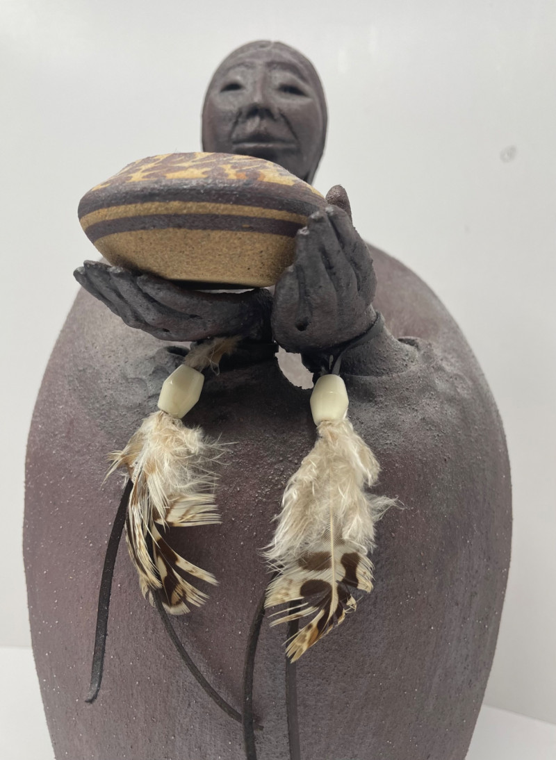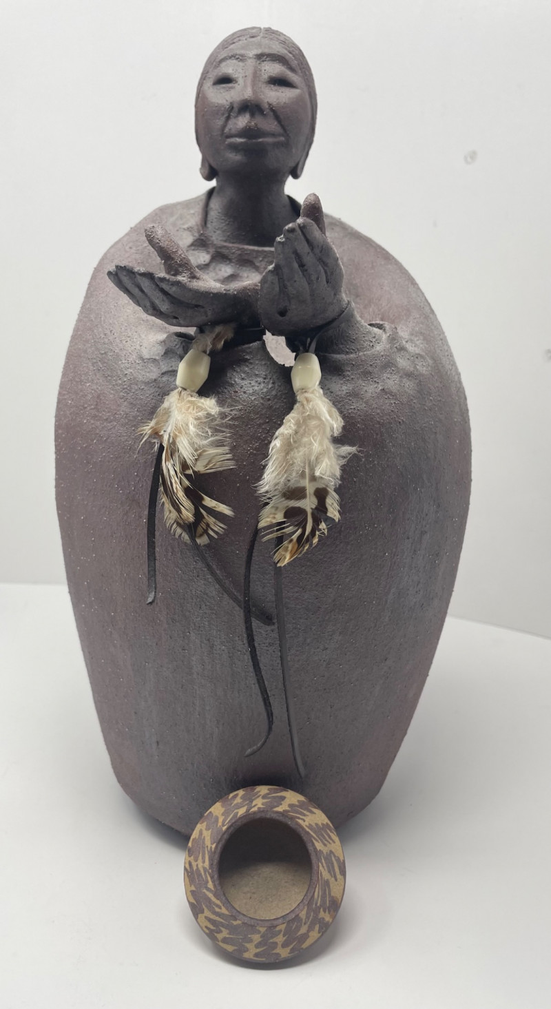 “American Story Teller” by Hone – 1990 is a soulful ceramic sculpture that honors Indigenous tradition through expressive form and symbolic detail. Handcrafted figure with bowl and feathered adornments—signed and culturally evocative Description