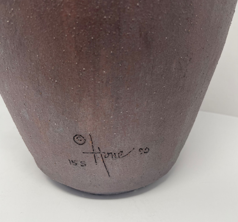 This dark clay sculpture by Hone depicts a stylized Native American figure holding a decorated bowl with geometric patterns. The figure’s rounded body and detailed facial features evoke the storytelling tradition, while feather and bead embellishments hang from the hands, adding ceremonial flair. The piece is signed and dated 1990. Artist: Hone Title: American Story Teller Year: 1990 Medium: Ceramic with mixed media accents (feathers, beads, string) Style: Cultural folk art with symbolic elements Condition: Excellent; intact adornments and clean surface Story Teller: 13" H x 9" Small Bowl In Her Hands: 2 1/2"