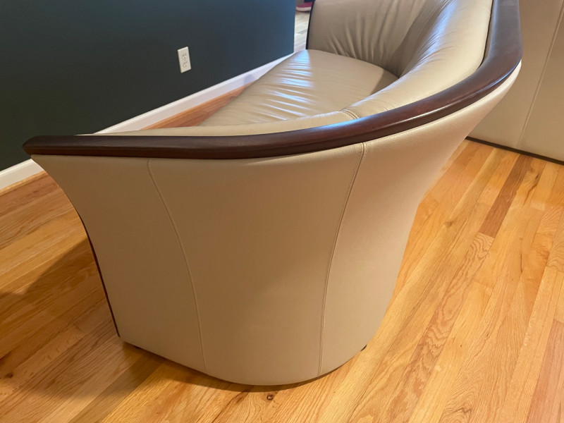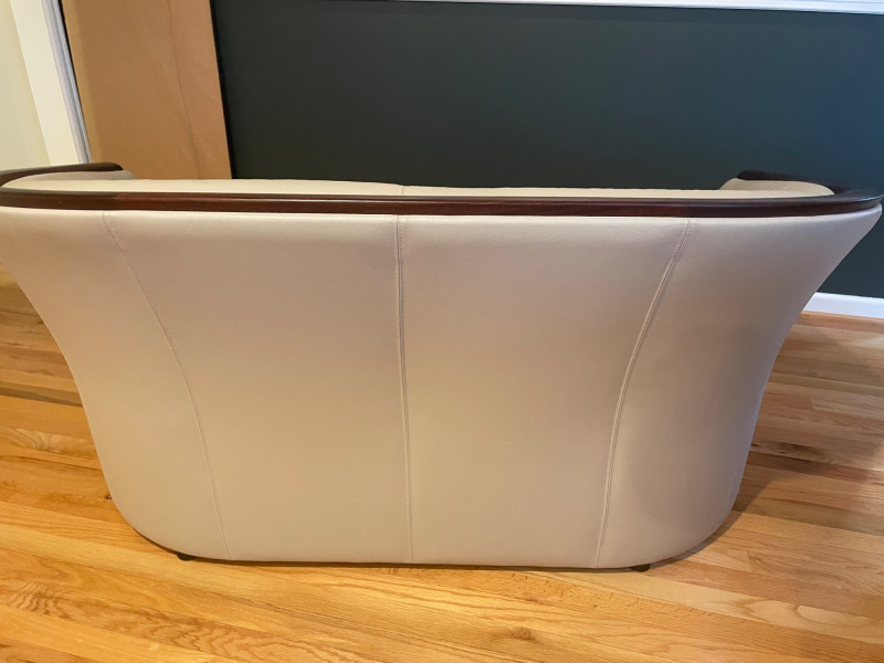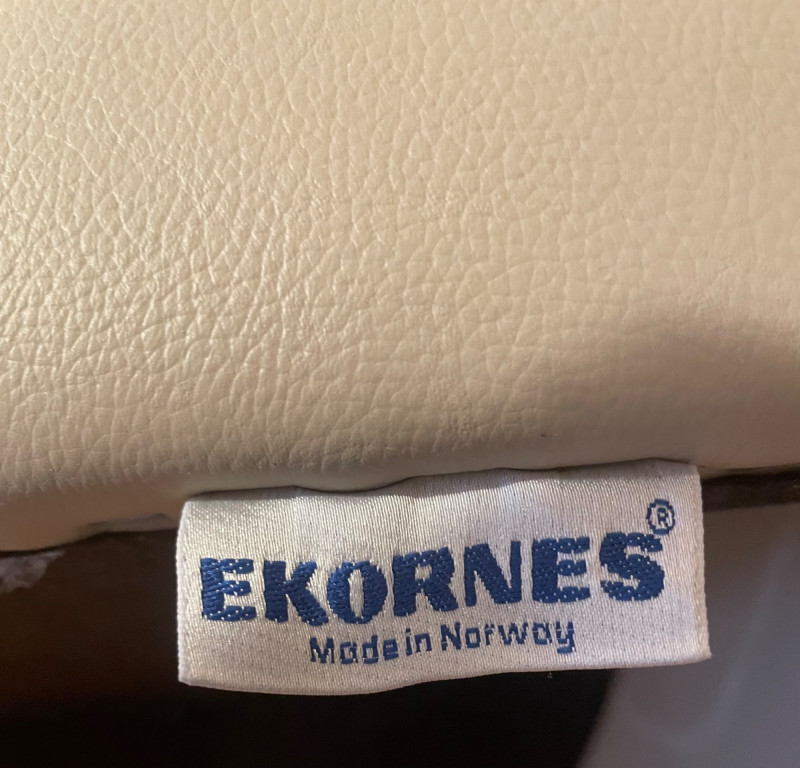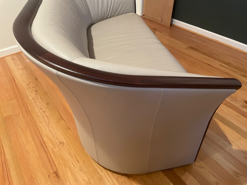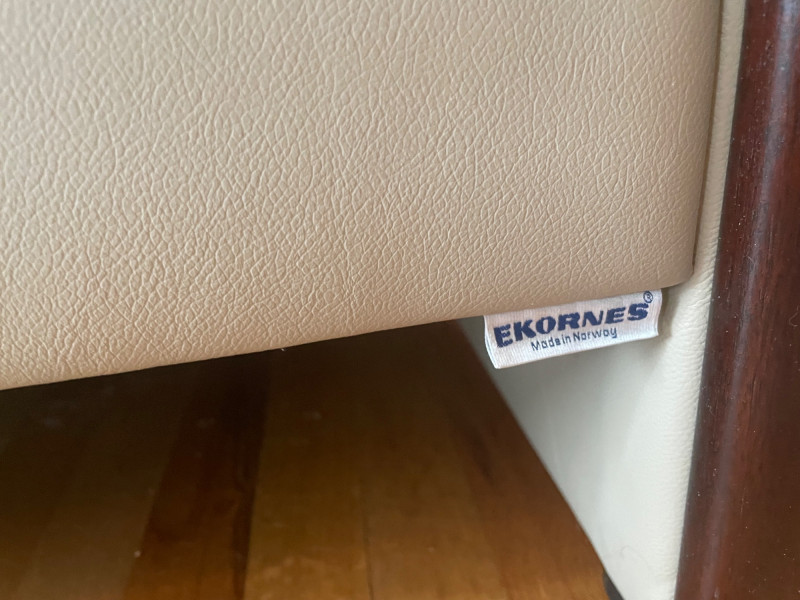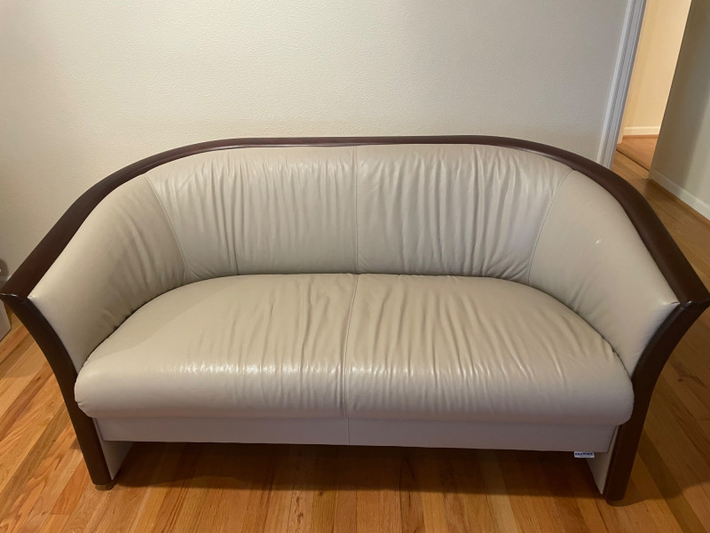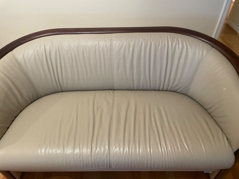 This Ekornes loveseat features smooth beige leather upholstery with natural creasing, framed by dark brown wooden armrests and trim. The curved silhouette and supportive cushions reflect the brand’s commitment to comfort and modern elegance. Made in Norway, this piece exemplifies quality materials and minimalist design. Brand: Ekornes (Norway) Materials: Leather upholstery, wood frame Color: Beige leather with dark wood accents Style: Scandinavian modern Condition: Excellent; gently used with natural patina