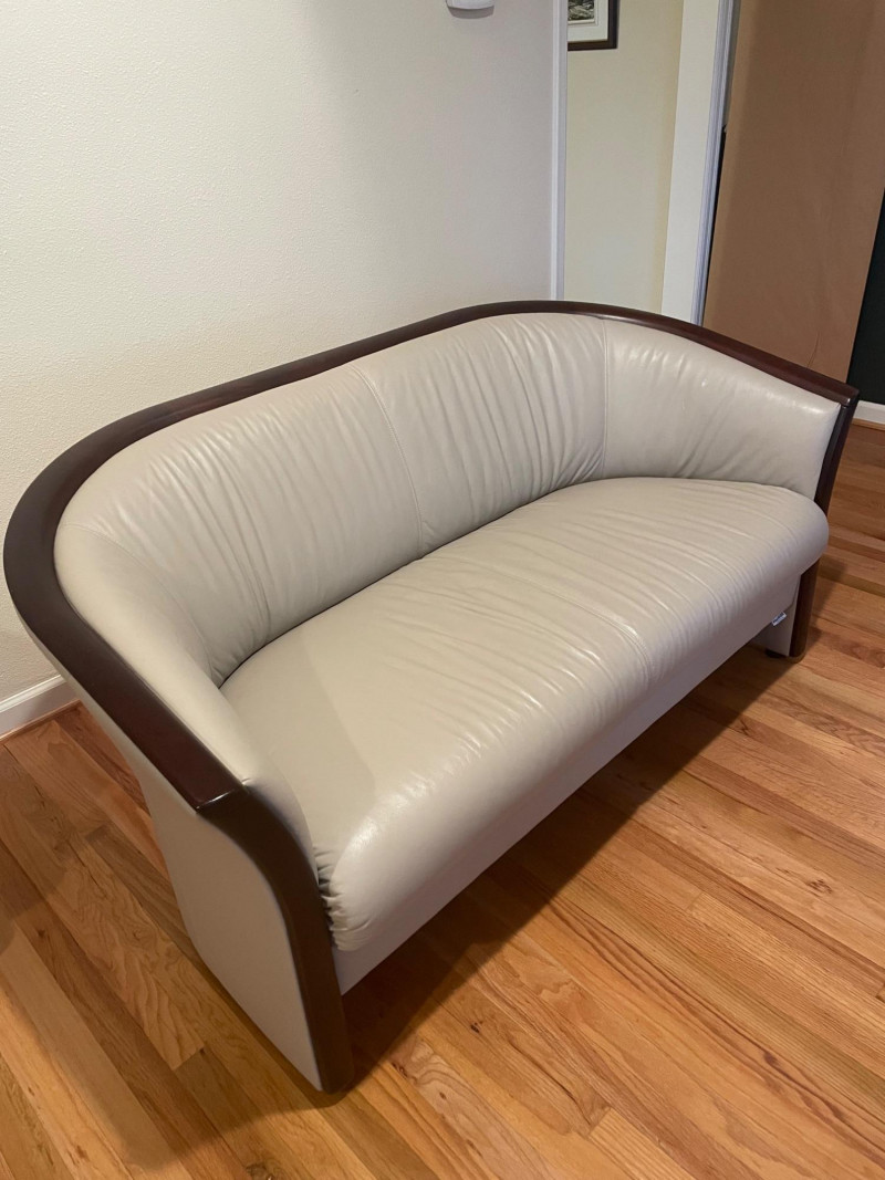 Ekornes Leather Loveseat – Made in Norway is a sleek, Scandinavian-crafted piece that blends ergonomic comfort with timeless design. Ekornes Beige Leather Loveseat with Wood Trim