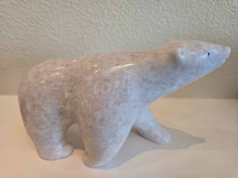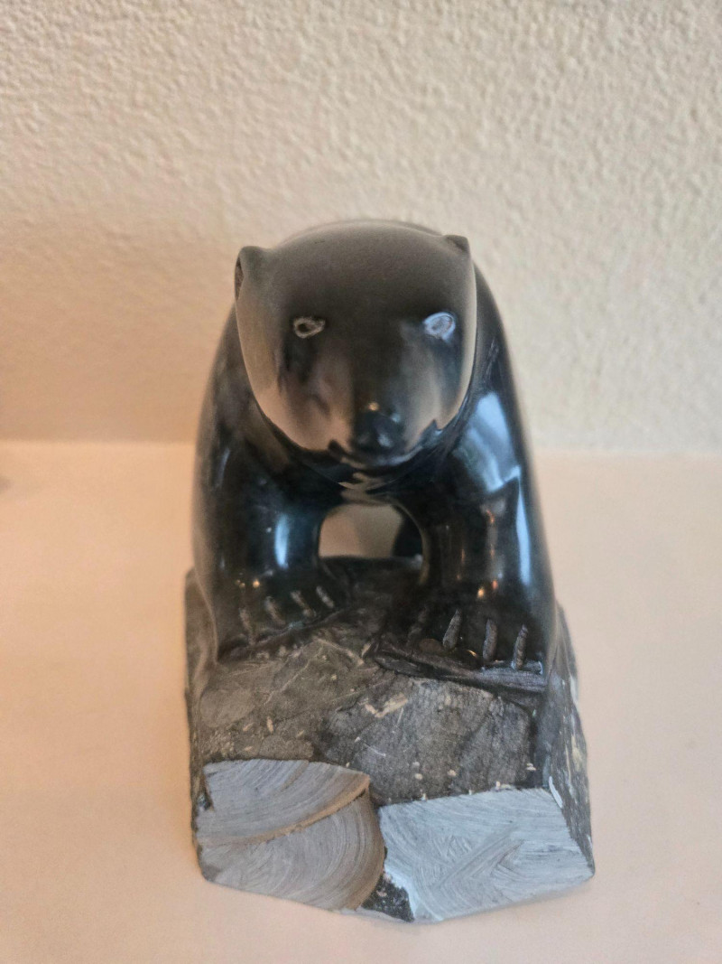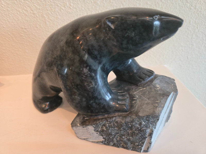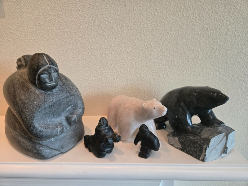 Figures Included: 1 large human figure in traditional Inuit clothing 2 polar bears: one white, one dark gray 3 smaller human figures in dark stone All pieces carved with expressive detail and cultural symbolismAlaskan Stone Art Sculptures – Inuit-Inspired Wildlife & Community Carvings