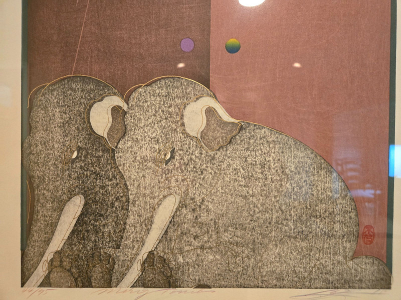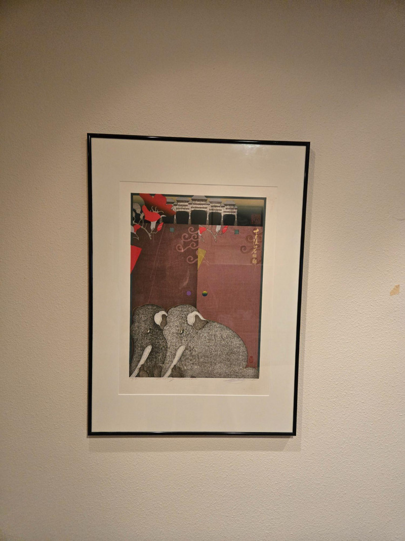 Artwork Description: Two stylized elephants with white tusks and ears, rendered in monochrome texture Background features swirling patterns, geometric shapes, and floating spheres Upper section includes East Asian temple gate motifs with floral accents Vertical script in East Asian characters adds cultural depth and intrigueCollage Artwork Featuring Two Elephants – Surrealist Composition with Asian Architectural Motifs