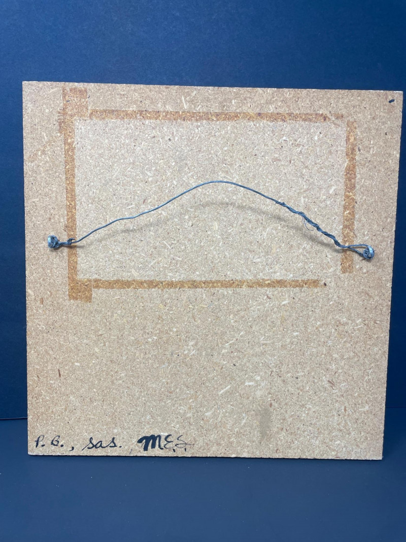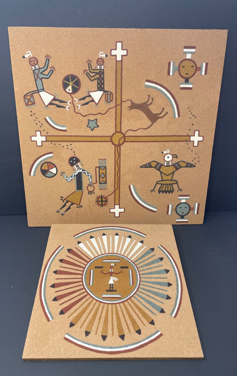 This lot includes two framed sand paintings inspired by the Navajo creation story: Top Panel: Features a central circular motif with four white directional crosses, surrounded by stylized figures, animals (including deer and eagle), and celestial symbols. The composition reflects harmony, balance, and the sacred directions central to Navajo cosmology. Bottom Panel: Displays a radiating circular design with a central human figure and arrow-like shapes in black, white, red, and blue—representing movement, energy, and the elemental forces of creation. Medium: Colored sand on board Style: Traditional Navajo ceremonial art Condition: Excellent; vibrant colors and intact framing Large Story Board: 18" x 18" Small Story Board: 12" x 12"