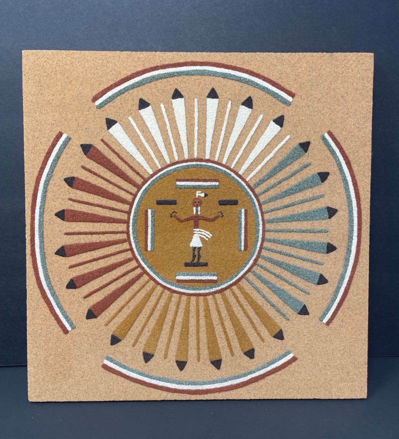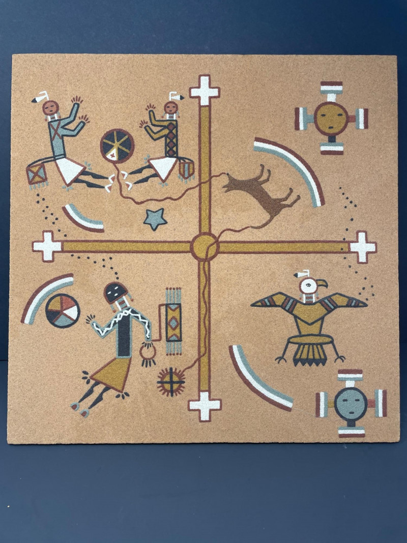 Navajo Creation Story Art is a powerful visual representation of Indigenous cosmology, rendered in the traditional medium of sand painting to honor ceremonial symbolism and storytelling. Symbolic figures, celestial motifs, and sacred geometry—evoking the spiritual journey of creation Description