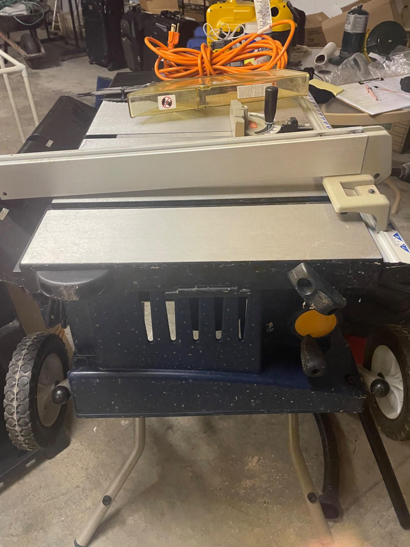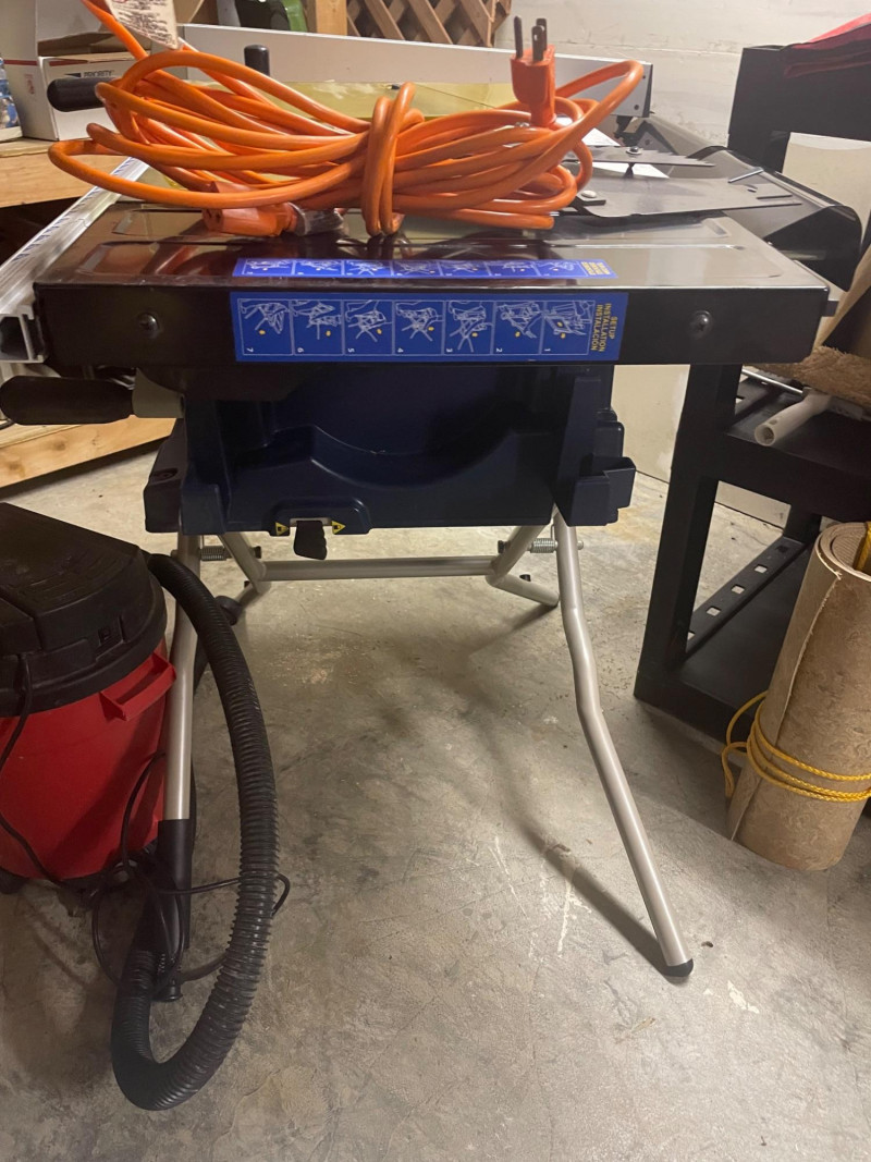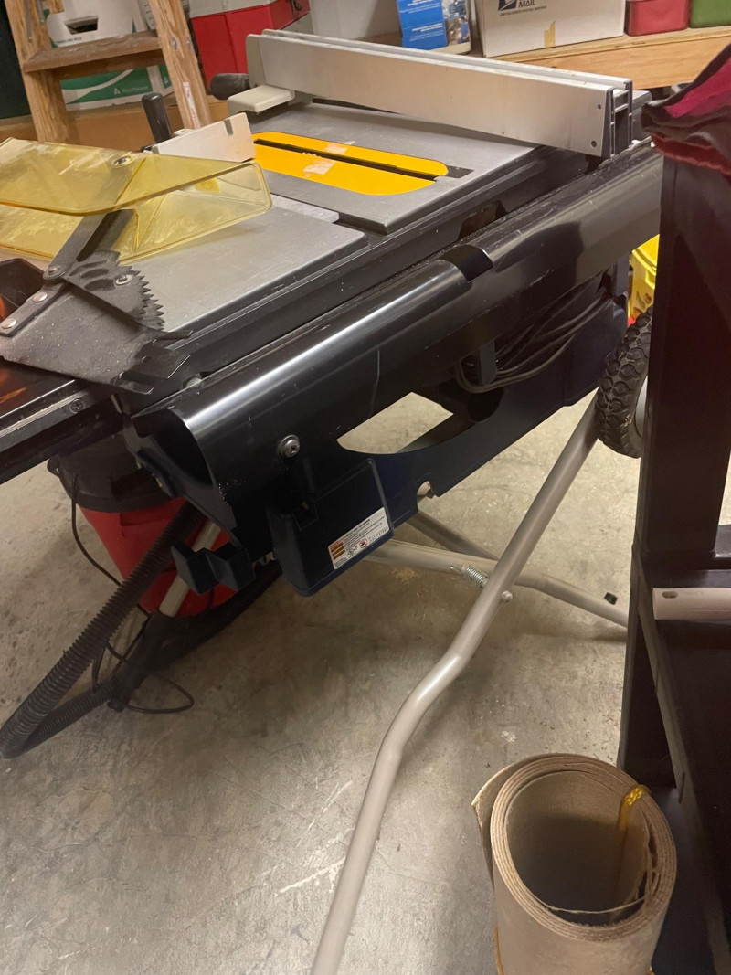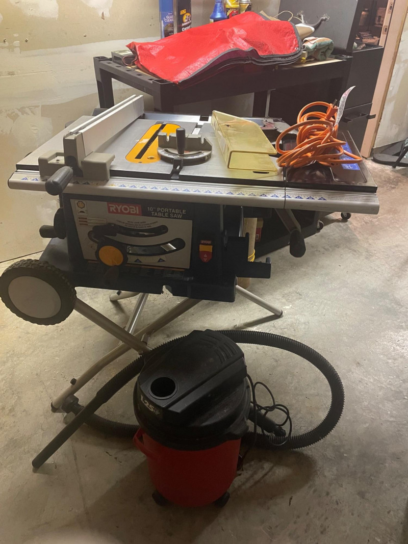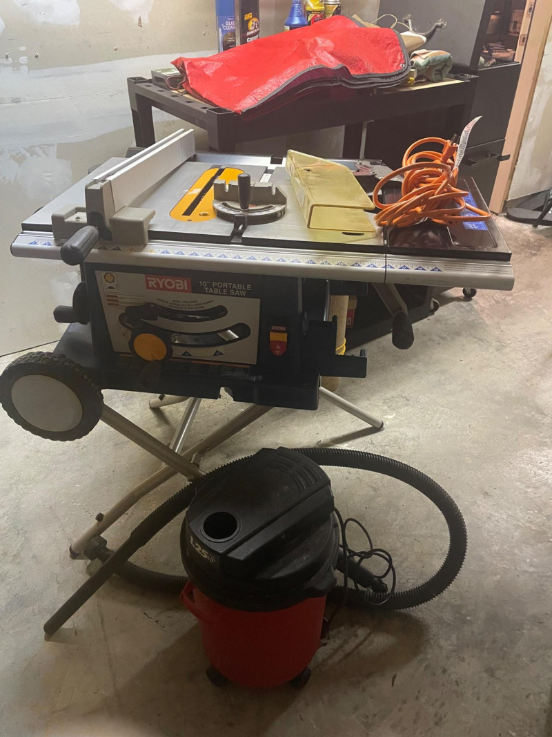 Mobile table saw with accessories plus wet/dry vacuum—ideal for DIYers, hobbyists, or garage setups Description