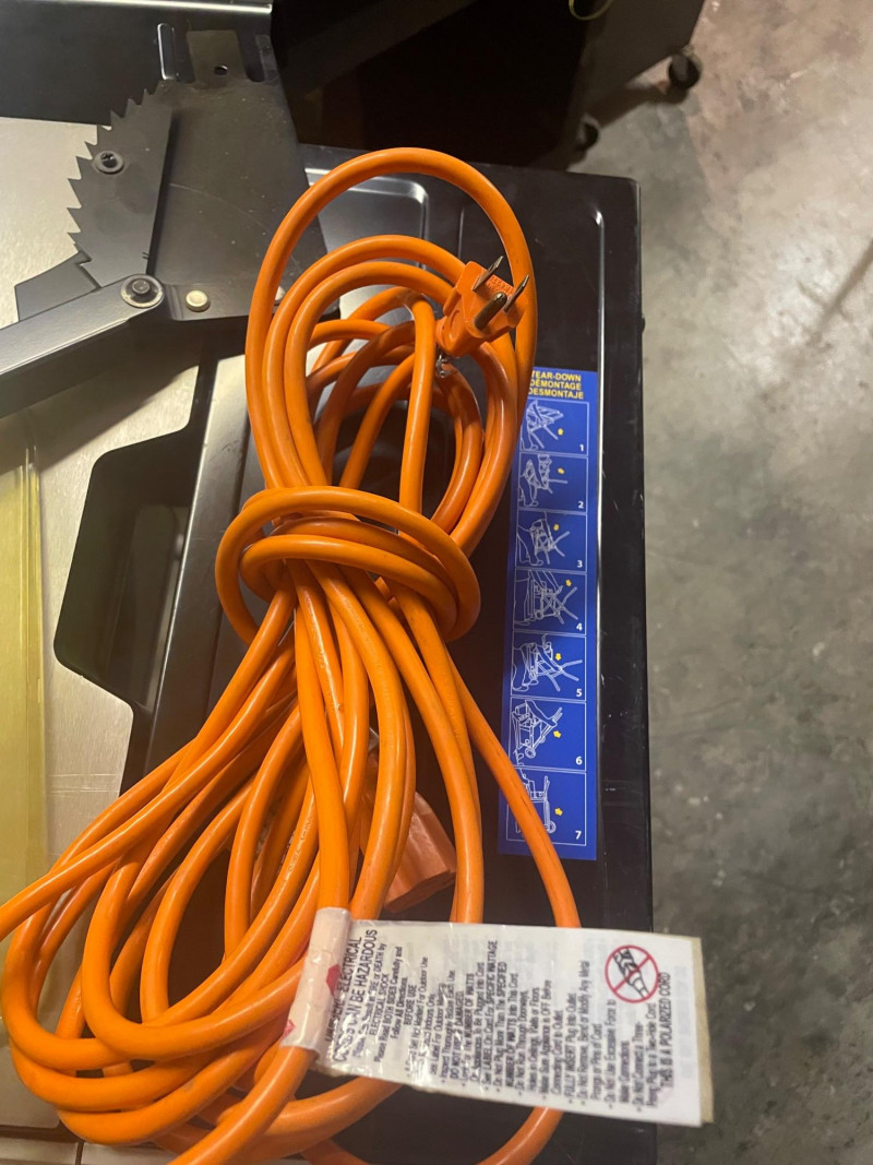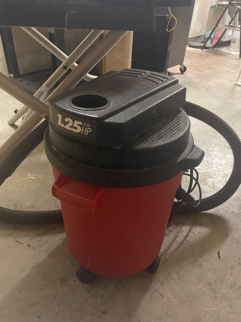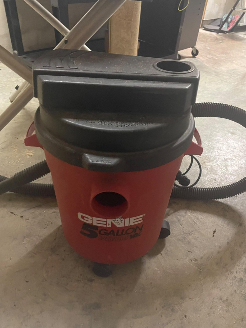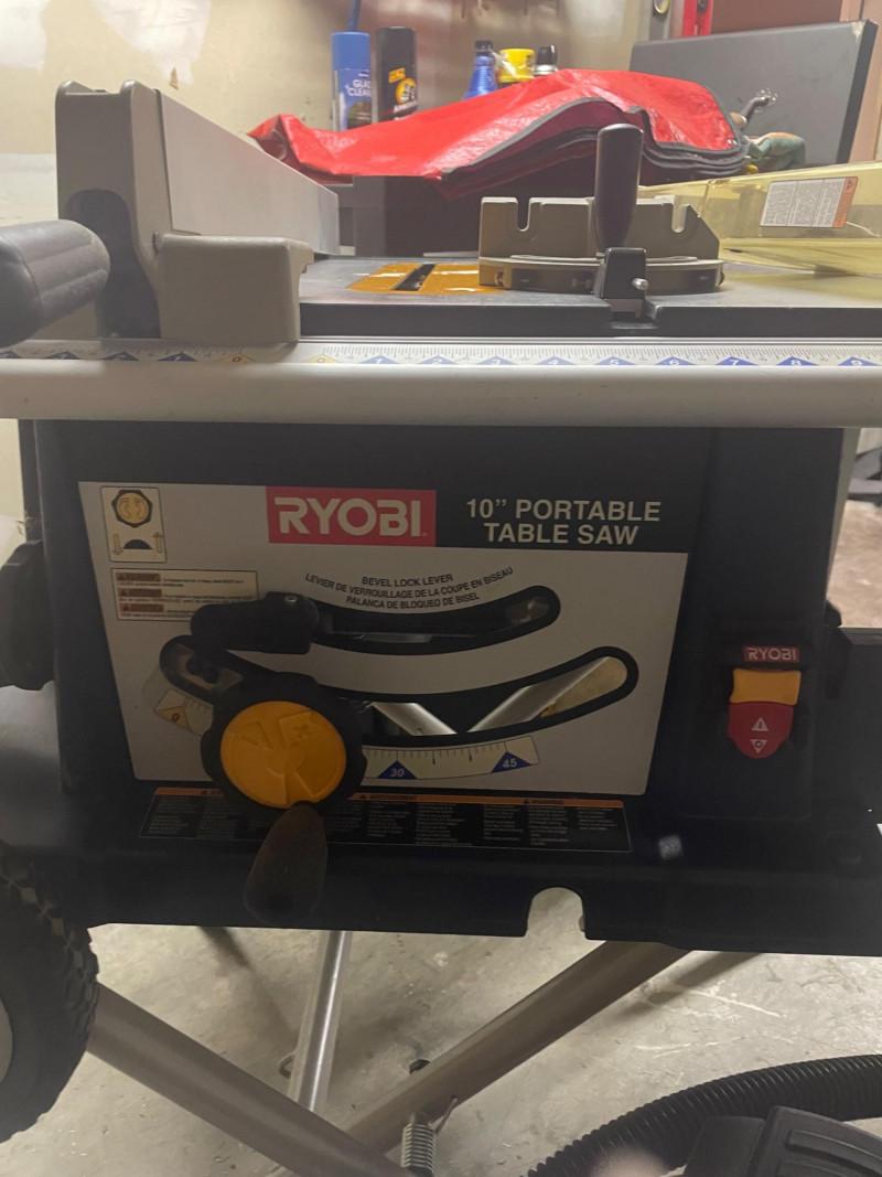 This lot includes: Ryobi 10" Portable Table Saw – Mounted on a foldable stand with wheels for easy transport. Features include: Rip fence and miter gauge Blade guard and push stick Orange extension cord included Compact design for small spaces Genie 5-Gallon Wet/Dry Shop Vac – Red and black unit with hose attachment, labeled “1.25” on top. Great for sawdust, debris, and general workshop cleanup. Condition: Excellent; clean and functional with visible accessories